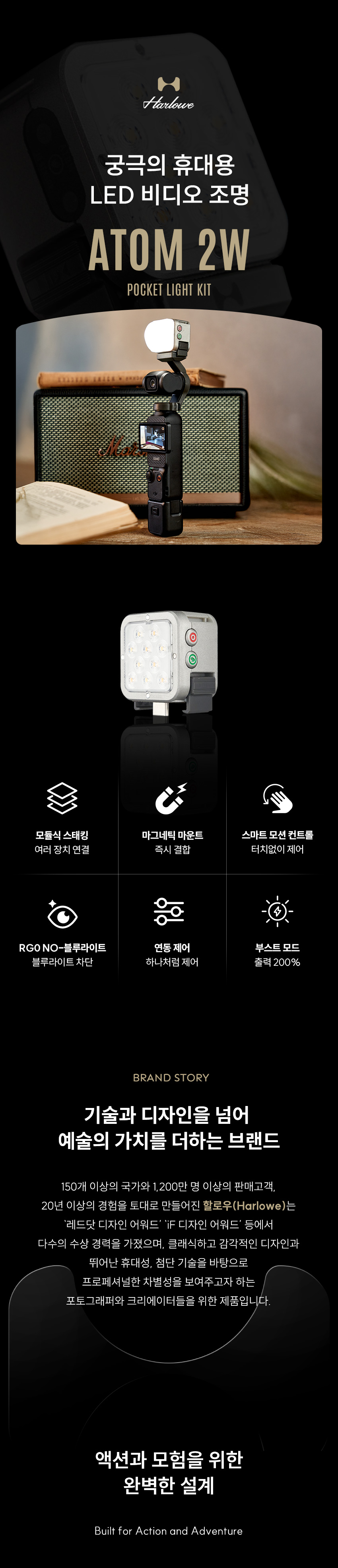 "작지만 강력한 조명, Harlowe Atom 2 크리에이터를 위한 진짜 휴대용 조명" 요즘 소소한 영상 촬영이나 사진 작업을 자주 하다 보니, 작은 조명 하나가 작업 효율을 얼마나 크게 바꿔주는지 새삼 느끼게 됩니다. 오늘 소개해 드릴 제품은 크리에이터를 위해 설계된 초소형 LED 비디오 조명 Harlowe(할로우) Atom2 Universal Creator Kit입니다. 세기몰에서 새롭게 출시된 제품이고, 전용마운트 어댑터를 통해 DJI 오즈모 포켓3 / 액션캠 등 다양한 디바이스에 호환되어 그동안 저조도에서 불만족스러웠던 퀄리티를 한층 쉽게 끌어올릴 수 있는 초소형 지속광 조명입니다. 현재 할로우 ATOM 2 론칭 이벤트로 기간 내 제품을 구매 후 상품평 작성 시 세기몰 포인트 무려 10배 추가 적립되는 혜택도 있으니, 놓치지 마세요. 언박싱&스펙 할로우는 세기피앤씨가 공식 유통하는 브랜드로, 제품 완성도와 사후 지원 측면에서 신뢰할 수 있습니다. 촬영 장비는 A/S도 중요하