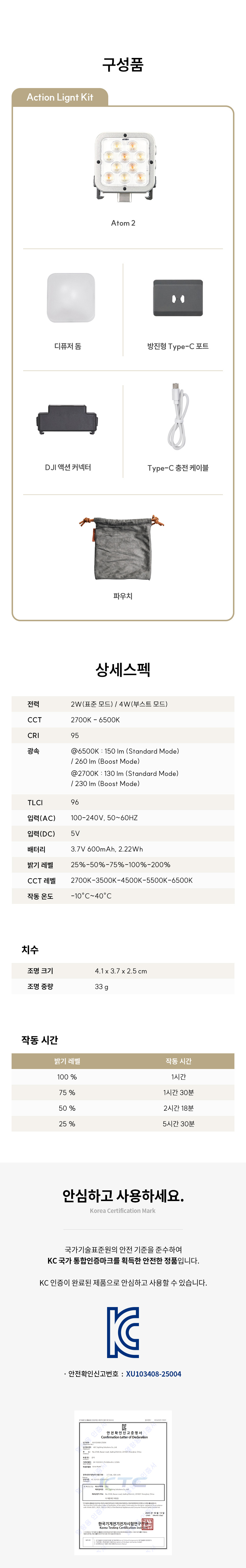 개인 방송과 개인 일상을 기록하는 일이 이젠 특별한 일이 아닌 보편적인 일이 되었어요. 카메라 및 액션캠과 핸드폰 촬영 시 영상의 질을 높여주는 휴대성 좋은 조명 소개해 드릴게요! [LIST] 1. 할로우 아톰 2 스팩 2. 유니버셜 크리에이터 키트 3. 상세 사진 및 사용 방법 4. 사용 후기 1. 할로우 아톰 2 스펙 이번에 제가 소개해 드릴 제품은 할로우(Harlowe)에서 나온 제품 아톰 2(Atom 2)입니다. 할로우는 이미 촬영 조명으로 유명한 브랜드예요. 콤팩트한 사이즈로 휴대성 좋게 만들어진 제품이 아톰 2랍니다. 작지만 캠핑 조명 못지않게 강력한 밝기를 가진 아톰 2 스펙에 대해 먼저 알아볼게요. 아톰 2 스펙 구분 내용 비고 CCT(색온도) 2700k - 3500k - 4500k - 5500k - 6500k 2700k - 6500k 밝기 레벨 25% - 50% - 75% - 100% - 200% 200% : 부스터 모드 30초간 유지 광속 Standard mode