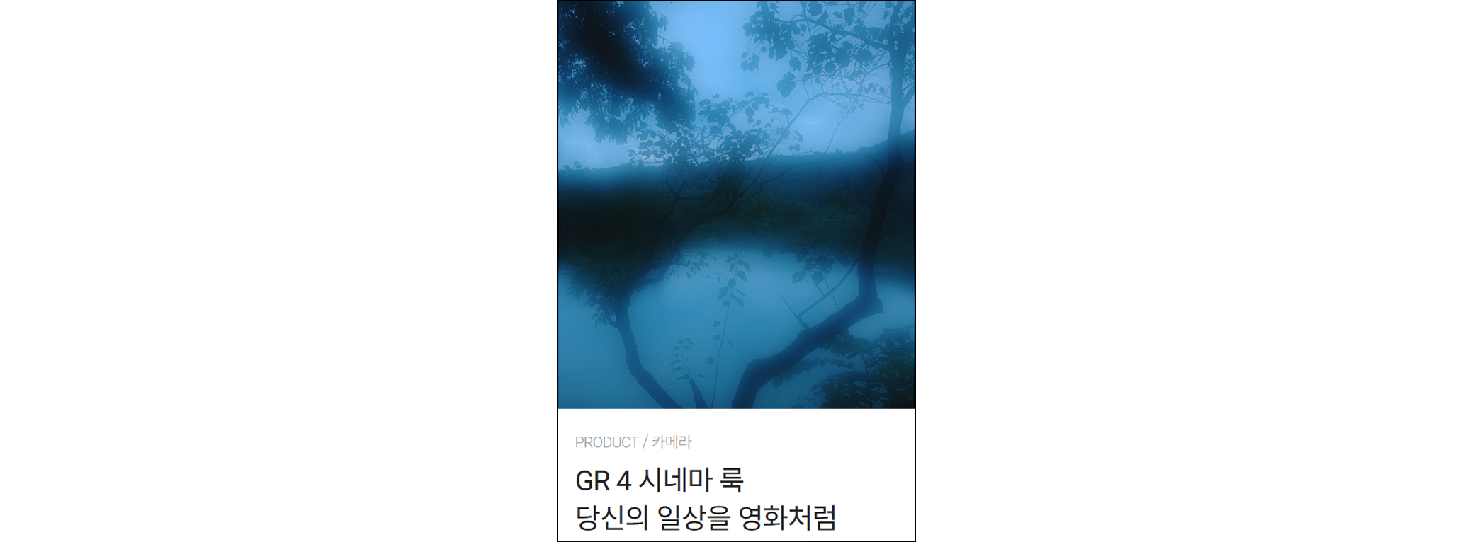 세 번째, 시네마 색감이 추가됐다. 누구나 영화의 한 장면을 연상케 하는 사진을 찍을 수 있다. 아니 누구나 사진을 영화의 한 장면으로 만들 수 있다. 후보정을 통해서. 하지만 GR Ⅳ만 있으면 후보정 따윈 필요 없이 필터 하나로 시네마틱한 분위기의 사진을 담을 수 있다.