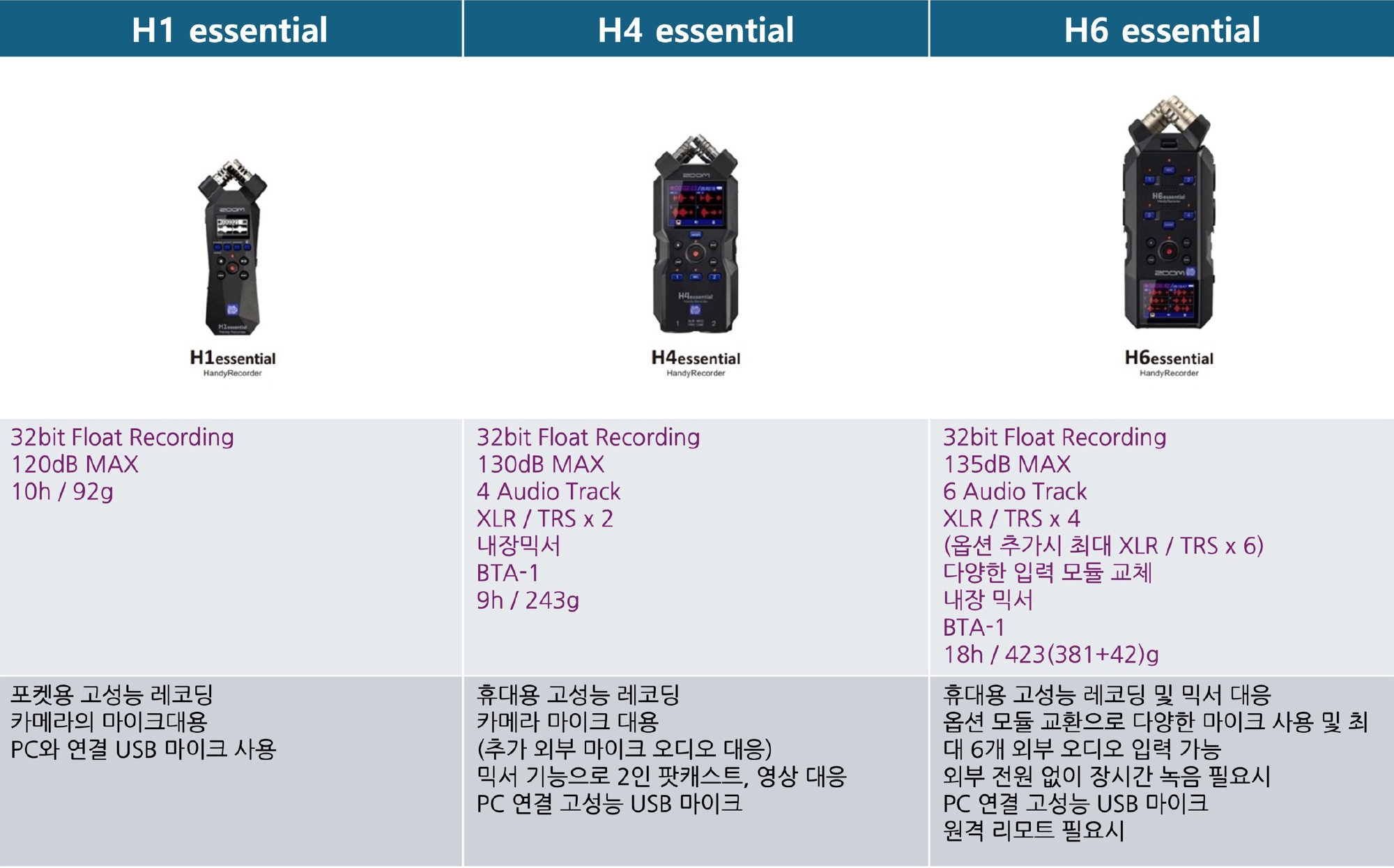 ZOOM H essential 시리즈 공통 특징 및 스펙 비교