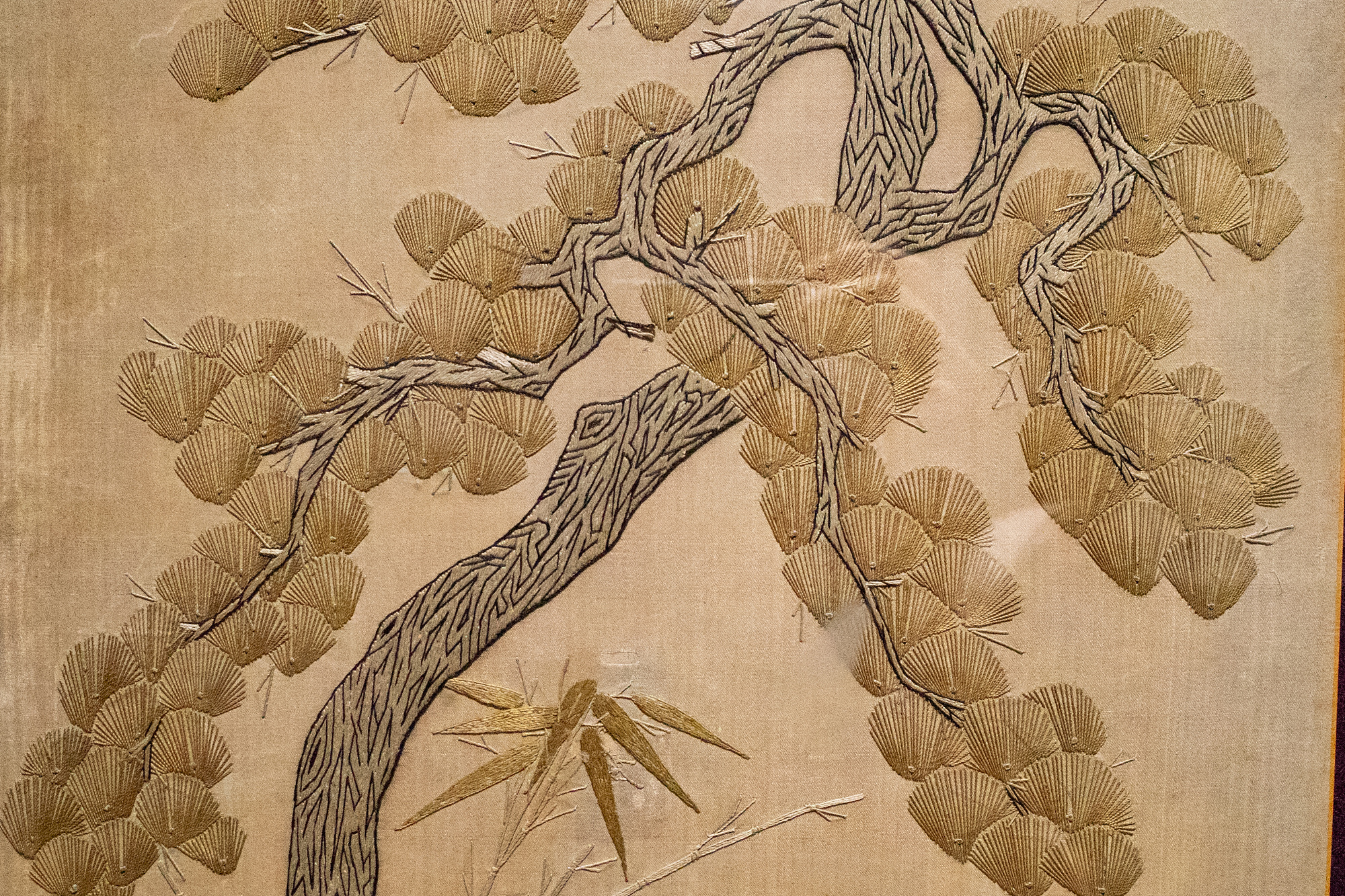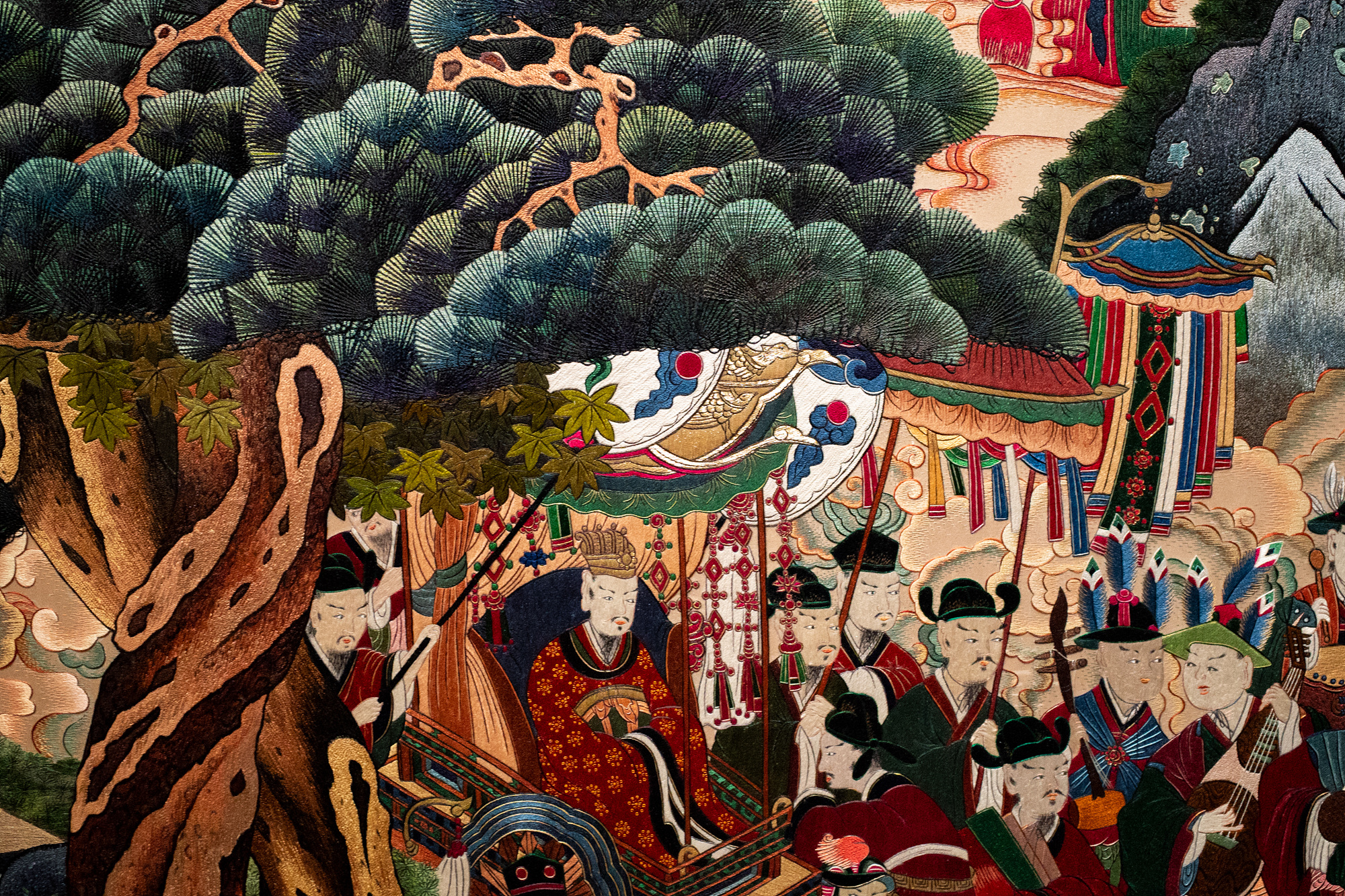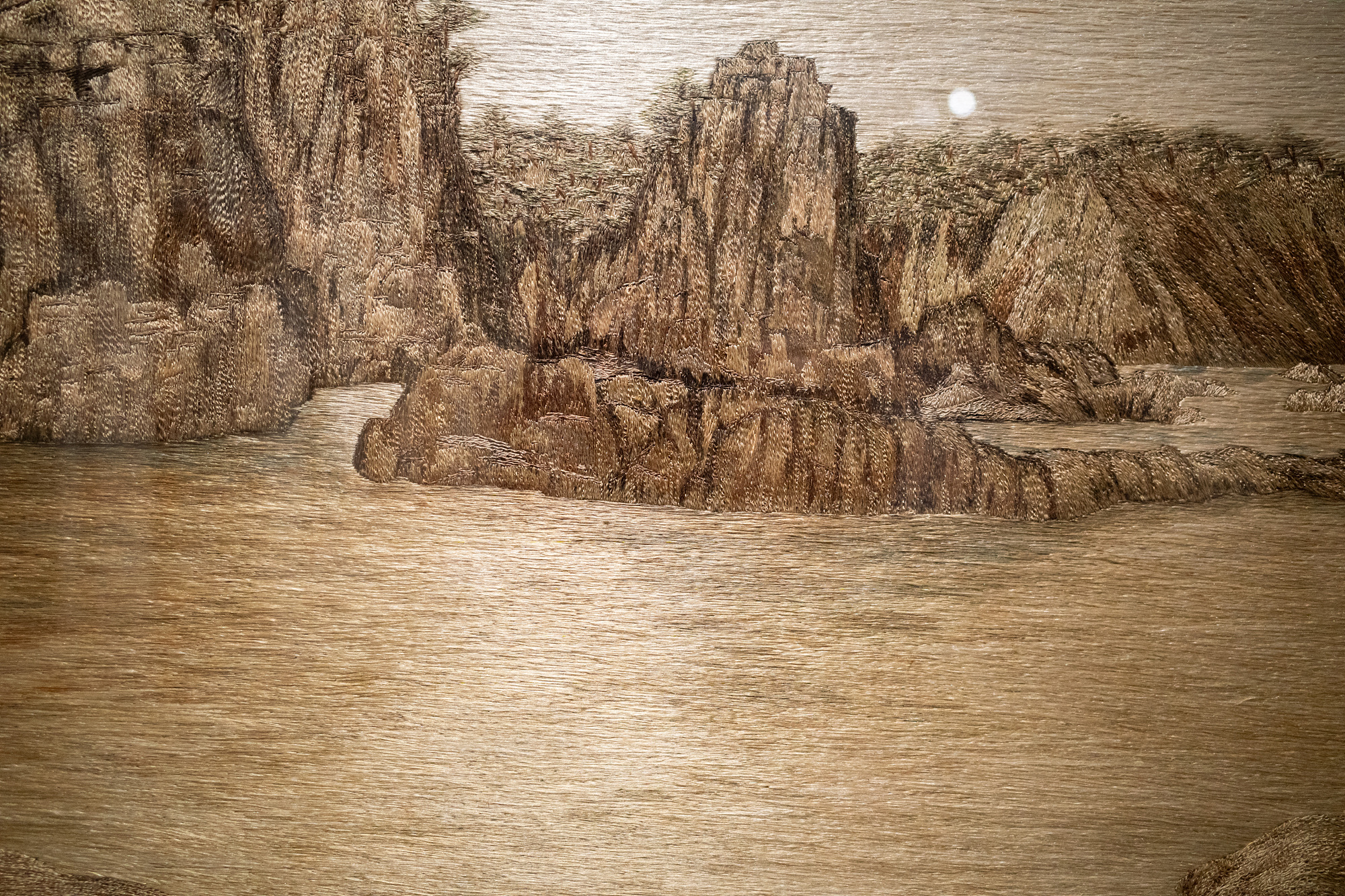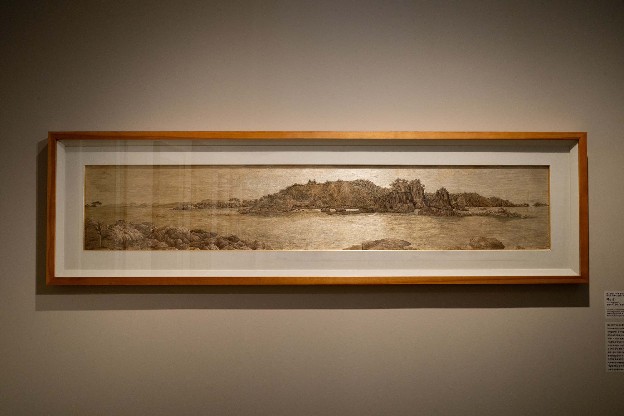 이처럼 자수가 회화와 밀접한 관계에 있었다는 것은 작품을 통해서도 고스란히 드러나는데요. 나사균 <해금강>, 진명자 <성모>, 대구 공립여고보생 공동 제작 <해금강> 등 그림인지 자수인지 확인하려면 유심히 들여다봐야 하는 작품이 꽤 많았습니다. 굽이치는 물길, 뭉게뭉게 피어오른 구름, 부드러운 새의 깃털, 햇빛에 반사된 수면 위 윤슬까지 표현한 전문가들의 솜씨가 정교해요.