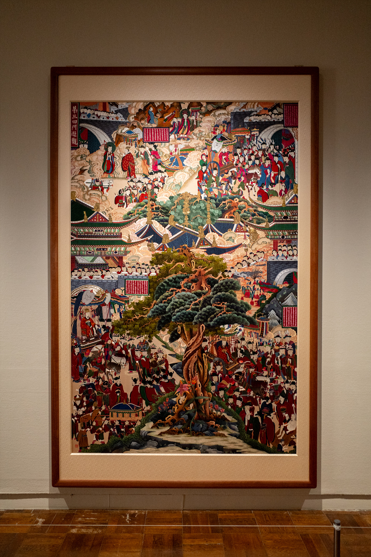 이 파트에서 단연 돋보이는 작품은 전시의 대미를 장식하는 최유현 <팔상도>입니다. 벽면을 가득 채울 정도로 거대한 8점의 <팔상도>는 그림이라고 해도 놀라울 텐데 자수입니다. 색색의 실은 사람이 되기도, 구름이 되기도, 산수가 되기도 합니다. 이 작품은 공간에 마련된 의자에 앉아 하나하나 봐야 그 압도적인 스케일을 느낄 수 있습니다. 마치 작품이 저에게로 쏟아지는 것 같거든요.