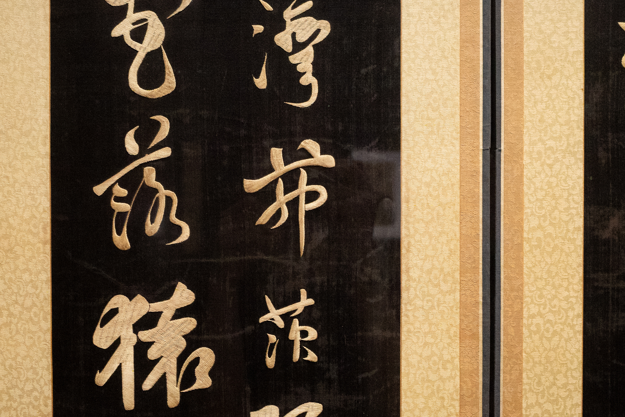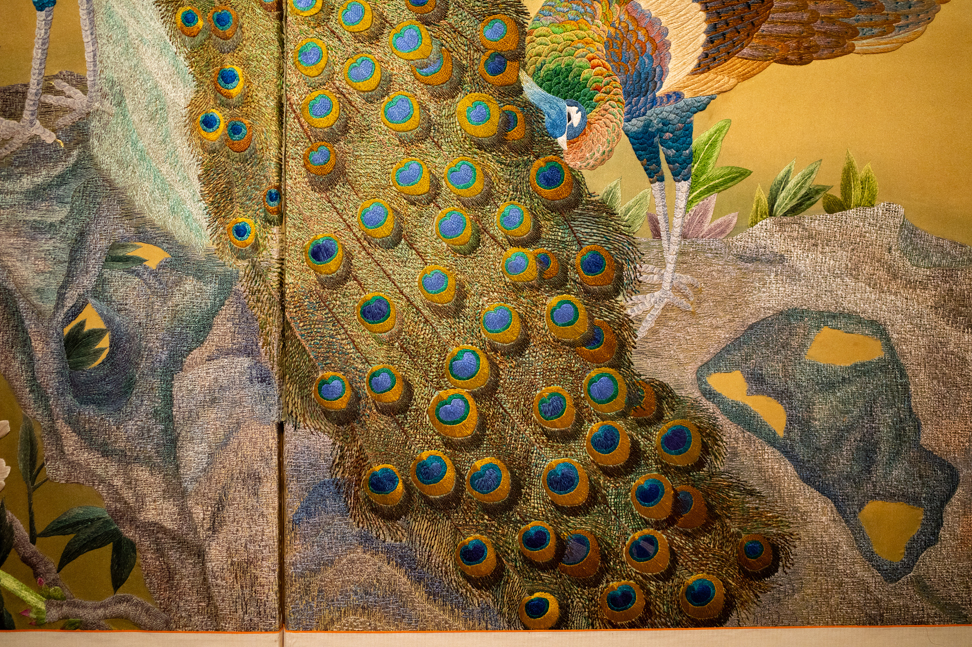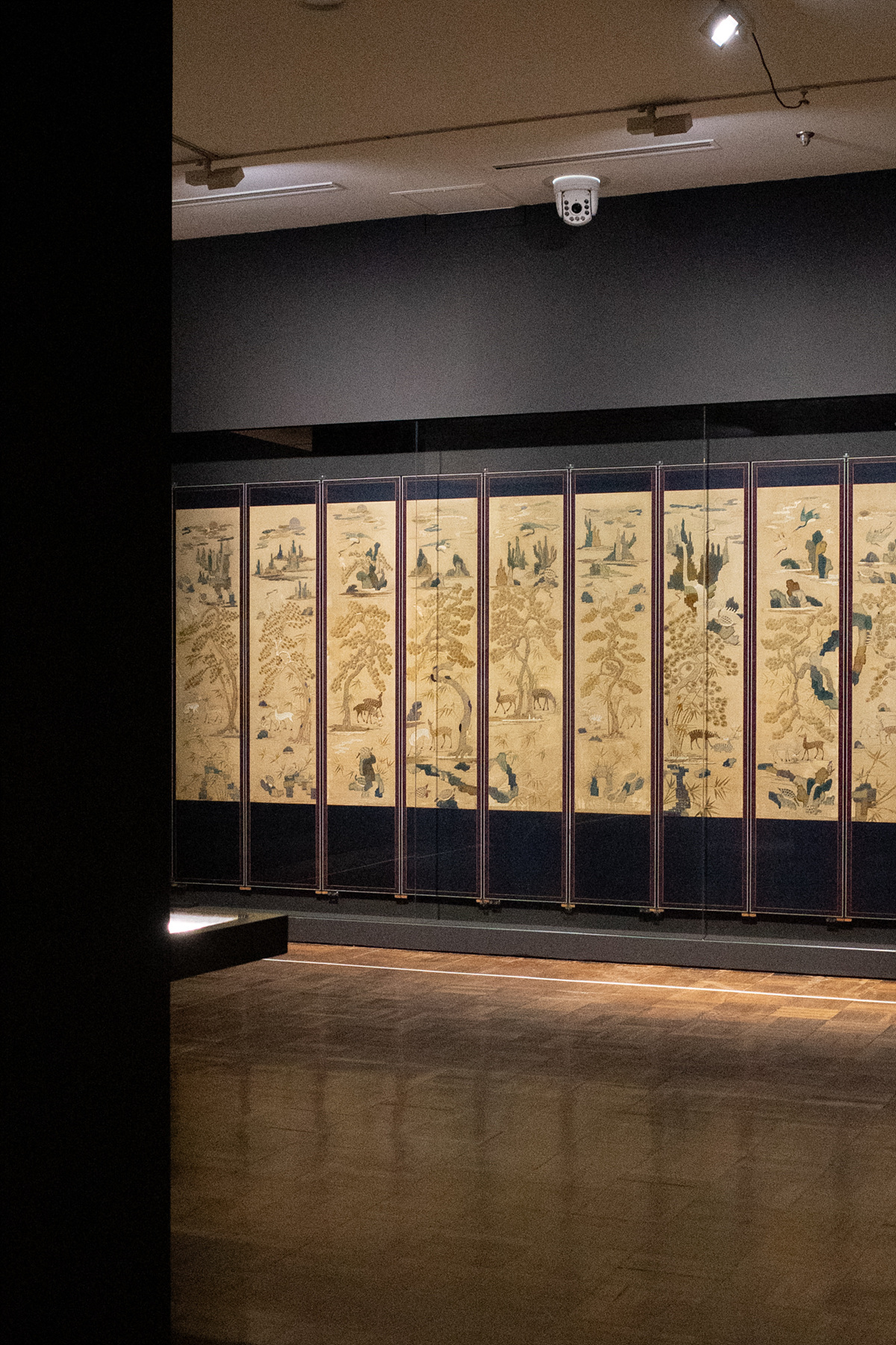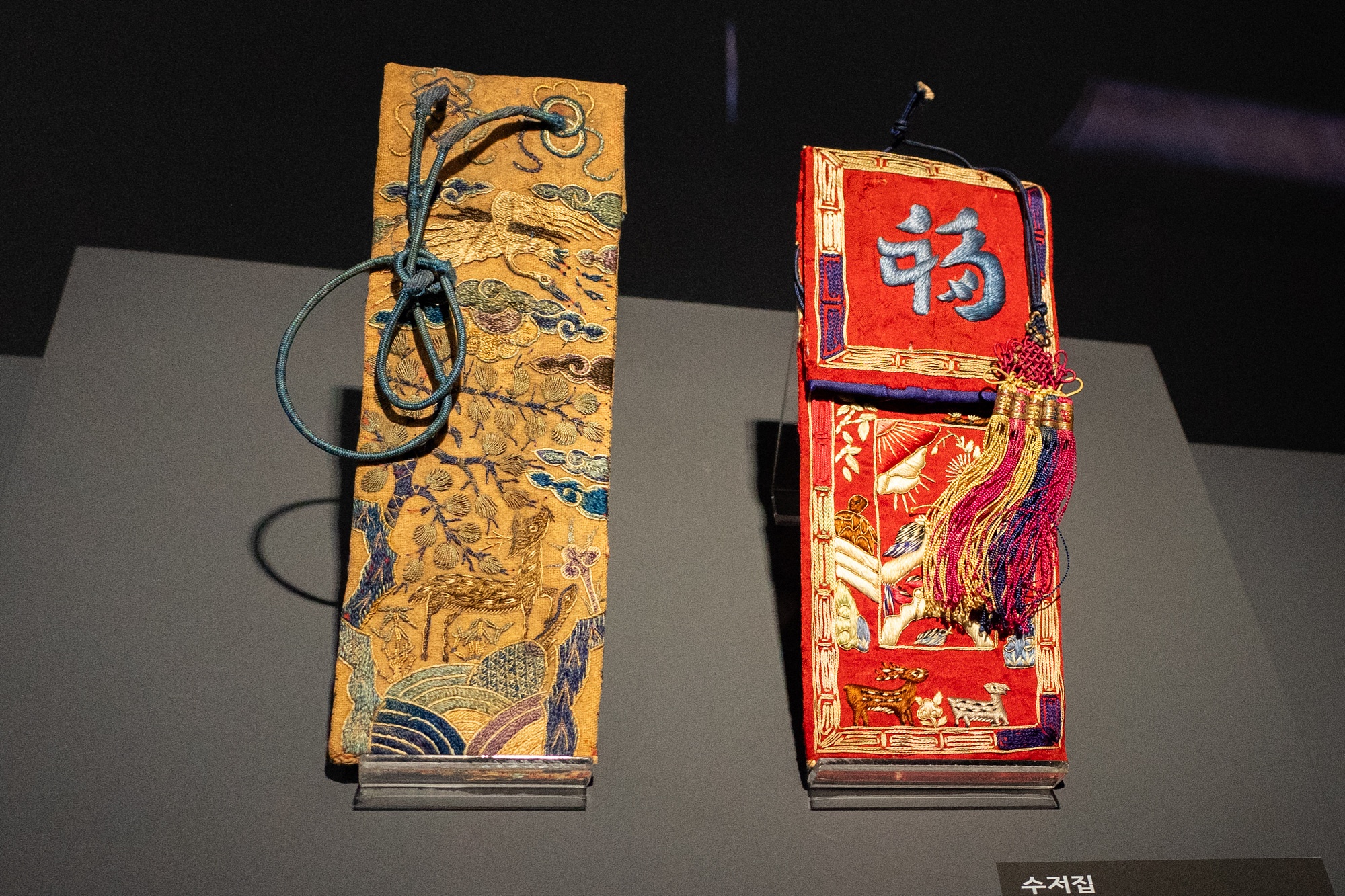 파트 1에서 단연 돋보이는 건 감상 자수(병풍 자수)입니다. 자수가 감상의 대상으로 본격화된 조선 후기, 자수 병풍은 조형성이 충분히 발휘될 수 있는 영역이었고 회화에 채택된 소재들을 병풍에서도 등장했다고 하죠. 산수, 십장생도 등 회화에서 볼 수 있었던 그림들이 자수로 탄생을 달리해 은은한 핀 조명 아래에서 존재감을 드러내요. 오래된 작품들이다 보니 실 색이 주변으로 번져있기도 했지만 몇 백 년의 시간을 거쳐왔음에도 여전히 화려하고 입체감이 도드라집니다.
