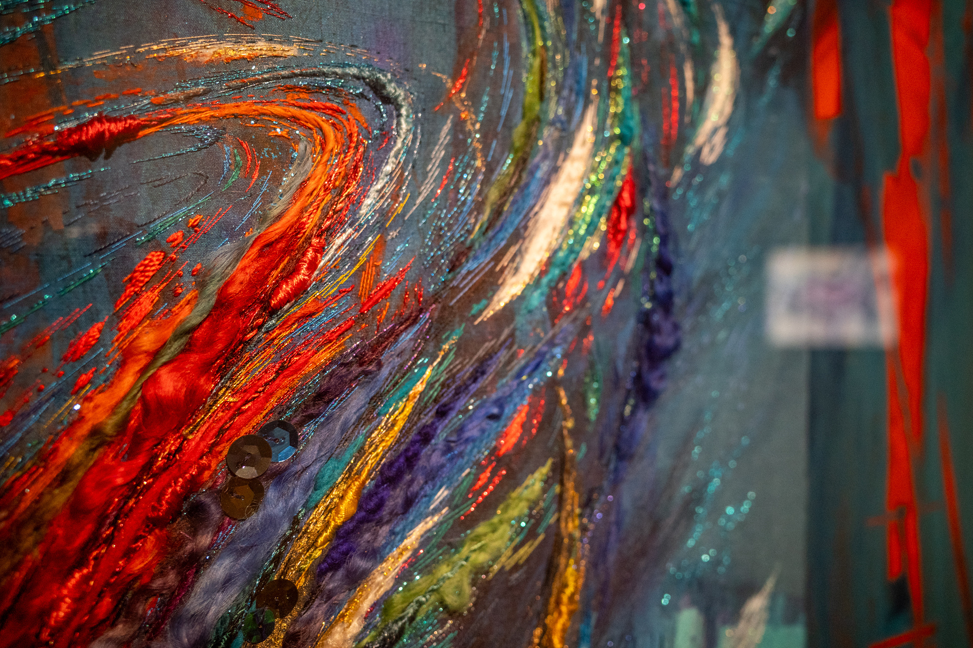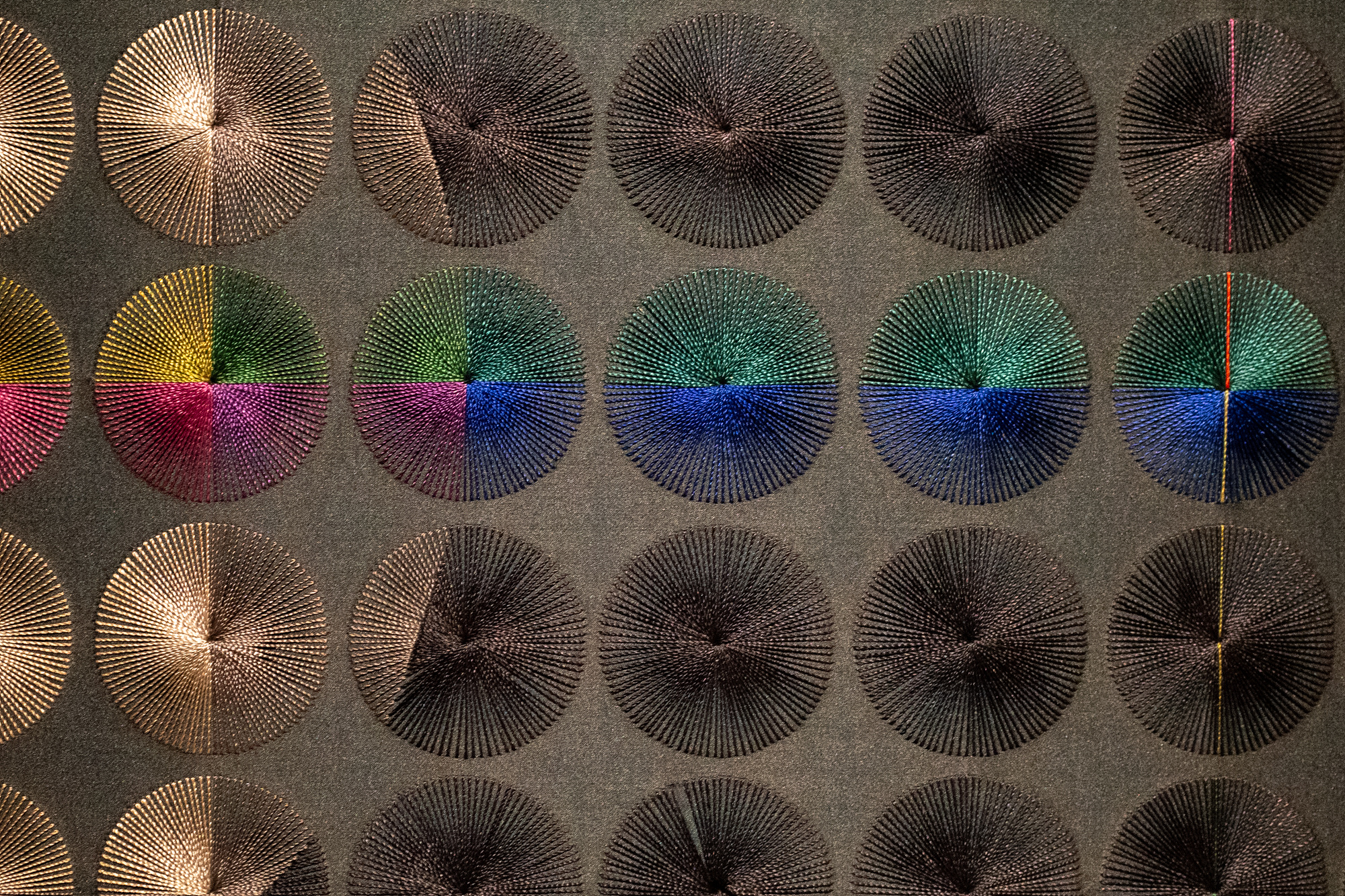지금껏 봤던 자수는 대개 질서정연했습니다. 파트 2에서 이미 보고 왔듯이 그림이라고 착각할 만큼 부드럽고 실과 실 사이가 촘촘해 마치 하나의 두꺼운 실처럼 보일 정도로 연속성을 지닙니다. 하지만 기하학적 무늬를 그린 자수는 거침없이 경계를 넘나들고 표현의 한계도 없습니다. 뿐만 아니라 캔버스 위에 물감과 자수가 함께 놓여 화려한 색채를 자랑하는 작품도 있었고요. 자수가 작가에 따라 수십, 수백, 수만 가지의 방법으로 확장되면서 자수를 보는 제 시야도 따라서 확장됩니다.