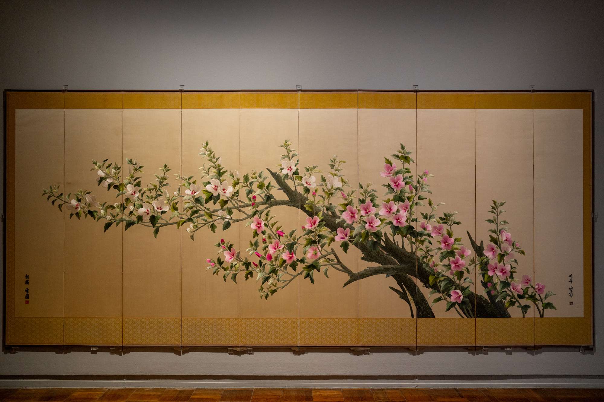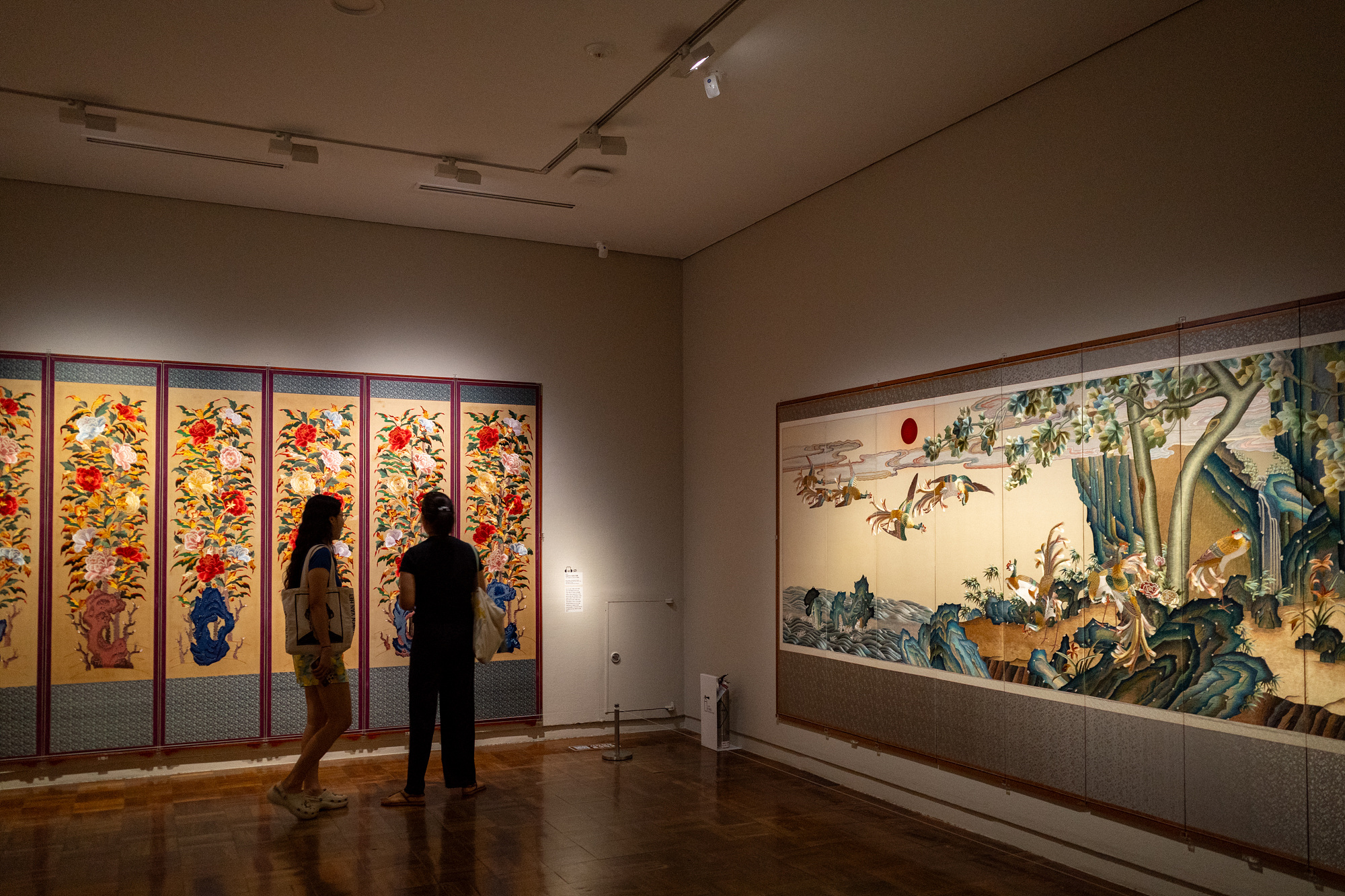 (왼) <궁중자수 모란도 병풍>(한상수, 1978) / (오) <궁중자수 봉황도 병풍>(한상수, 1994)