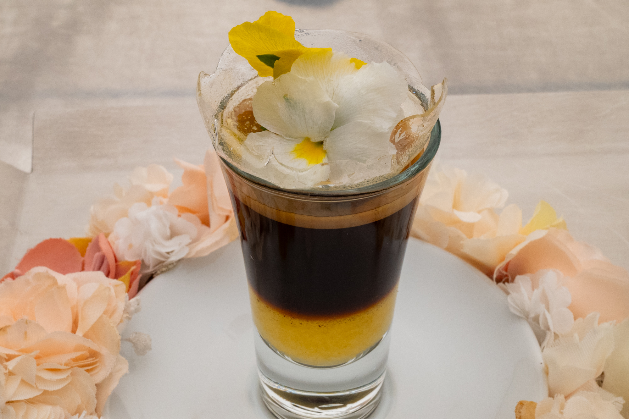 첫 번째 커피는 향에 먼저 집중한 뒤 맛을 음미하면 좋은 메뉴였습니다. 글라스 안에 토치 같은 장비로 연기를 낸 다음 바로 음료 위를 덮어요. '달콤한 꽃향기가 가득한 정원으로 초대한다'라는 설명처럼 장미 향이 가둬진 글라스를 걷어내면 응축되어 있던 장미 향이 퍼지는데 커피를 마시기 전부터 기분이 이완되고 좋아집니다. 참, 마시기 전에 가니시처럼 올라가 있는 꽃과 굳힌 설탕을 걷어내달라고 요청하면 돼요. 직접 떼어내기엔 굳힌 설탕이 꽤 끈적거리거든요.