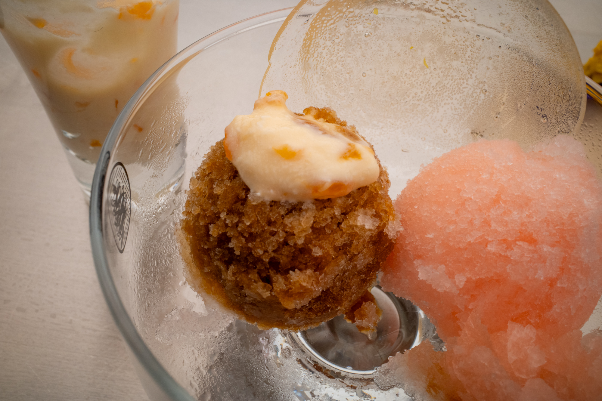 파인애플 퓌레-산미 있는 에스프레소-오렌지 그라니따가 층층이 쌓인 두 번째 메뉴는 섞어서 먹기보단 아래부터 떠먹듯 먹는 것이 포인트. 파인애플 과육이 도독도독 씹혀요. 파인애플 퓌레 맛이 꽤 강해서 에스프레소가 조금 추가된 파인애플 슬러시를 먹는 기분이었지만 여름이랑 잘 어울리는 메뉴였습니다. 콘셉트가 휴양지 해변이라고 하는데 디자인도, 맛도 딱 휴양지 해변이에요.