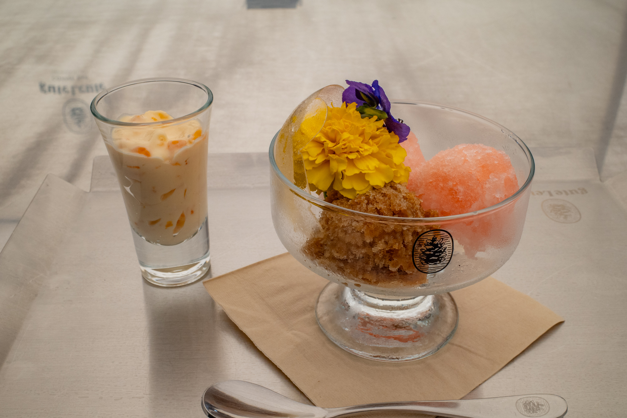 수박 셔벗과 커피 셔벗+복숭아 크림, 두 가지 셔벗을 즐길 수 있는 세 번째 메뉴. 수박 셔벗을 먹은 뒤에 커피 셔벗을 복숭아 크림과 섞어 먹으라고 순서를 알려주셔서 수박 셔벗 먼저 한 입 했습니다.