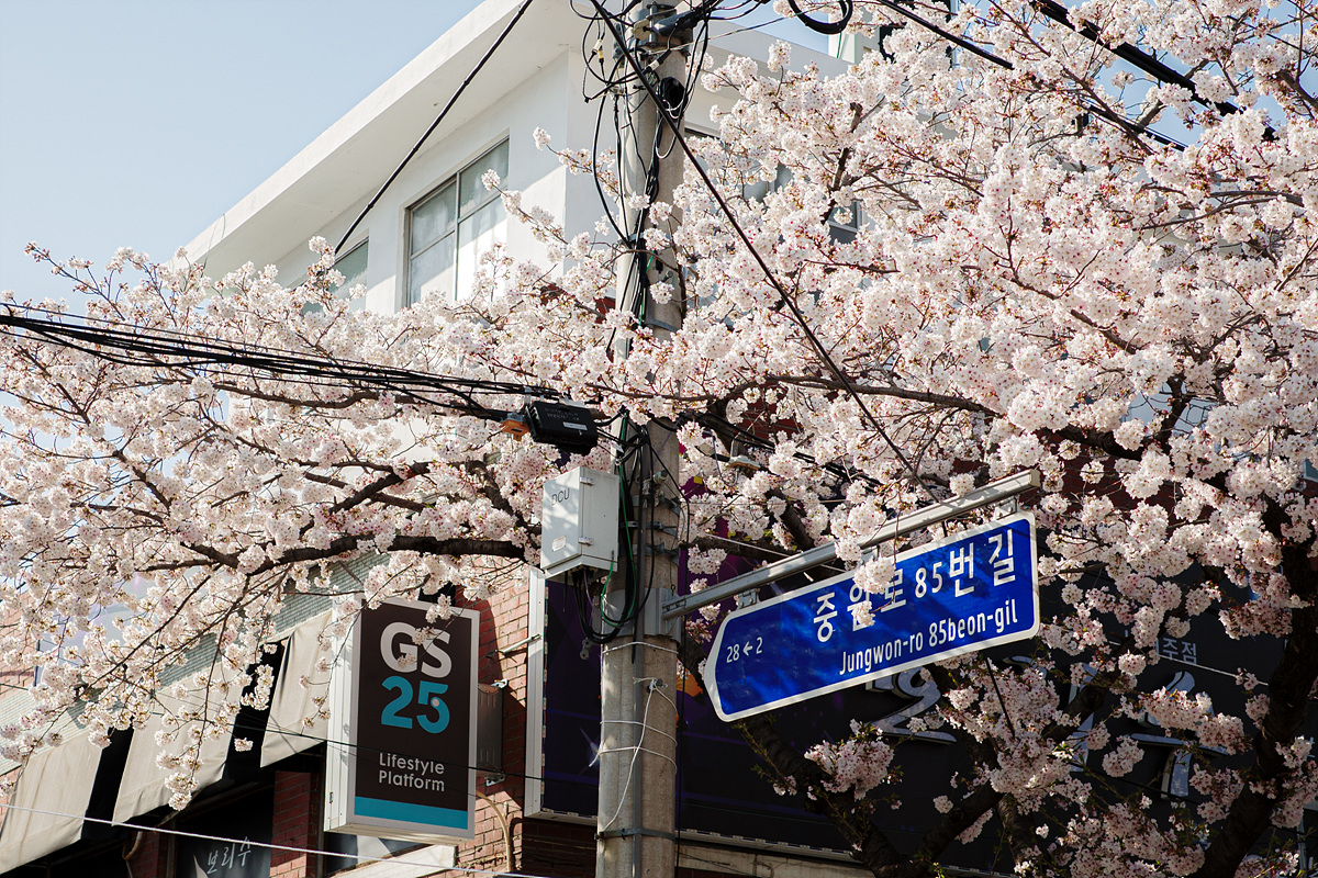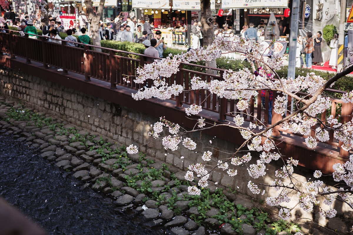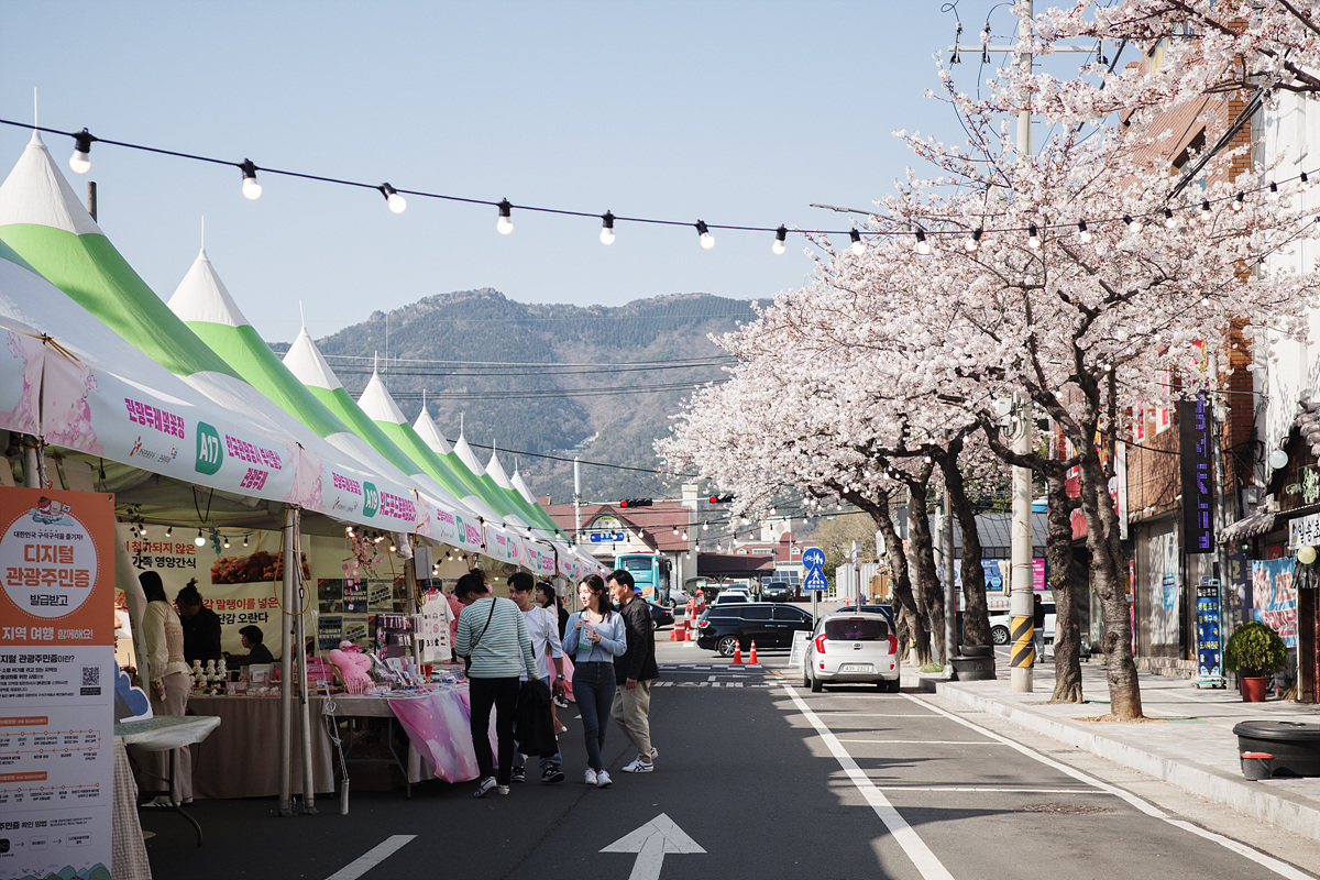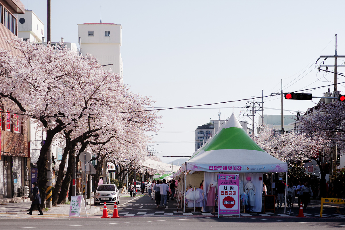 중앙시장을 향하다가 벚나무에 홀려 지도와 다른 길로 가고 있었는데, 건너편에서 벚꽃장을 진행하고 있었습니다. 축제를 제대로 즐길 수 있는 한복 대여부터 벚꽃 내음을 잔뜩 담은 도예나 공예품 등 다양한 물품이 판매 중이었어요. 유명 포토스팟에서 넘어오니 길이 한적했는데 탐스러운 벚꽃은 어디든 참 예뻤습니다.