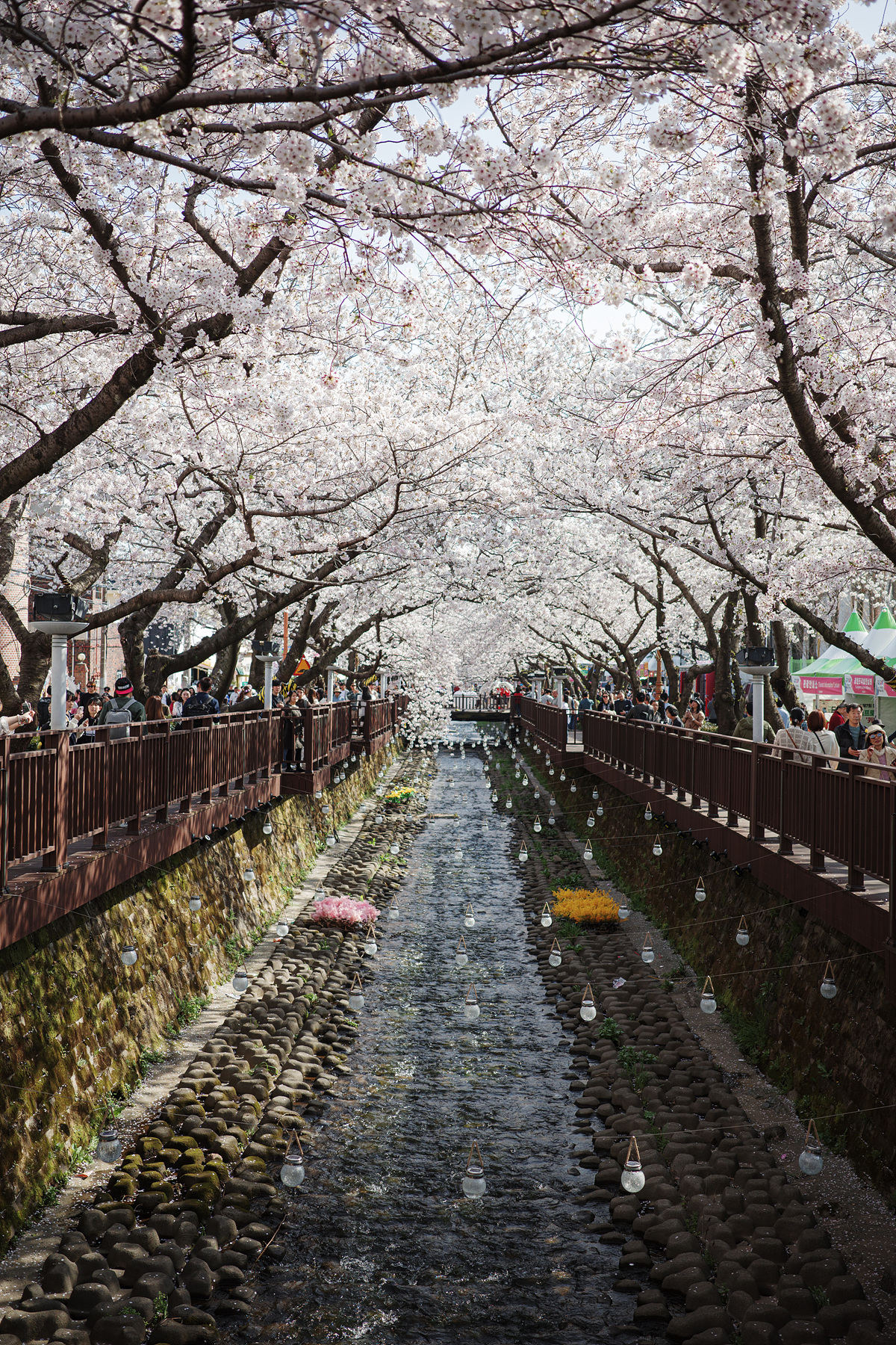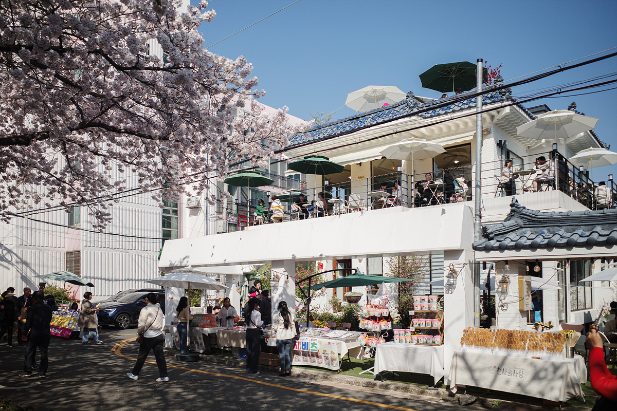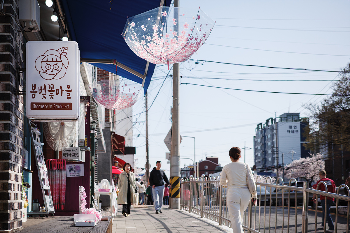 중앙시장을 향하다가 벚나무에 홀려 지도와 다른 길로 가고 있었는데, 건너편에서 벚꽃장을 진행하고 있었습니다. 축제를 제대로 즐길 수 있는 한복 대여부터 벚꽃 내음을 잔뜩 담은 도예나 공예품 등 다양한 물품이 판매 중이었어요. 유명 포토스팟에서 넘어오니 길이 한적했는데 탐스러운 벚꽃은 어디든 참 예뻤습니다.