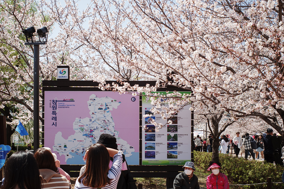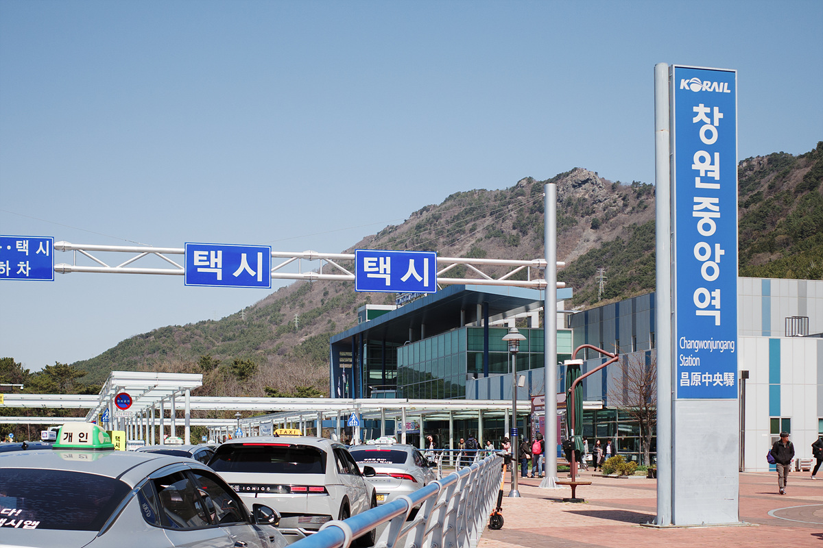 KTX를 타고 창원중앙역에 내렸습니다. 걱정을 씻어주려는 듯 역사 밖으로 나오니 분홍 빛을 뿜어내는 벚나무들이 멀리서도 눈에 들어왔어요. 꽃이 아직 덜 폈다는 소문이 돌아도 군항제를 찾은 사람들로 역 앞이 이른 시간부터 복작복작했습니다. 부지런히 차를 타고 경화역을 향했어요.
