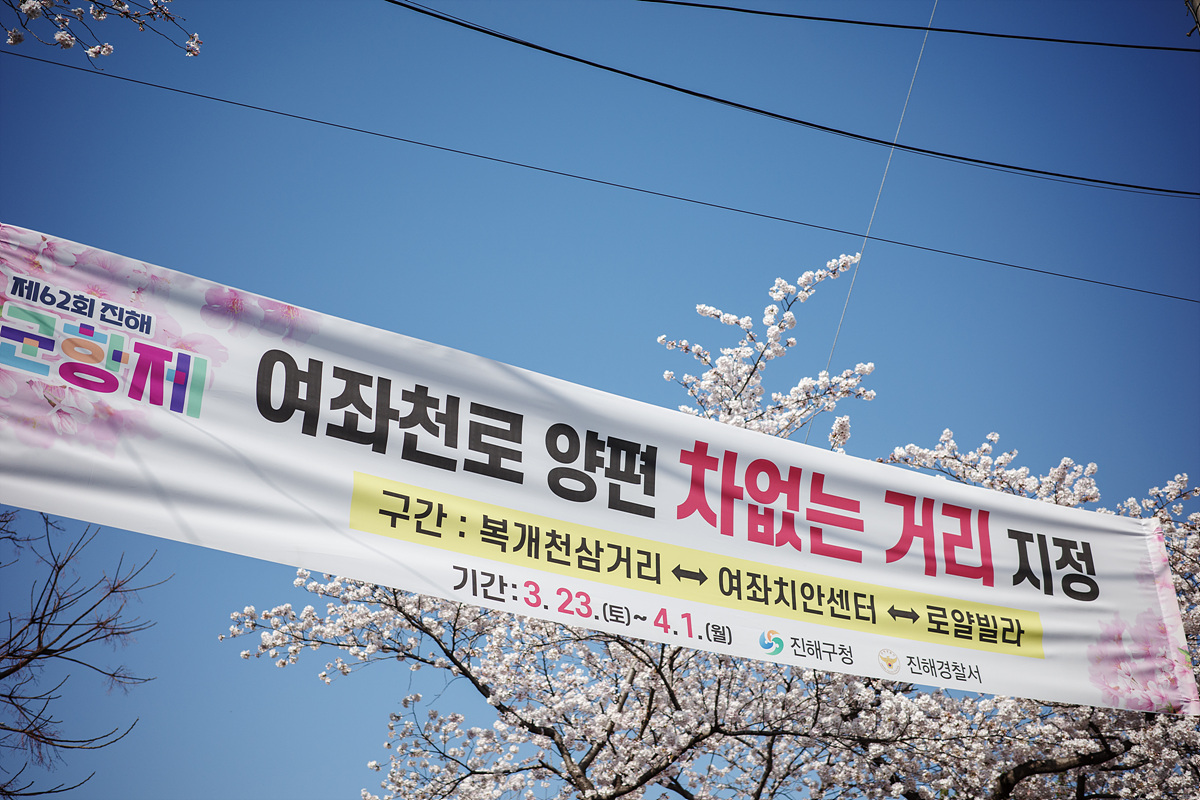 여좌천로는 군항제 기간 동안 차없는 거리로 제한을 하고 있었습니다. 진해 여기저기가 차를 통제하고 있었습니다. 왼쪽 길이 몰리면 오른쪽 길로, 또 직진 차선으로 쉴 새 없이 최대한 지체없는 관람을 위해 모두가 일사분란하게 움직였어요. 강원도는 제설에 도가 텄다는 것처럼 진해는 군항제 인파에 도가 튼 느낌이었습니다.