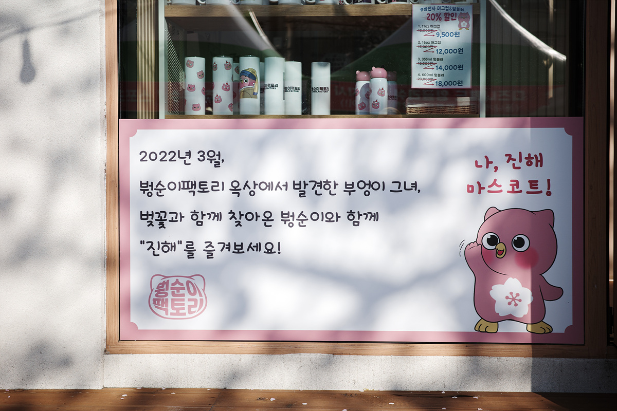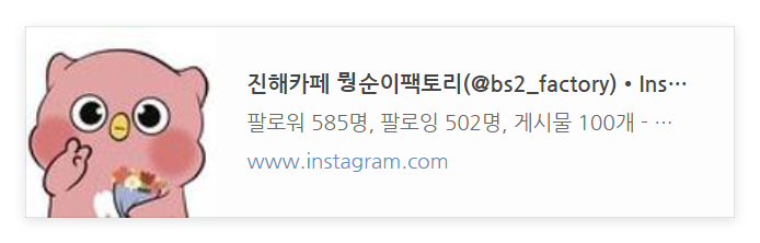 참, 진해의 공식 마스코트가 있더라고요. 바로 붱순입니다. 붱순이는 현재 돌이 갓 지난 응애(!) 부엉이 인데요. 진해 부엉산에서 왔다고 합니다. 진해 벚꽃길 옆 중원로에서 주민들의 사랑을 잔뜩 받으며 태어나 중원로의 가게들을 모두 섭렵했다고..! 귀여운 붱순이가 궁금하실 분들을 위해 SNS 링크를 드립니다.