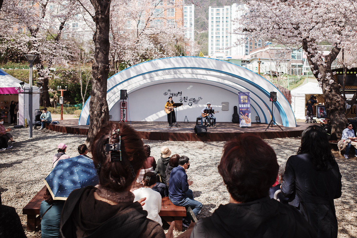 경화역 철길은 길 전체에 걸쳐 세 나무에 하나 꼴로 앉을 수 있는 자리가 준비되어 있었습니다. 메인 벚나무 길 뒤로도 지역민들과 관광객이 모두 즐길 수 있을 만큼 넉넉한 휴식 공간이 있었어요. 뜨거워지는 햇살 아래서 여유롭게 진해의 봄 풍경을 감상할 수 있도록 한 마음이 느껴졌습니다.