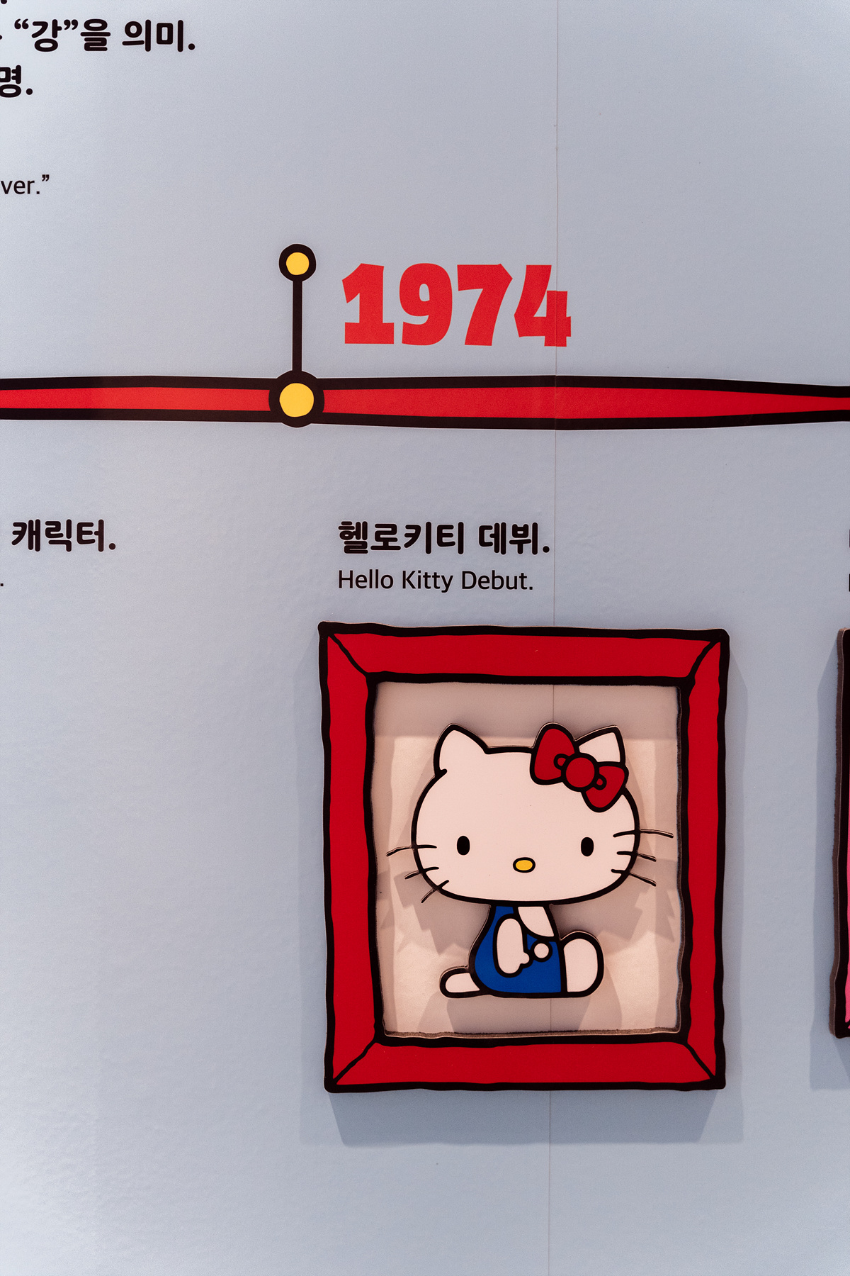 전시장에 들어서면 가장 먼저 산리오 연대기를 훑을 수 있습니다. 현재의 산리오가 된 시점부터 산리오 캐릭터 데뷔 연도가(정말 데뷔라고 적혀 있어요.) 나열되어 있어요. 헬로키티가 원로 격(?)이라는 것은 알고 있었지만 마이멜로디 데뷔가 헬로키티와 크게 차이 나지 않는다는 사실에 놀라고, 국내에 잘 알려진 캐릭터 외에도 정말 많은 캐릭터가 몇 십 년에 걸쳐 데뷔해서 또 놀라고. 산리오 캐릭터 대상이 열리는 이유를 알 것 같았어요.