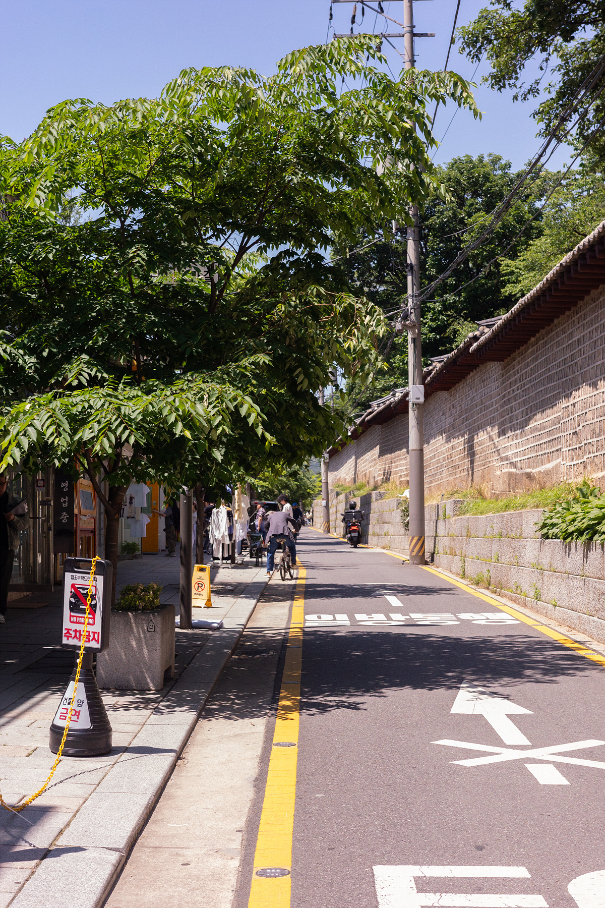 햇빛은 맹렬하게 타오르지만 그늘막 아래는 시원한 봄과 여름 사이. 하늘은 높고 푸르며 담벼락 너머 종묘에서 쑥쑥 자라난 나무는 초록빛입니다. 눈 돌리는 모든 곳이 푸르렀고 초록빛이었어요. 차도와 떨어져 있는 골목이다 보니 사람들의 대화 소리가 백색 소음처럼 골목을 메우고 멀리서 배기음 소리, 경적 소리가 이따금 들려와요. 마치 높다란 돌담길이 외부 소음을 막아주는 것처럼요.