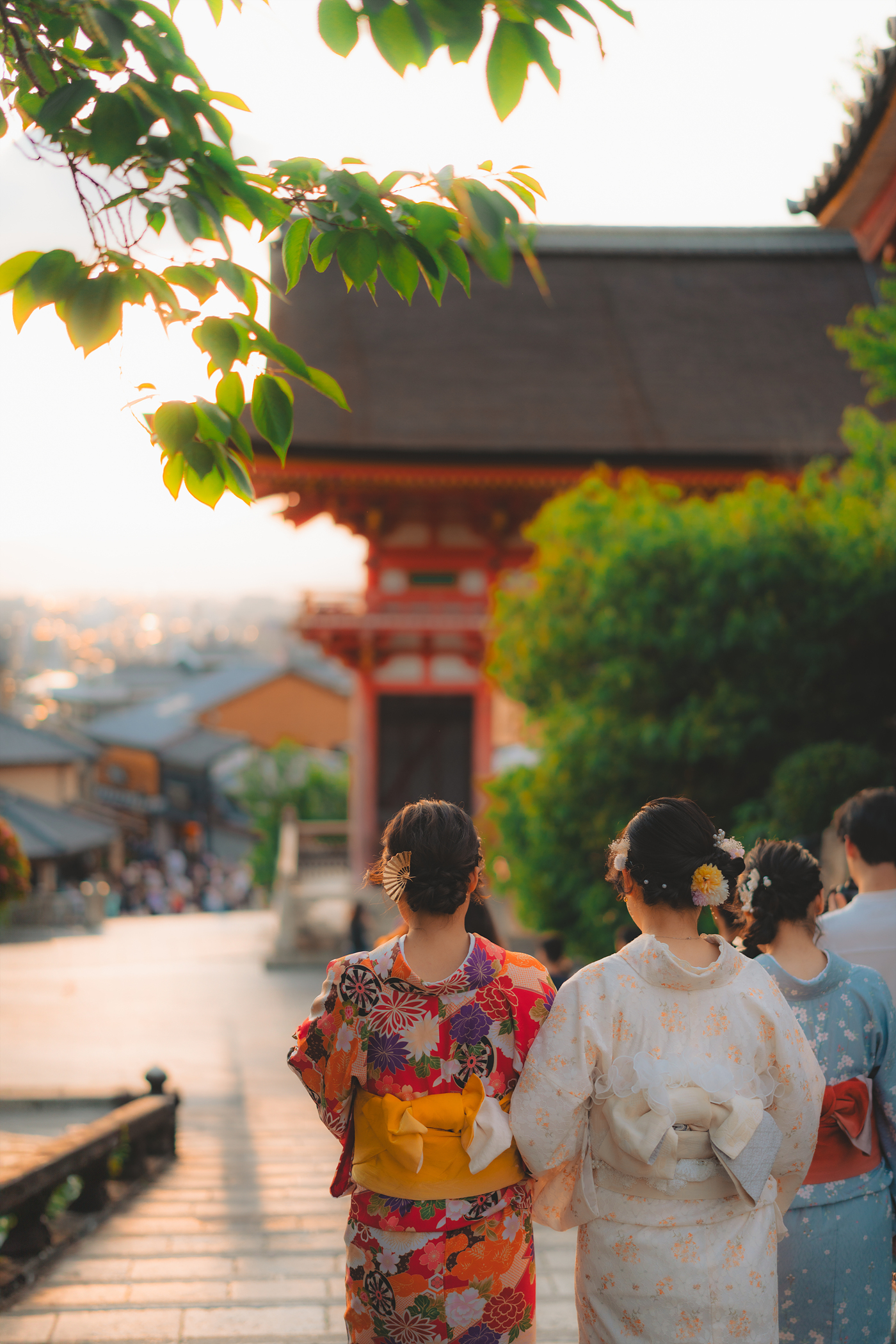 노을 질 무렵, 전통 의상을 입은 현지인과 기요미즈데라에서 내려다보는 교토 시내의 전경