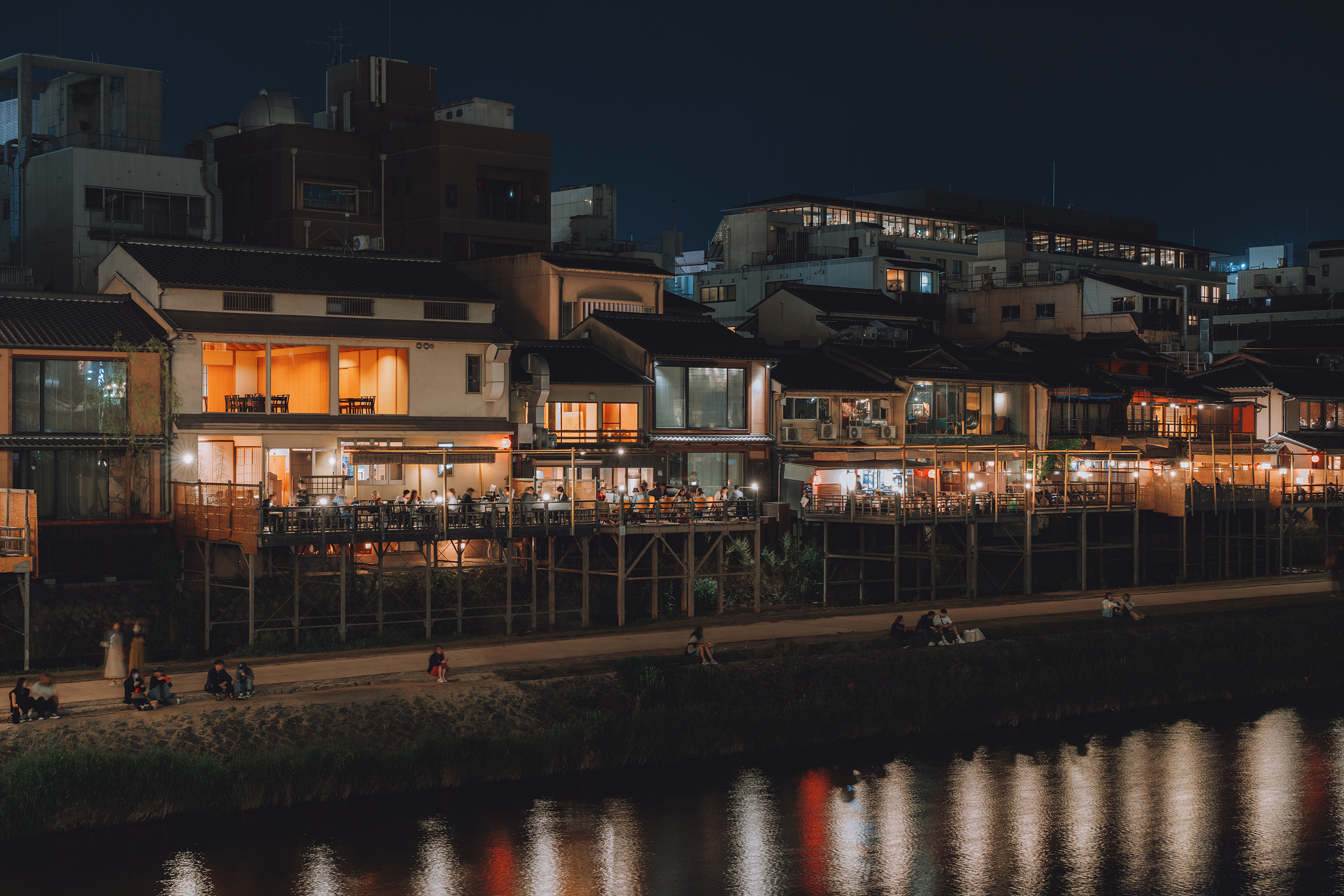 가모 강변 : 교토 중심을 가로지르는 가모강. 강가에 많은 사람들이 앉아 교토의 야경을 감상하고 있습니다.