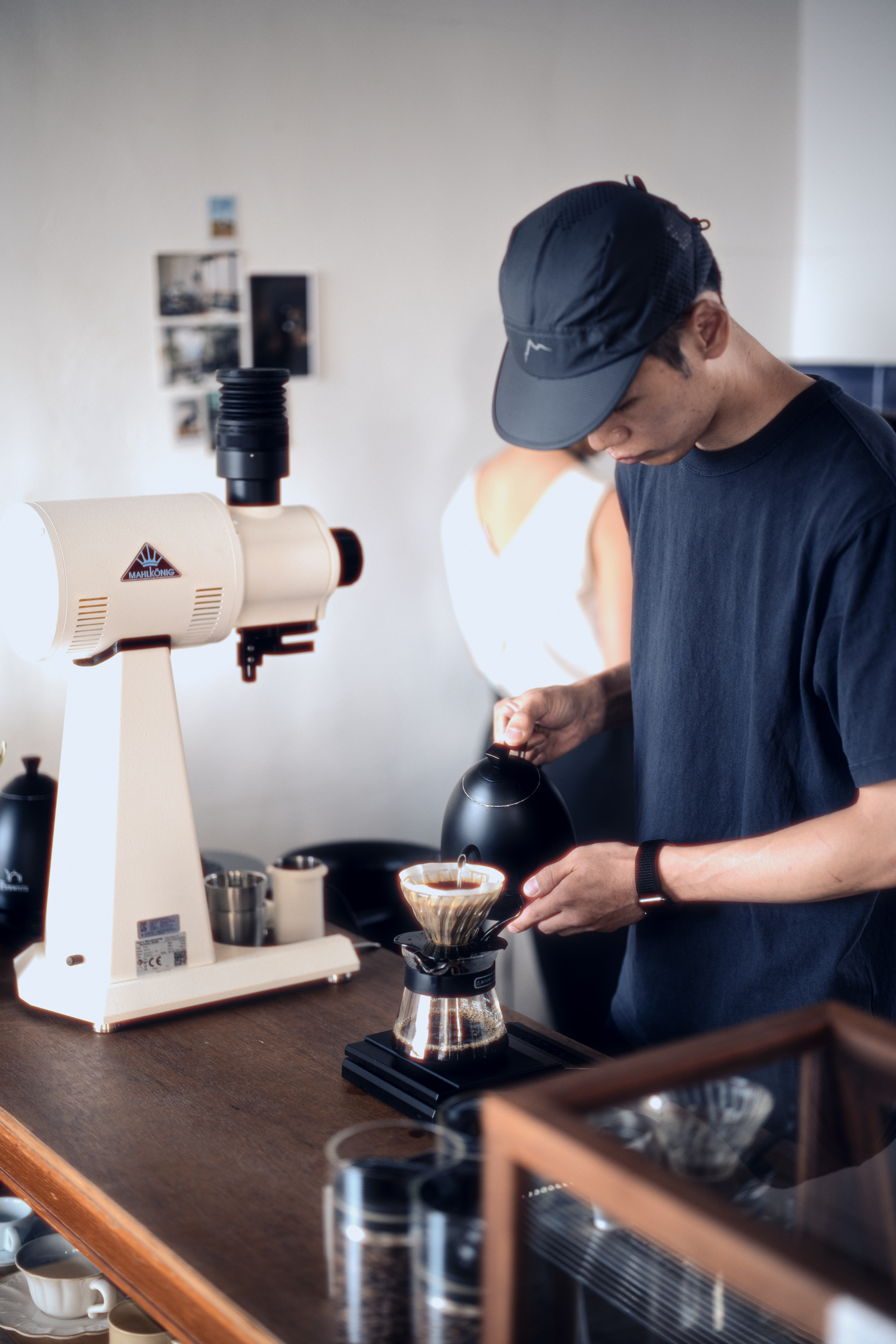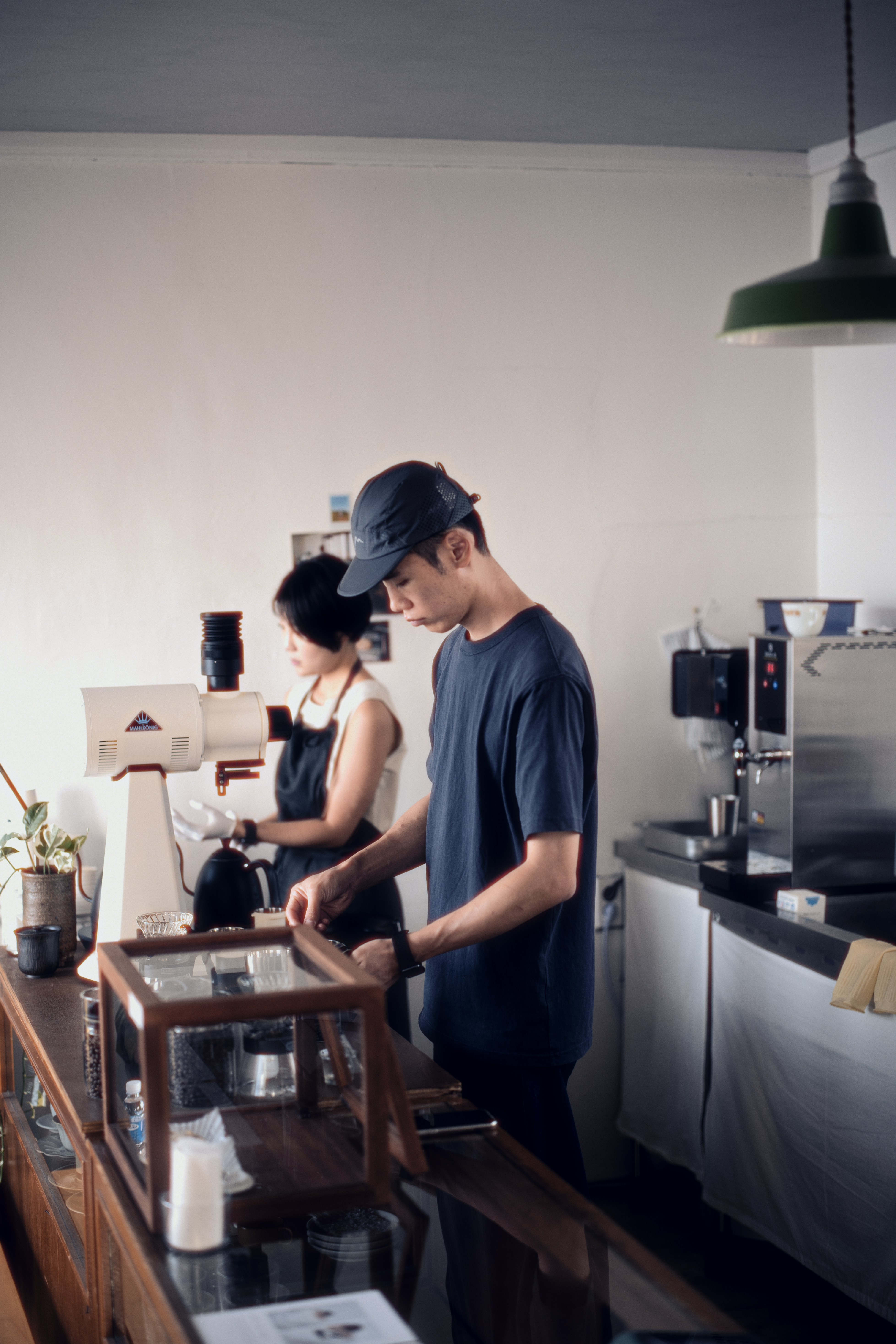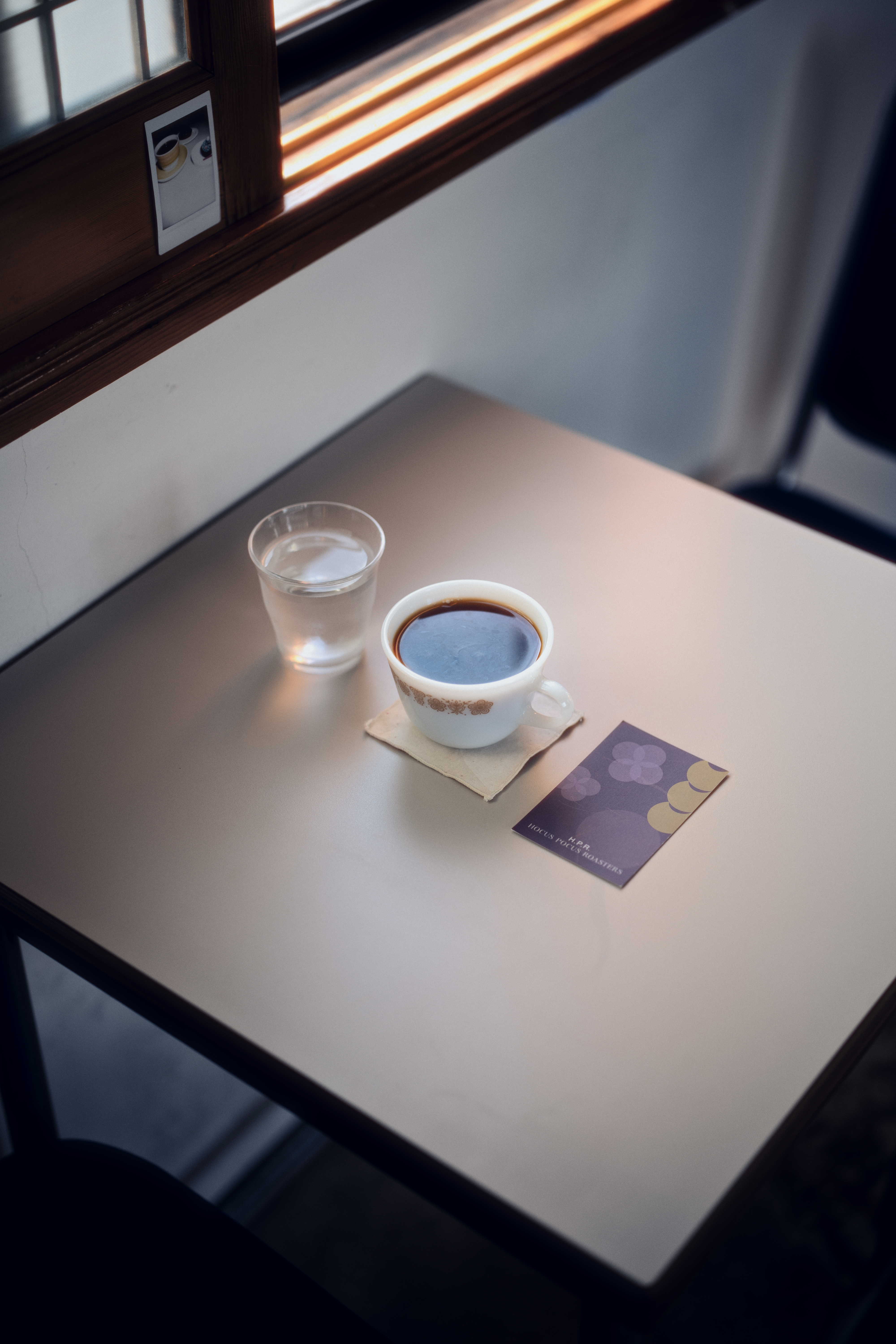 커피를 내리는 드리퍼는 하단부가 낯설게 생겼는데, 리브의 형태가 ‘하리오(Hario)’의 제품으로 보입니다. 추출 시간이 빠른 하리오를 남자 주인장은 3번에 걸쳐 짧게 끊어냅니다. 한 번 맛을 보고, 뜨거운 물을 담아 두어 따뜻하게 데워 둔 잔에 담아냅니다. 데워 두지 않은 잔에 커피를 담으면 커피는 빠르게 식어버려 따뜻한 커피에서 느낄 수 있는 플레이버가 빠르게 사라져 버립니다. 하얀색 불투명의 잔은 콘셉트에 맞게 빈티지하지만 올드하진 않고, 온도를 지키기에 충분히 도톰합니다.
