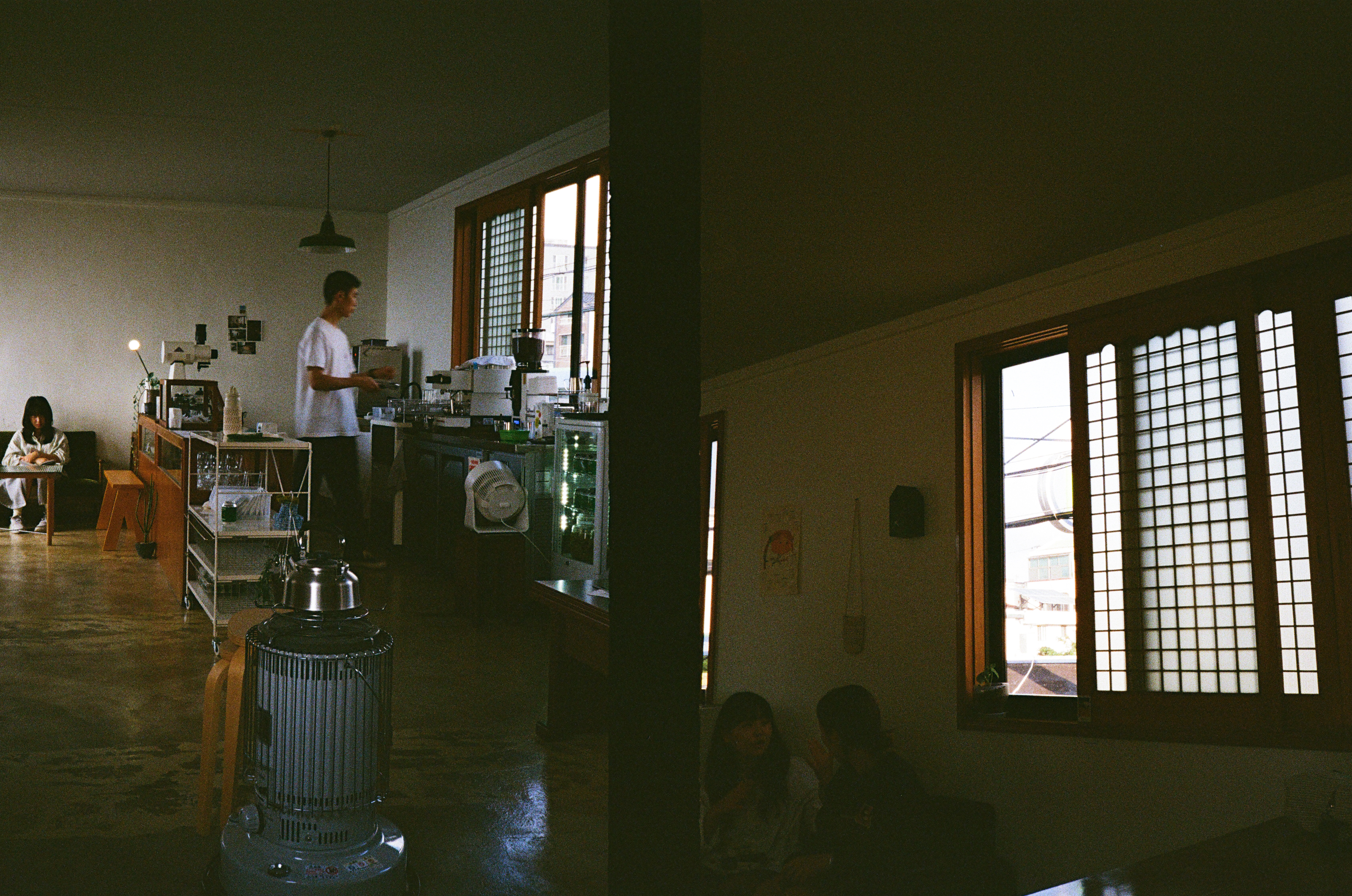2층에 올라 올록볼록한 유리가 붙어있는 오래된 미닫이문을 옆으로 밀고 들어가자 바로 바가 나오고 바 안의 남자 주인장이 인사를 건넵니다. 쭈뼛거리며 인사를 하고 둘러보자 하나의 공간으로 이루어진 내부는 입구의 바를 중심으로 벽 쪽으로 몇 개의 크고 작은 테이블을 놓아둔 구조입니다. 벽을 따라 길게 난 창으로 오후의 햇살이 길게 뉘어져 안을 비춥니다.