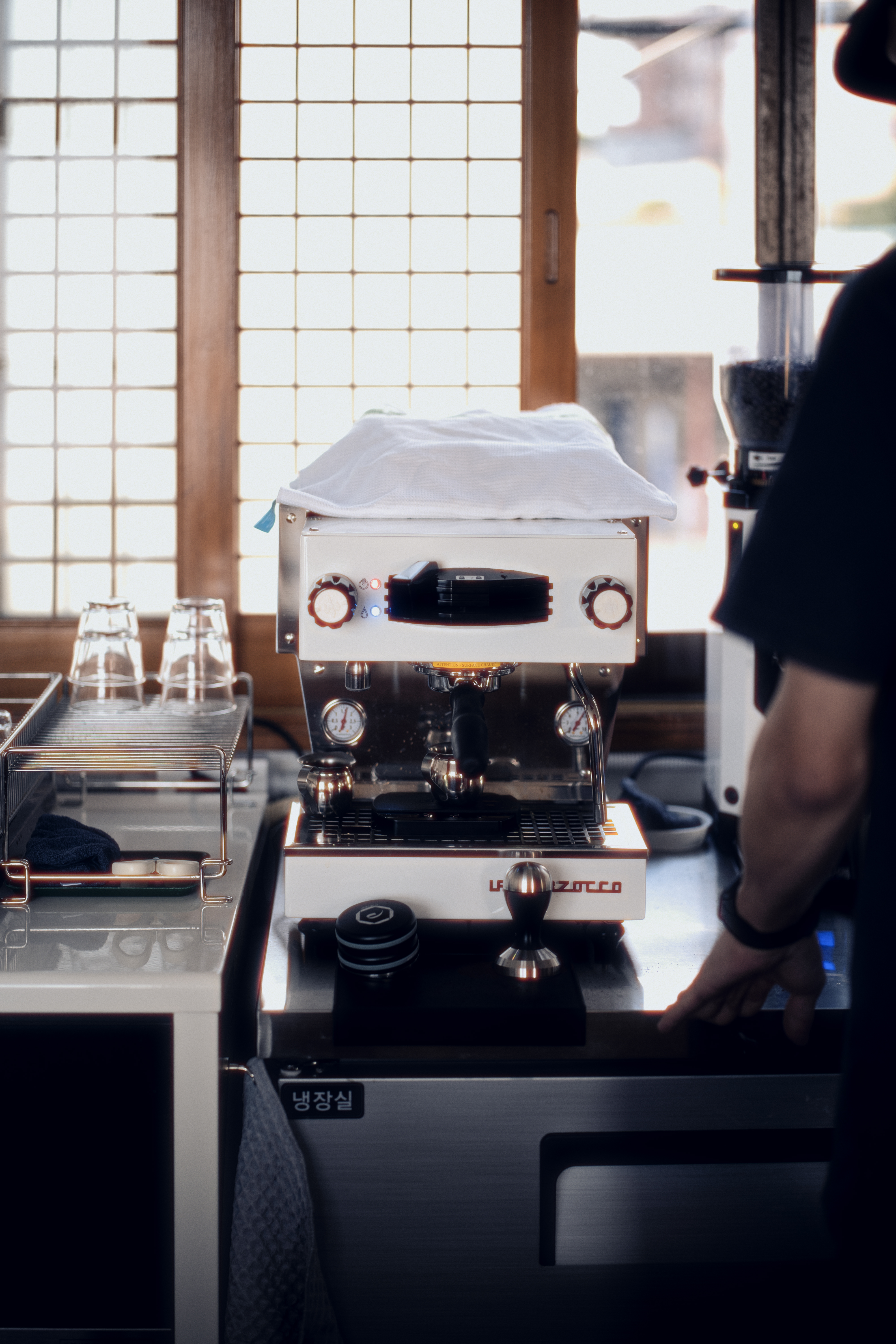 작은 가정용처럼 보이는 에스프레소 머신은 ‘라 마르조꼬(La Marzocco)’의 리네아(Linea) 미니 1그룹 버전입니다. 작더라도 라 마르조꼬의 근본과도 같은 리네아의 이름을 딴 만큼 신뢰할 만하죠. 시그니처 커피인 작은방라테에 쓰일 에스프레소를 뽑겠다는 의도일 텐데, 이런저런 것들이 섞인 것 같은 커피가 어떤 맛일지 궁금해서 결정을 내릴 수 없습니다.