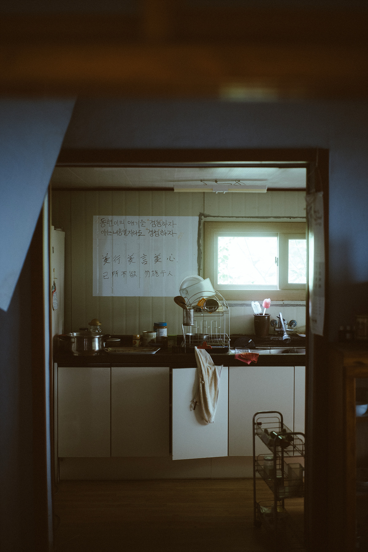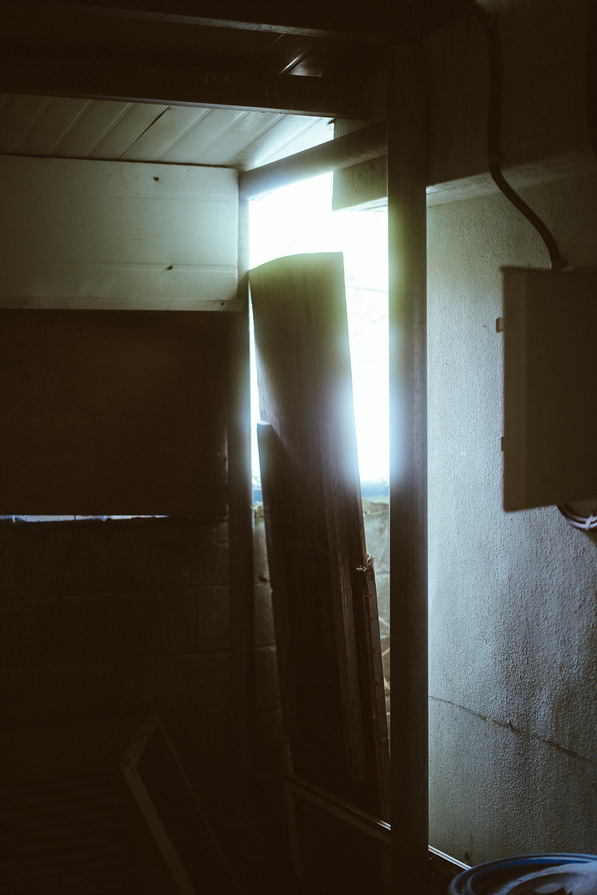 가운데 문 앞으로 한 대만 주차가 가능한 주차 라인을 정렬시키고, 양옆 창문은 대칭을 이루고 있는 것이 사각형에 대한 집착마저 느껴집니다. 내부 구조도 집이라고 하기에는 매우 독특해서 부엌이나 방이라고 할 만한 것도 없고, 칸막이와 같은 벽을 이용해 두 공간으로 나뉘어져 안쪽으로 커다란 마루가 집의 대부분을 차지하고 있습니다. 창문은 내부와 외부를 확인하는 용도가 아니라 빛만 들어오도록 파란색 비닐을 붙여 놓았는데 오염되어 빛이 혼탁합니다.