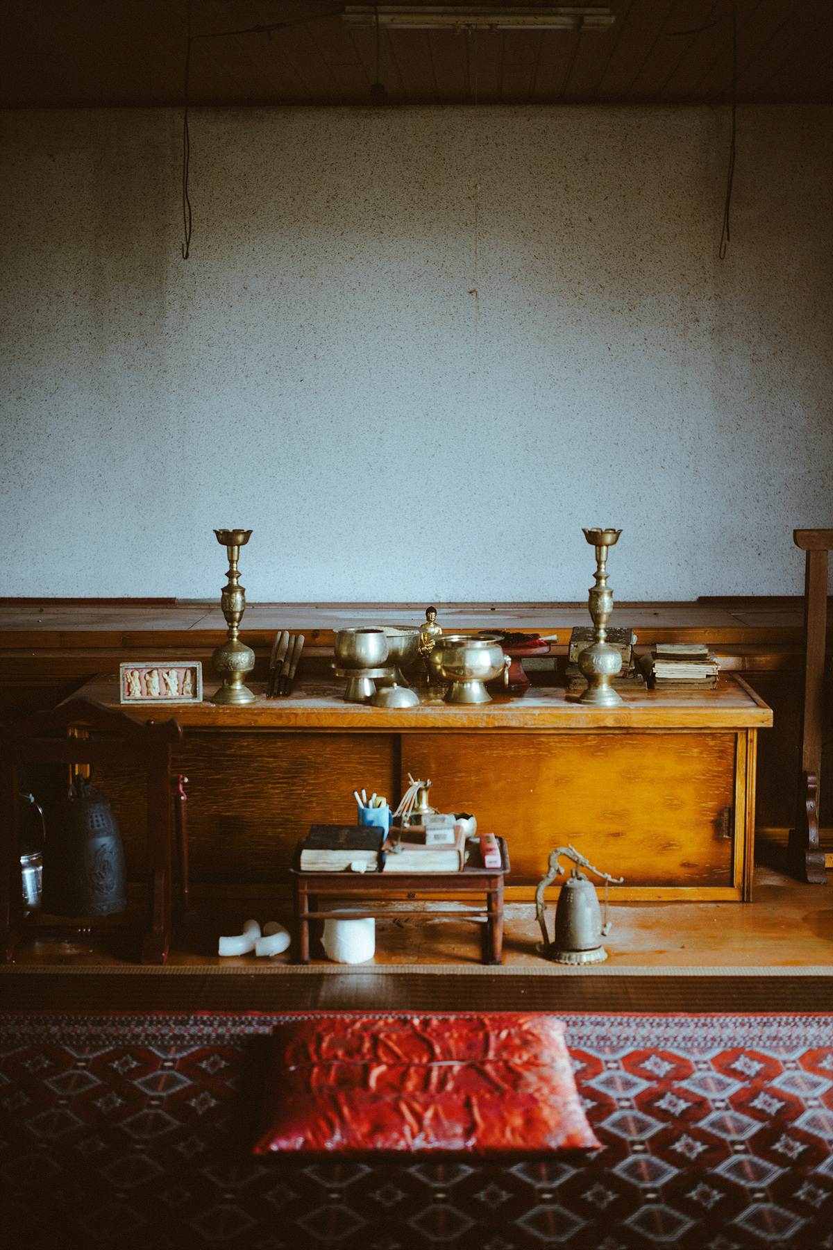 신당 안은 향로와 종, 그리고 북을 비롯해 불상까지 제단을 비롯해 책상과 의자까지 그 모습 그대로를 유지하고 있습니다. 다만 제단 뒤의 벽은 깨끗하게 치워져 있습니다. 여기까지 이르는 길과 내부의 공기 속에서 희미하게 느껴지는 먼지와 곰팡이의 냄새는 오랫동안 누가 드나들지 않은 것 같지만, 가운데 놓인 빨간색 방석 위에선 누군가가 방금 전까지도 절을 하고 있었던 것만 같습니다. 궁금증을 해결하고 사진을 한 장 찍고는 허겁지겁 올라갔던 길을 돌아 내려와 어서 그곳을 벗어났습니다.