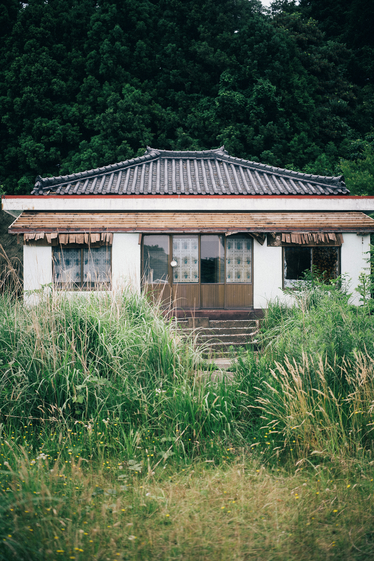 폐허의 건물들은 산의 경사를 따라 고저차를 두고 펼쳐져 있는데, 창가를 통해서 항상 궁금증을 자아내게 했던 그 건축물은 제일 위쪽에 자리하고 있습니다. 기와지붕을 보며 한옥과 같은 모습을 기대했던 것과 달리 반듯한 단일 사각형의 형태로 시멘트를 사용해 지어낸 건축물입니다.