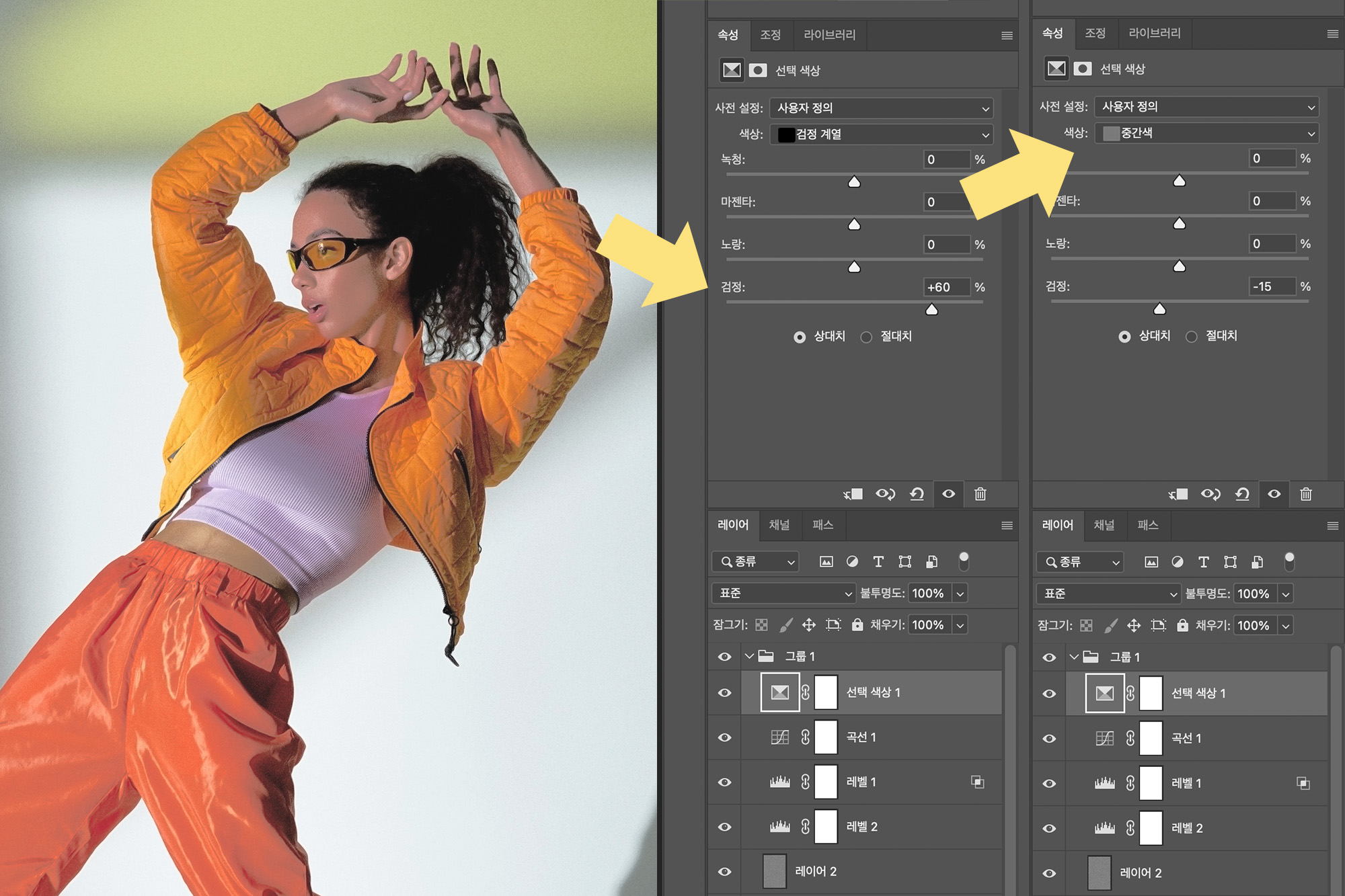 이 상태로는 검은색 부분이 너무 밝게 보이기 때문에 선택 색상을 이용해서 해당 톤만 살짝 어둡게 조정합니다. 이 부분은 레벨 조정의 반복인데요. 이 경우에는 사진의 ‘어두운 영역’이 아니라 검은색 색상(실제로는 검은색에 가까운 색상 영역)을 조정하기 때문에 그림자, 머리카락 등 일부 영역만 조정이 가능합니다.