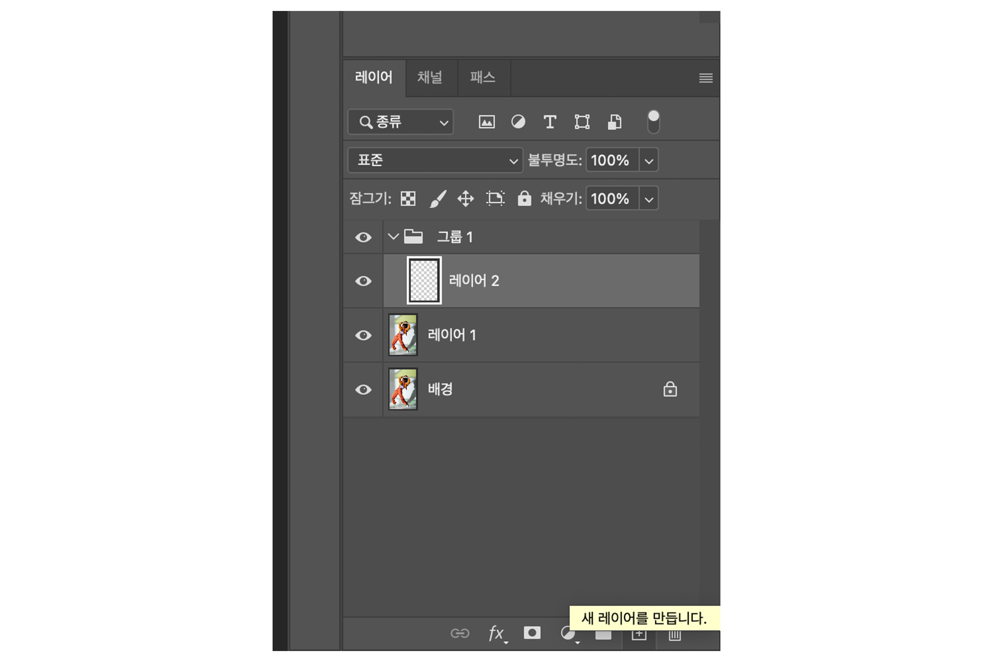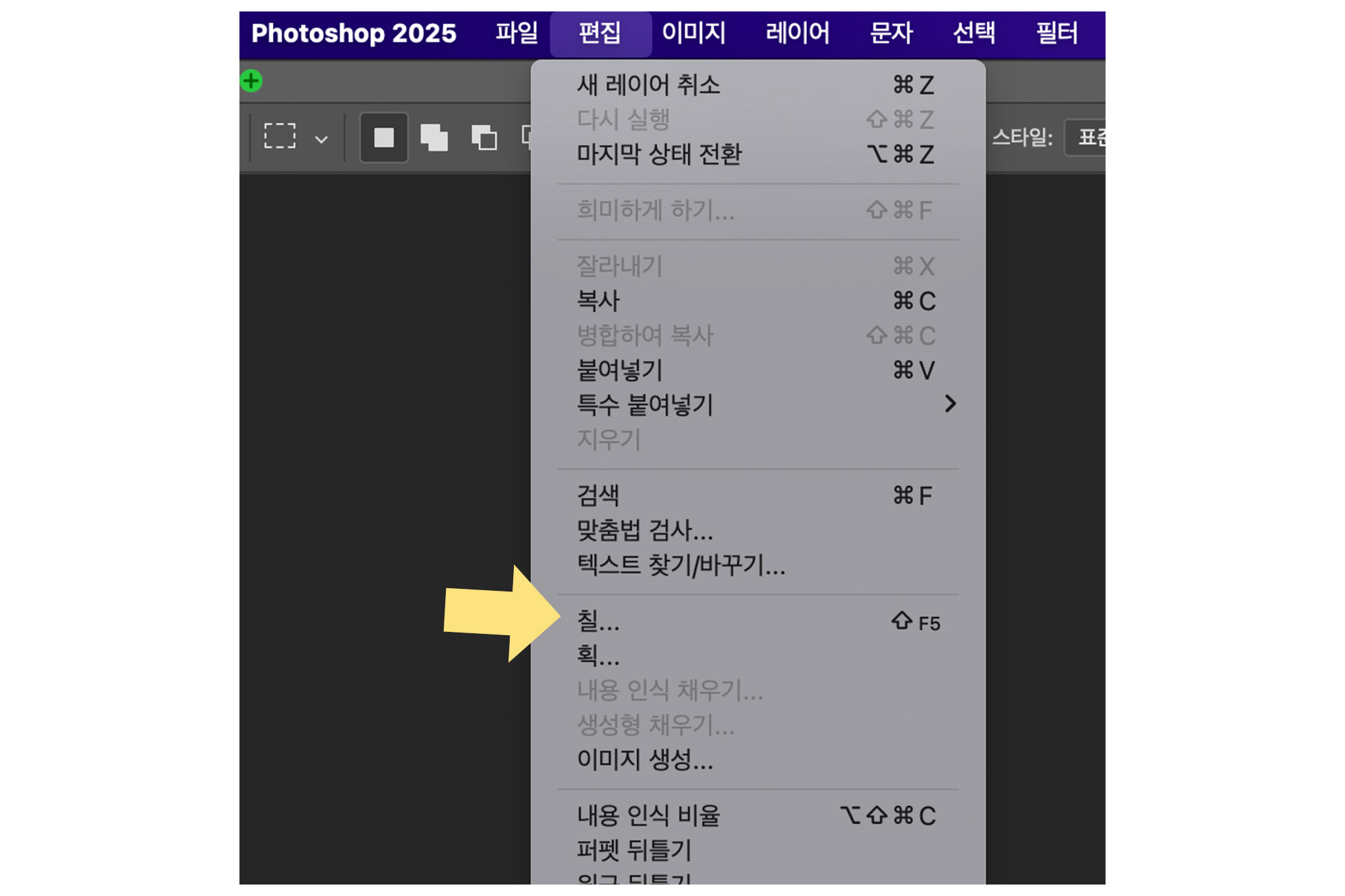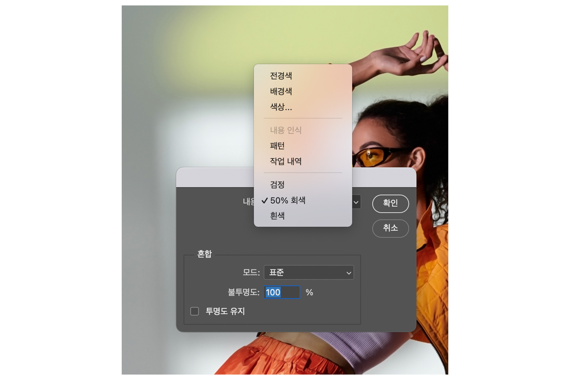 먼저 빈 레이어를 만들고 거기에 편집의 칠 기능을 이용해 50% 회색을 채워줍니다. 50% 회색은 사진의 밝기에 영향을 미치지 않고 그레인 효과만 적용하기 위한 방법입니다. 그럼 약간 밝은 회색이 화면 전체에 채워집니다.