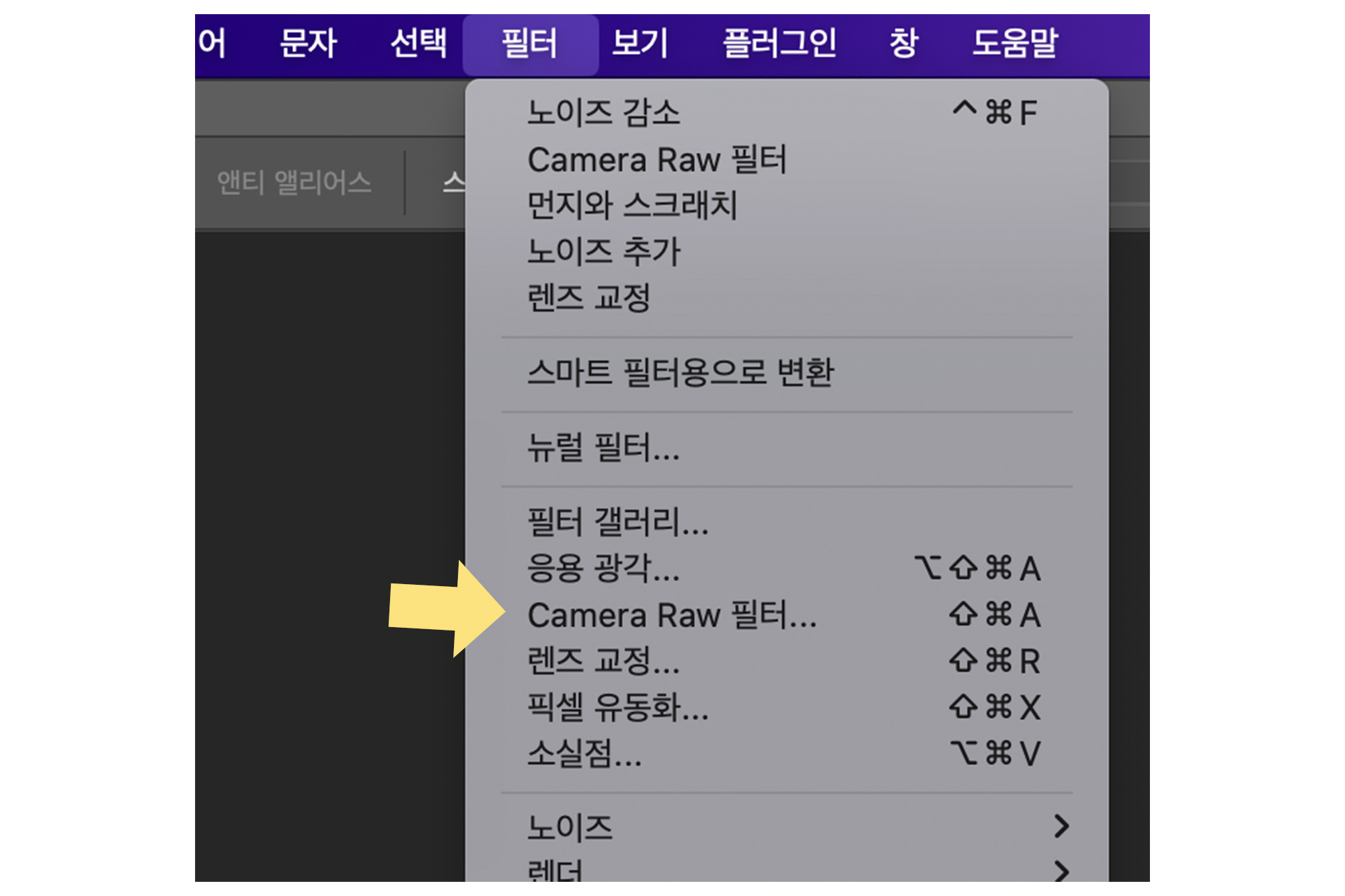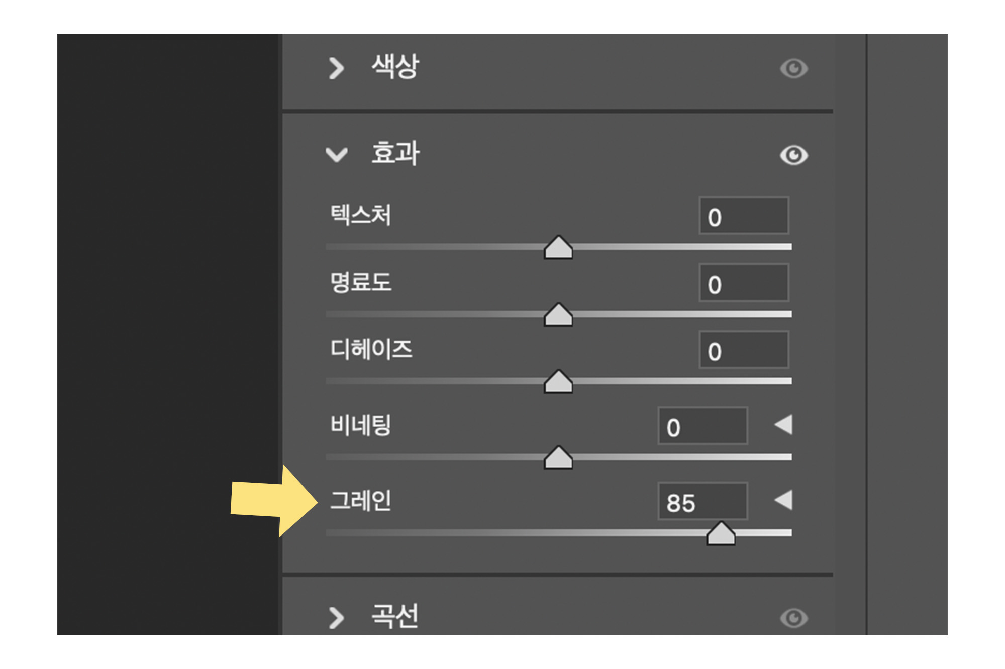 여기에 [필터 > Camera Raw 필터]를 선택한 다음 효과 영역의 그레인을 적용합니다. 그레인은 아주 많이 적용해도 어색하지 않습니다. 이번에는 85 정도를 선택했습니다. 일반적인 사진이라면 이렇게 높은 그레인은 조금 거칠게 느껴질 수 있지만 이번에는 오히려 빈티지한 느낌이 강조될 것입니다.
