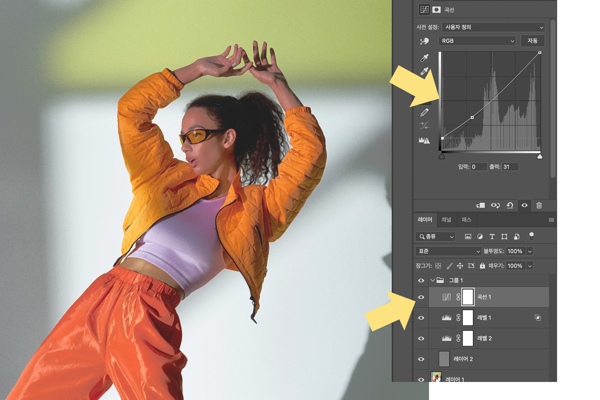 이제 곡선 레이어를 만들어서 어두운 영역을 살짝 띄워줍니다. 인쇄물은 검은색을 모니터 화면만큼 매우 짙게 표현하지 못하기 때문에 이런 느낌을 재현하기 위해 검은색의 표현 영역을 오히려 반대로 줄여줍니다. 이렇게 하면 검은색이 미묘하게 회색으로 톤이 뜨게 됩니다.