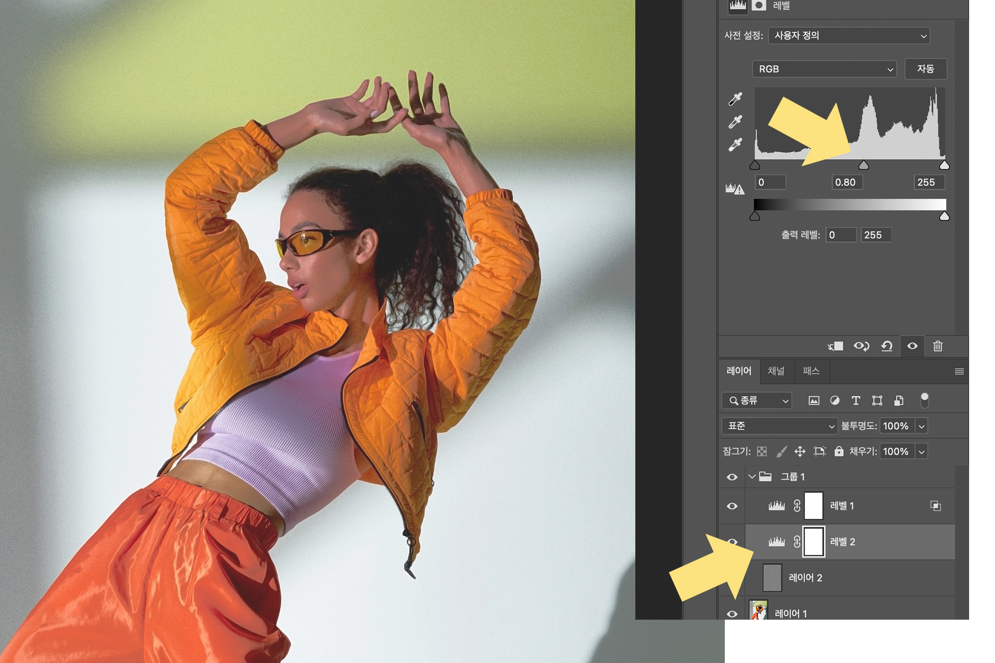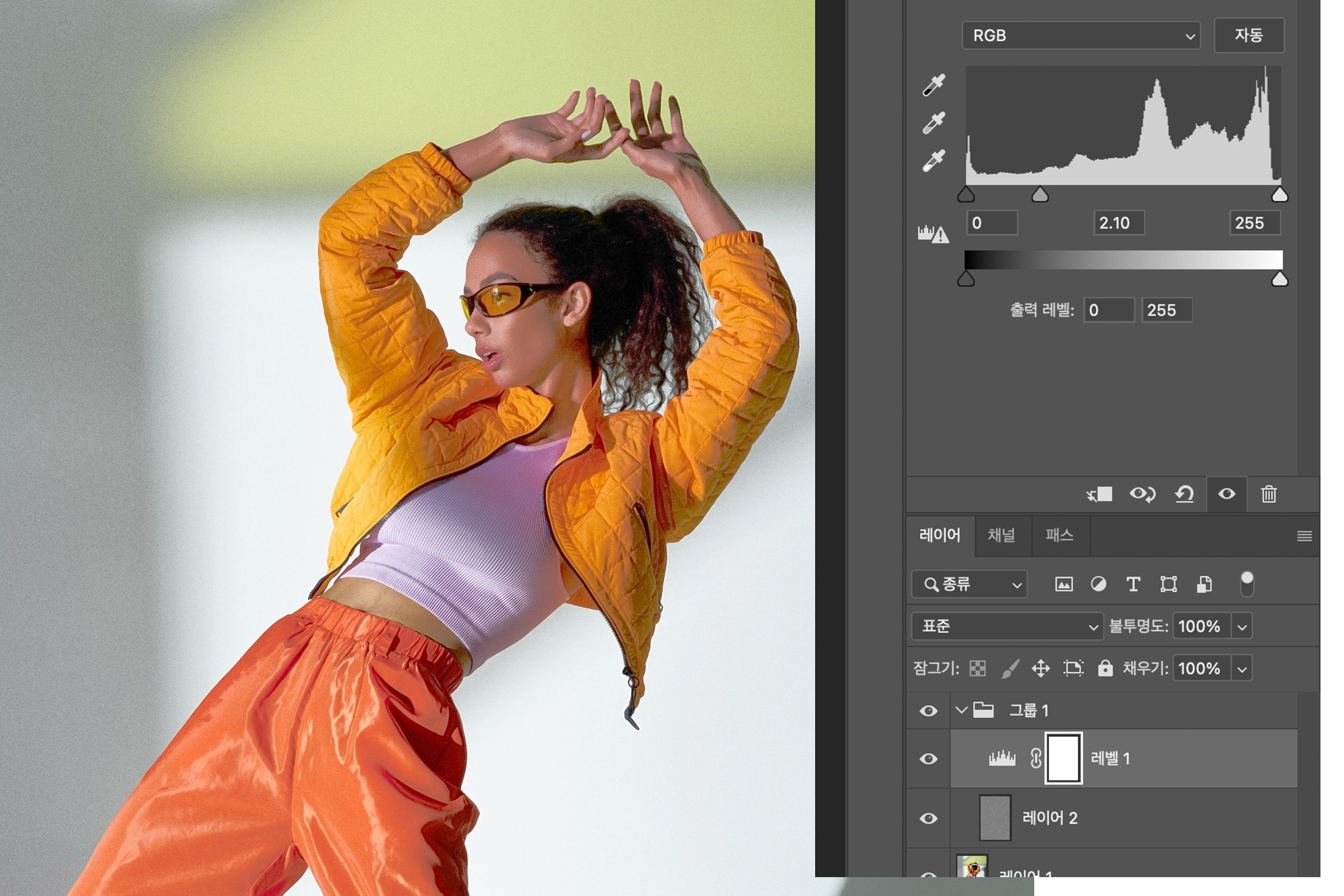 이제 다시 레벨 레이어를 만들어서 미드 톤 부분의 밝기를 올려줍니다. 레이어는 그레인을 만들었던 레이어 바로 위에 위치하게 해야 어색하지 않게 중간 톤의 분위기만 바꿔줄 수 있습니다.