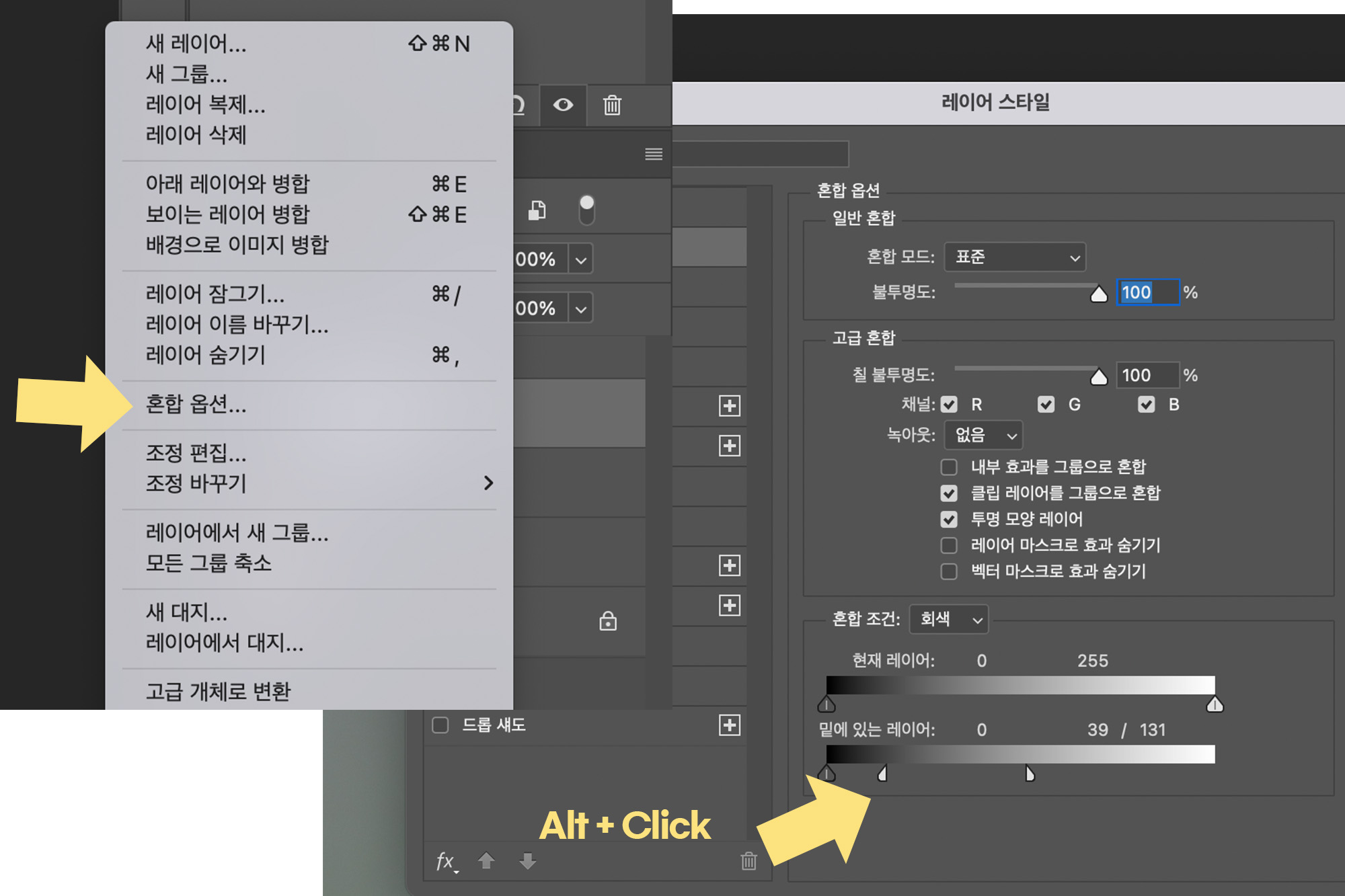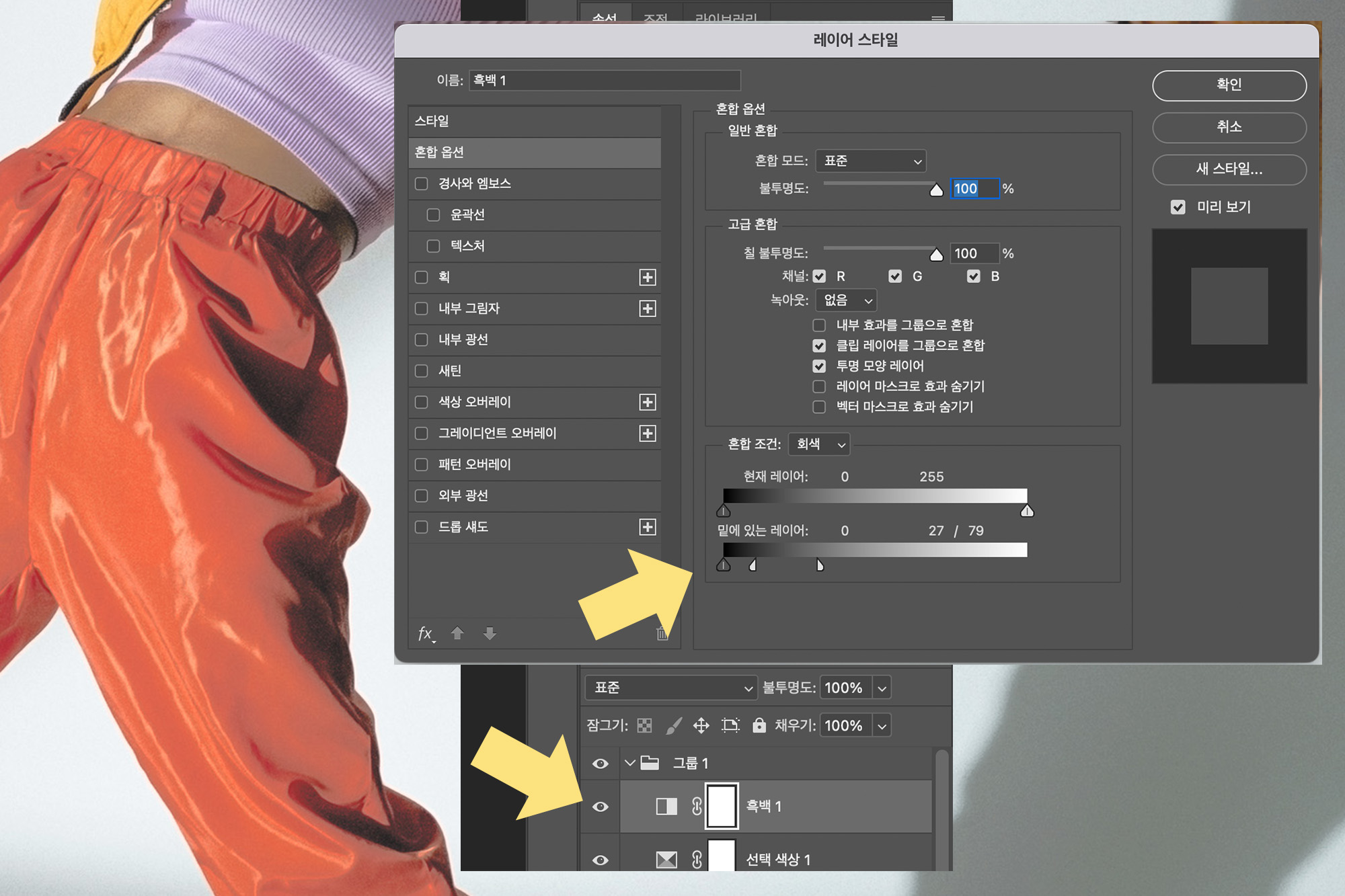 이번에는 사진을 흑백으로 만들어주는 레이어를 추가합니다. 그다음 혼합 옵션에서 혼합 조건을 조정해서 그림자 부분의 채도만 줄어들게 합니다. 이 과정은 인쇄의 어두운 부분 표현을 재현한 것인데요. 인쇄물은 먹(검은색 잉크)을 이용해서 어두운 부분의 밝기를 줄이기 때문에 질이 낮은 프린트 같은 경우는 어두운 부분의 채도가 낮은 경우가 많습니다. 이 점을 이러한 방식으로 재현합니다.