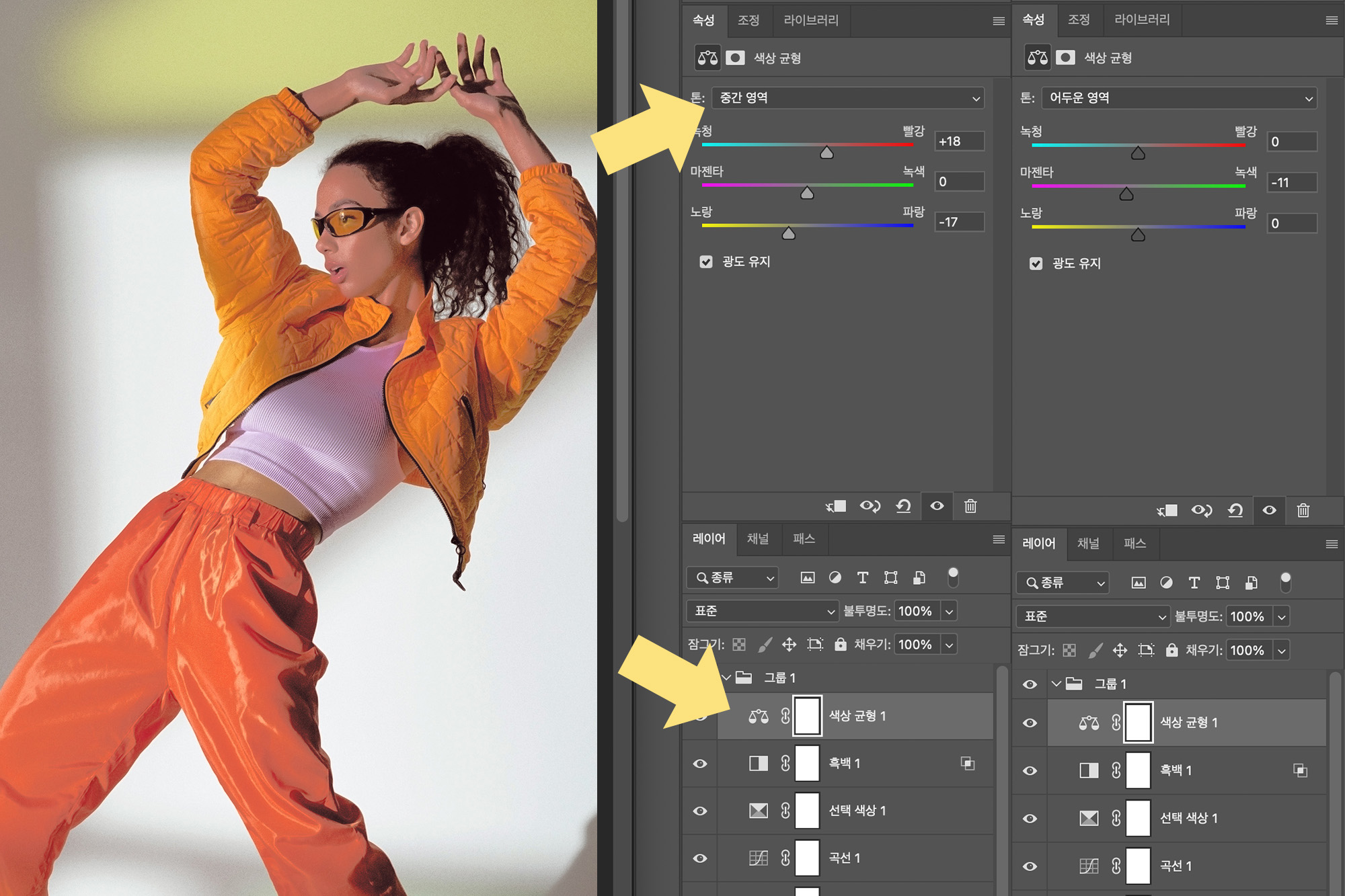 이제 색을 조정합니다. 색상 균형 레이어를 만들어서 중간 영역과 어두운 영역 각각 색을 조정해 줍니다. 이 경우는 정답이 없지만 예전에 잡지를 보면 묘하게 어두운 부분의 잉크가 붉은색을 띠는 경우가 많아서 이번 사진에는 어두운 부분이 붉은색을 띠도록 조정했습니다. 밝은 부분은 약간 색이 바랜 느낌이 들도록 노란색으로 조정했습니다.