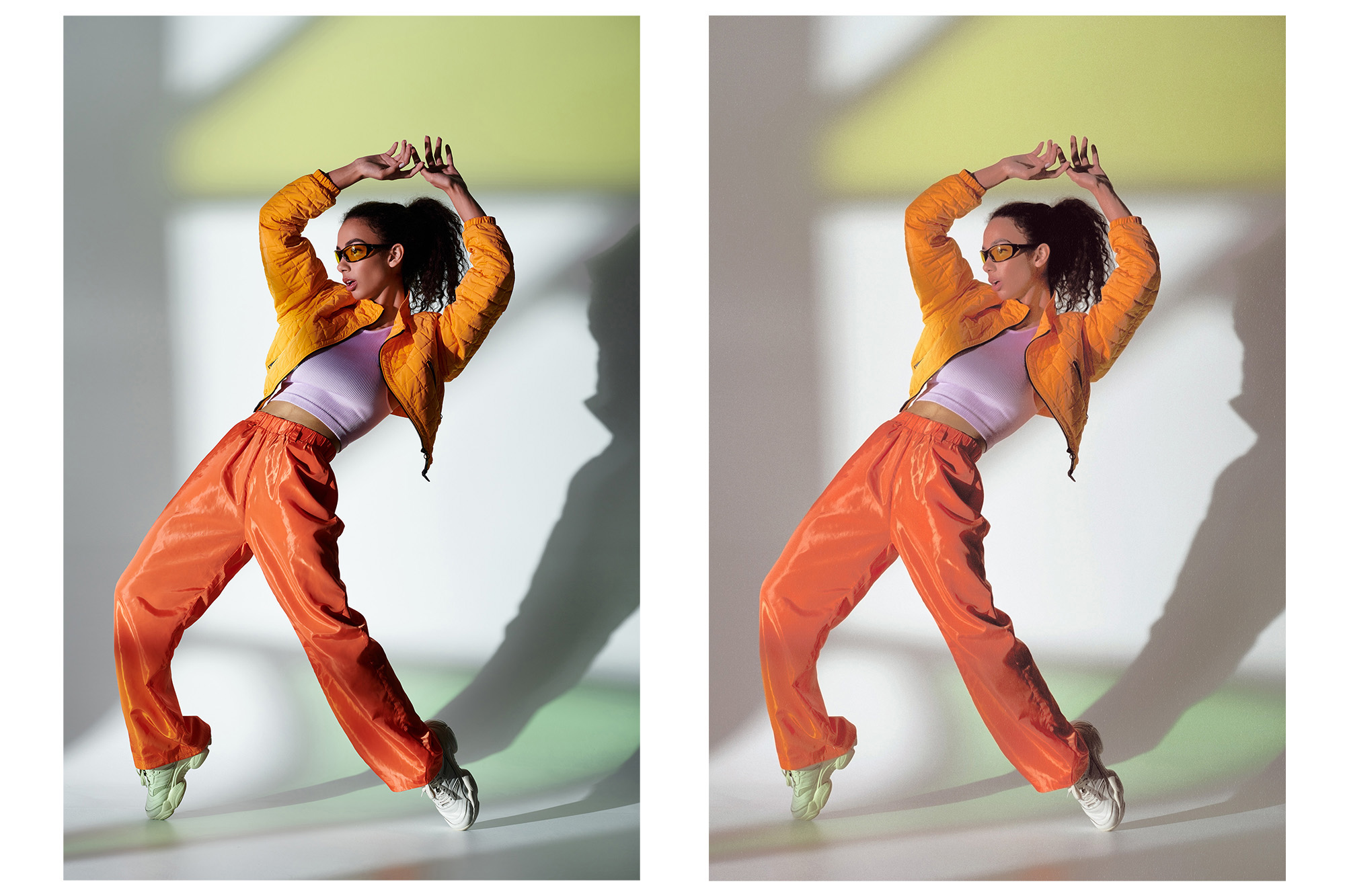완성한 사진입니다. 좌측의 원본과 비교했을 때 전체적으로 밝은 부분과 어두운 부분의 묘사가 굉장히 좁아진 것을 볼 수 있습니다. 그레인과 텍스처가 올라가면서 인쇄물의 느낌도 연출하게 되어 전반적으로 옛날 프린트를 보는 것 같은 느낌이 듭니다. 이러한 효과는 패션 사진이 아니라도 전체적으로 빈티지한 느낌을 연출하기 때문에 추억이 있는 옛 사진에 사진에 적용해 보는 것도 재미있을 듯합니다.