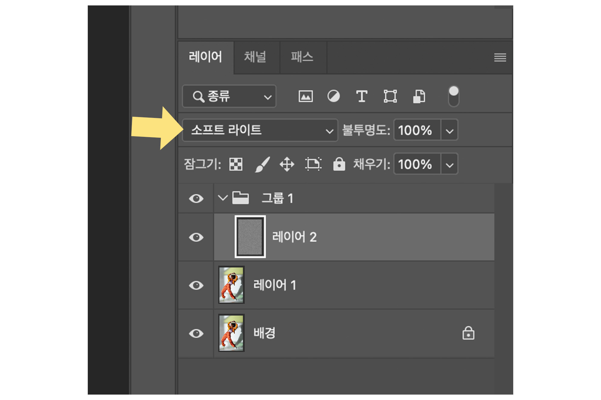 이제 이렇게 그레인을 적용한 레이어를 [블렌딩 옵션 > 소프트 라이트]를 선택해 주면 자연스럽게 사진 위에 인쇄를 한 것 같은 거친 효과가 나타납니다.