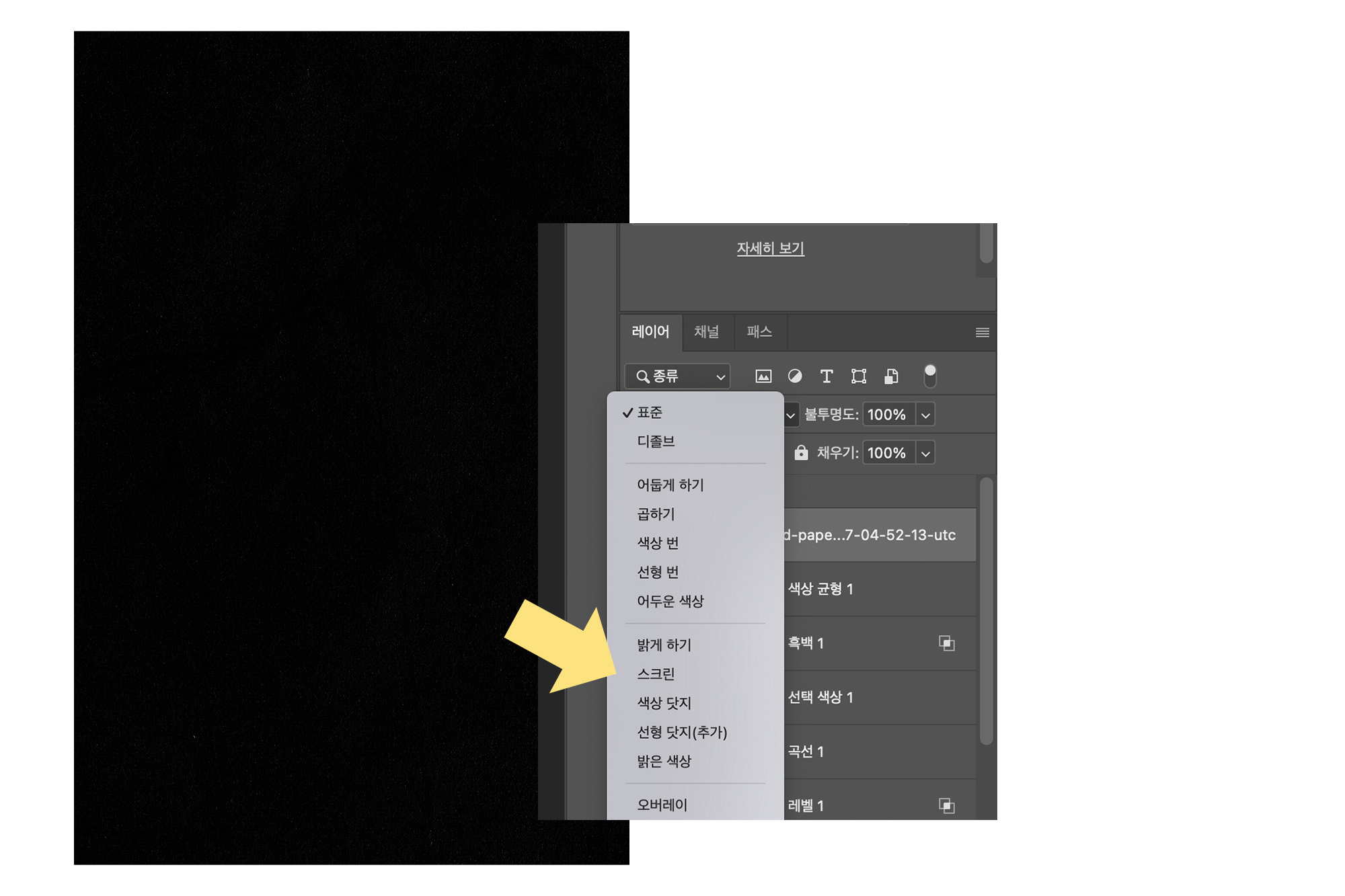 이제 마지막으로 먼지나 종이의 질감 등이 올라간 텍스처를 블렌딩 옵션 스크린으로 사진 위에 올려줍니다. 텍스처를 올리면 종이 질감이 추가되면서 정말 예전 매거진과 같은 향수를 적용할 수 있습니다.