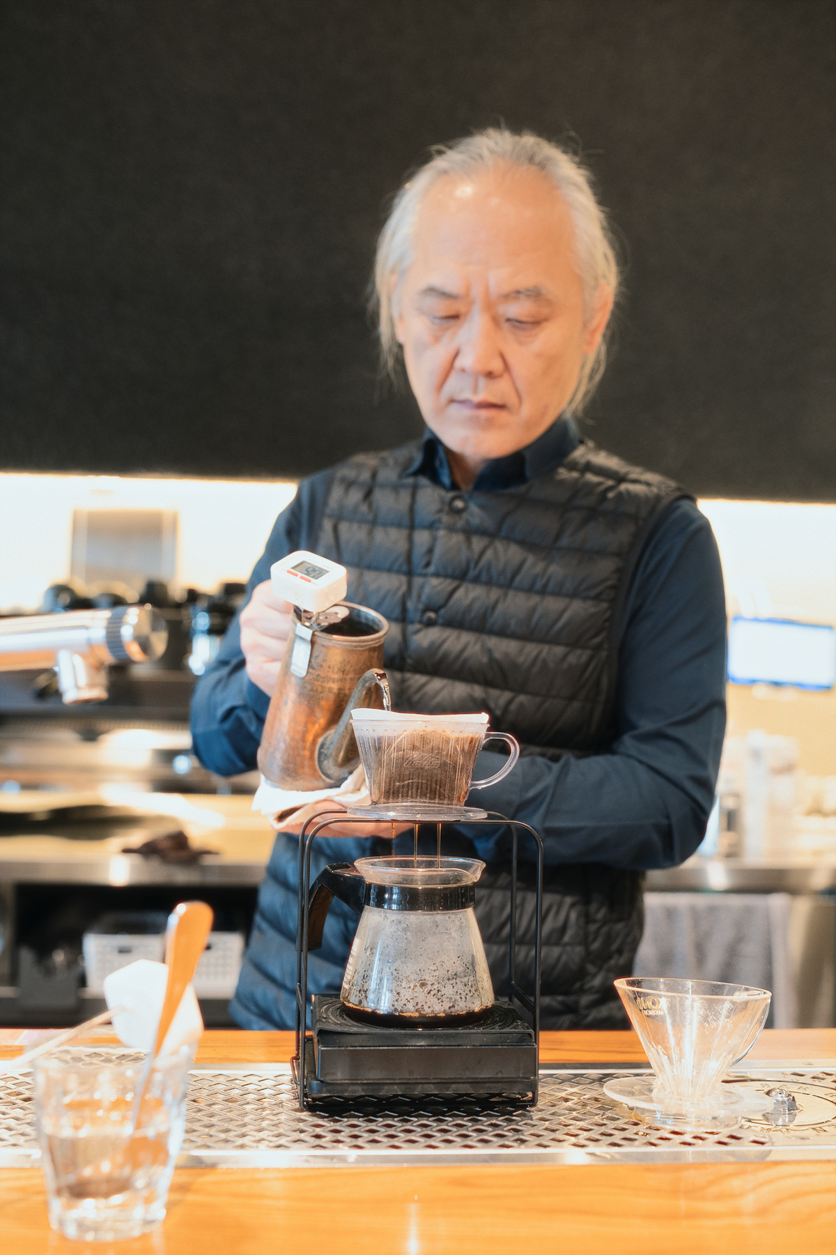 바 앞에 앉아 잠시 주인장에게 양해를 구하고 구경을 하고 있자니 원두 분쇄도와 물 온도를 신중히 확인해가며 커피를 내려냅니다. 브루잉 커피의 맛을 결정하는 것은 첫째 원두, 둘째는 원두 분쇄도, 셋째는 물 온도입니다. 원두에 물이 닿는 시간과 면적을 결정하는 것이 분쇄도이고, 원두에 담긴 커피 성분은 물 온도에 따라 다르게 녹아내리기에 중요합니다. 사실 보기에 중요하다고 생각하는 물줄기의 조절은 그다음 순위인지라 앞서 언급한 사항들을 바꿀 만큼의 힘은 없습니다.