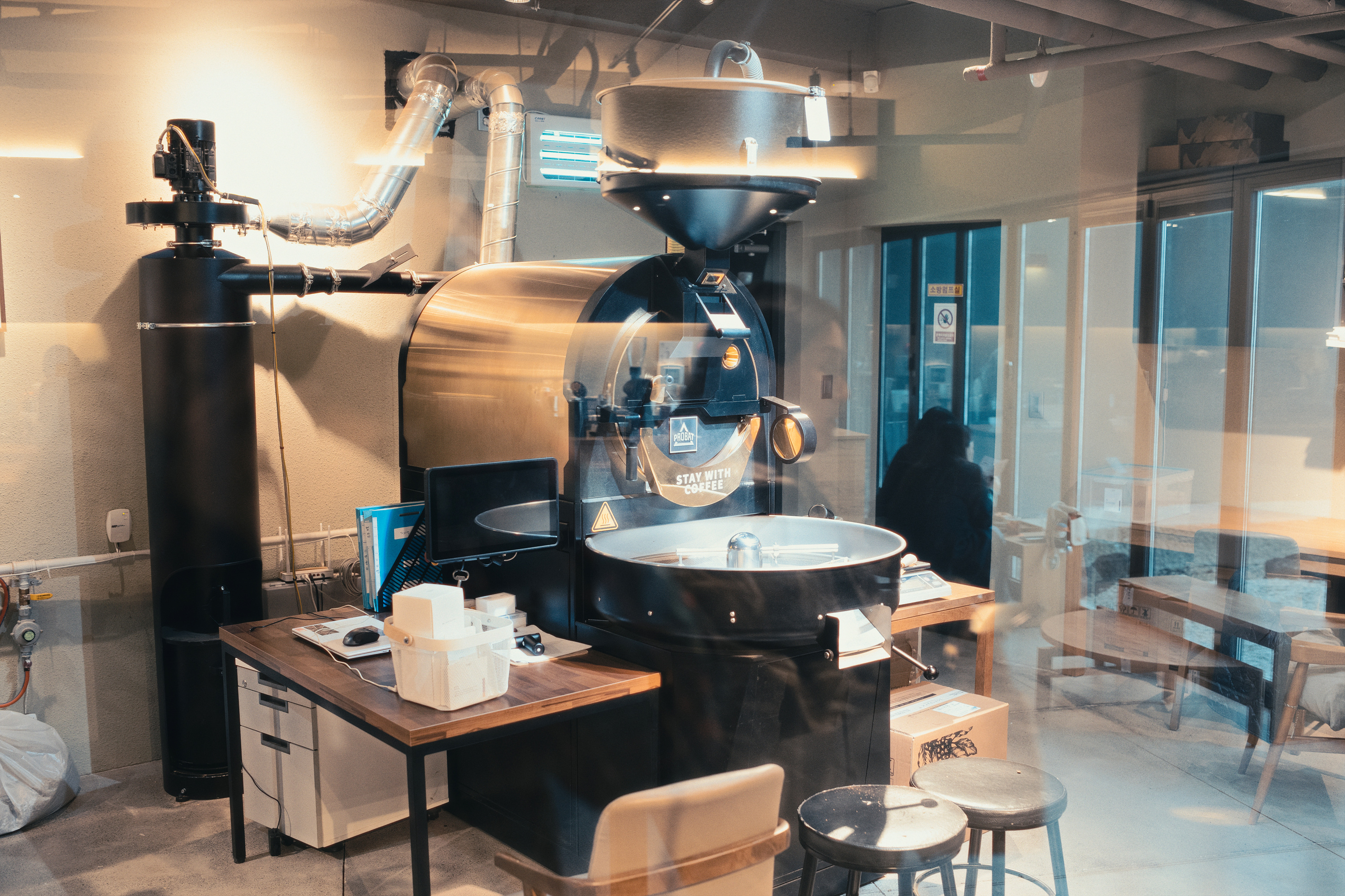로스팅 룸 안에는 메인 로스터와 소형 로스터, 그리고 샘플 로스터까지 총 세 대의 로스터가 자리를 잡고 있습니다. 번쩍거리는 메인 로스터는 ‘프로밧(Probat)’의 12kg 로스터입니다. 일반적으로 통용하는 로스터의 규격은 대체로 내부 탱크에 최대 몇 kg의 생두를 투입할 수 있냐를 기준으로 합니다. 12kg의 로스터는 매장에 두고 사용할 수 있는 가장 큰 규모에 속합니다.