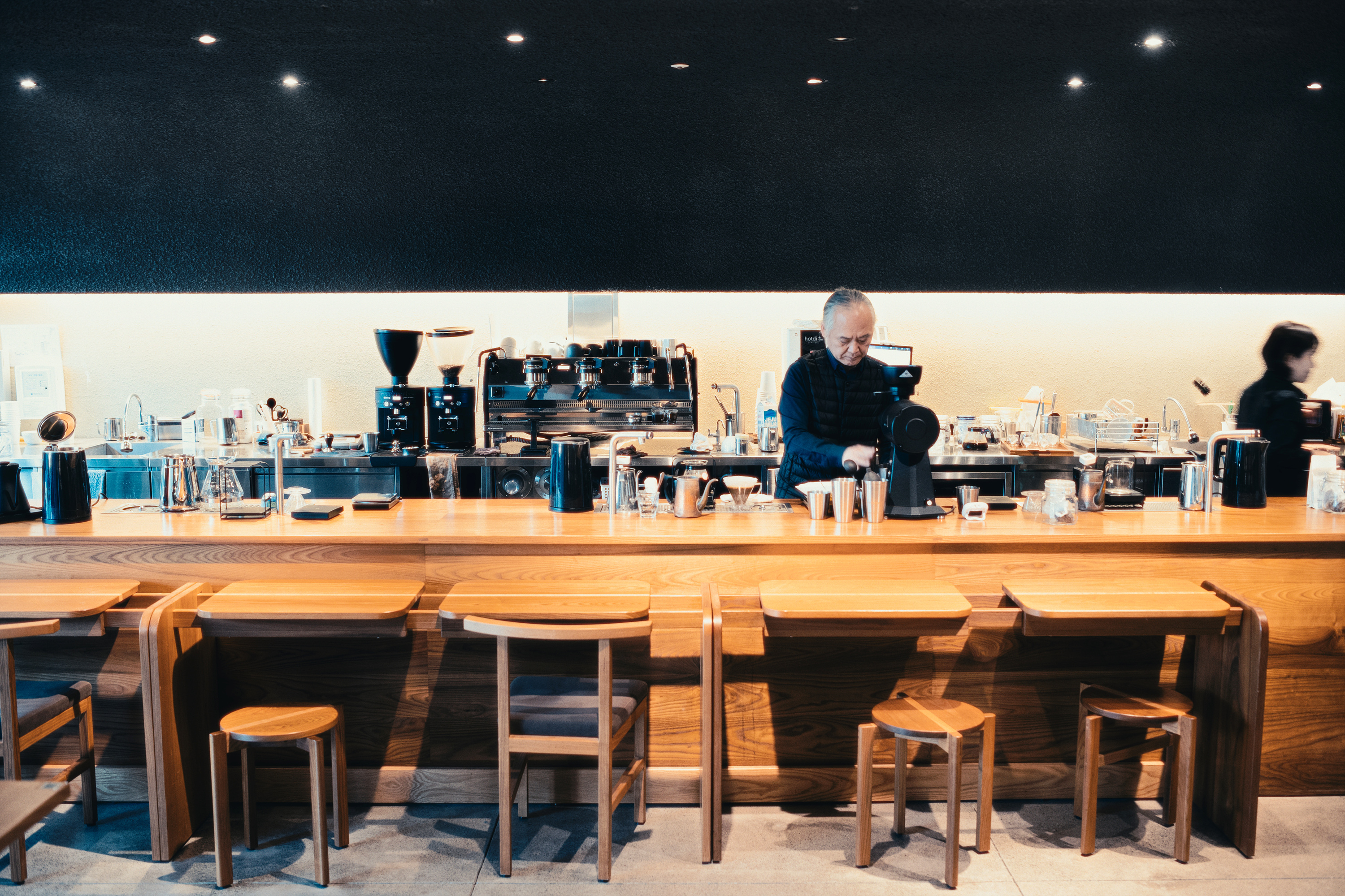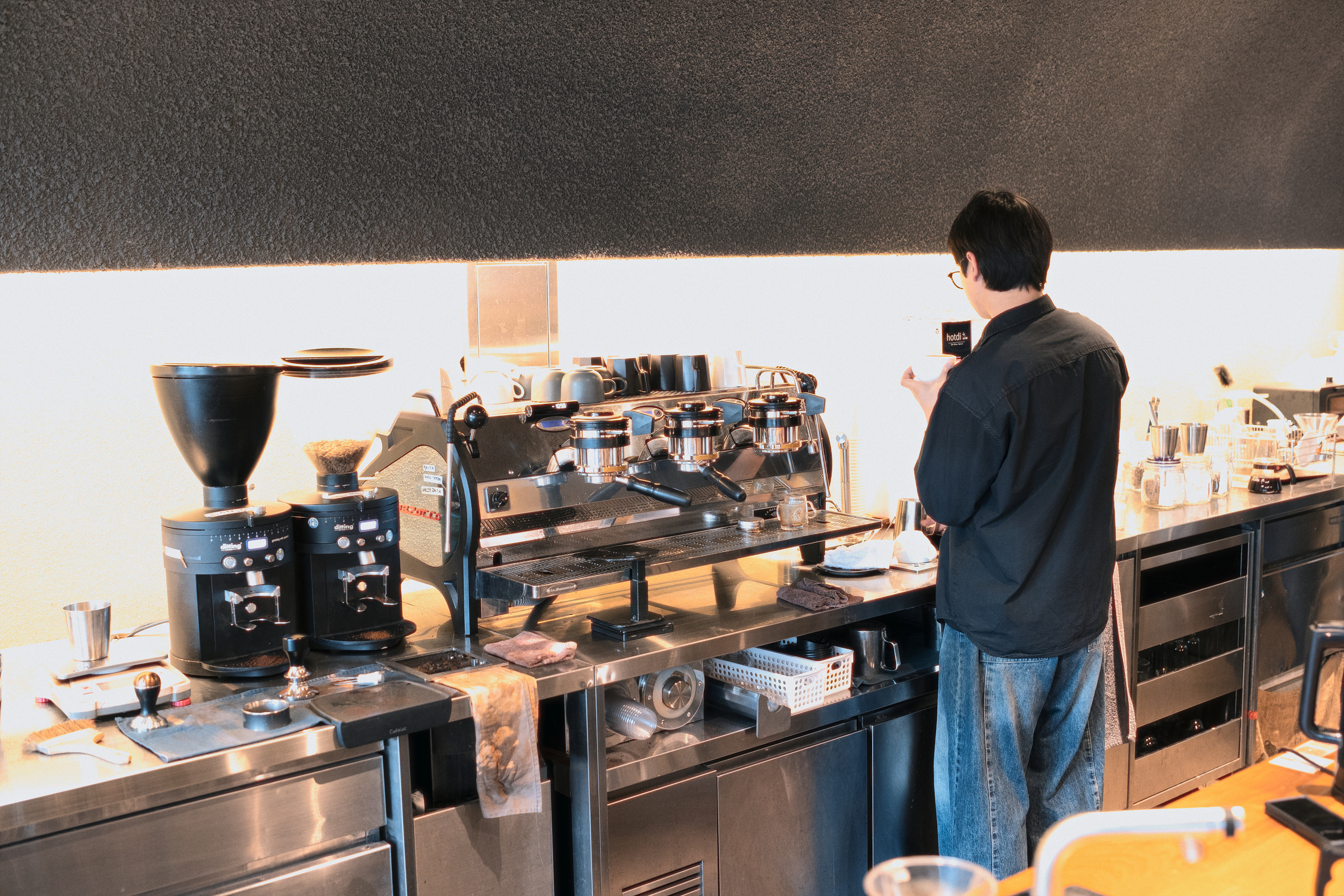 ‘말코닉(Mahlkönig)’ dml EK43 그라인더를 두 대씩 두고 부지런히 커피를 내리는 모습을 보니 브루잉 커피 전문점인 것 같지만, 뒤에 있는 에스프레소 머신은 범상치 않은 ‘라마르조꼬(La Marzocco)’의 ‘스트라다(Strada)’, 그것도 3그룹 모델입니다. 제주 대형 카페들이 관광지화(化)가 되면서 과시용으로 최고급 에스프레소 머신인 스트라다를 설치해둔 것을 어렵지 않게 볼 수 있는데, 다만 이게 고급=고성능이란 공식이 통용되지 않는다는 점입니다. 스트라다가 고성능 머신임에는 분명하지만 커피를 추출하는 바리스타의 역량에 따라 섬세하게 조절을 해야지 본연의 성능을 내는 머신이고, 그렇게 섬세하게 조절이 되기 때문에 고성능 머신인 것입니다.