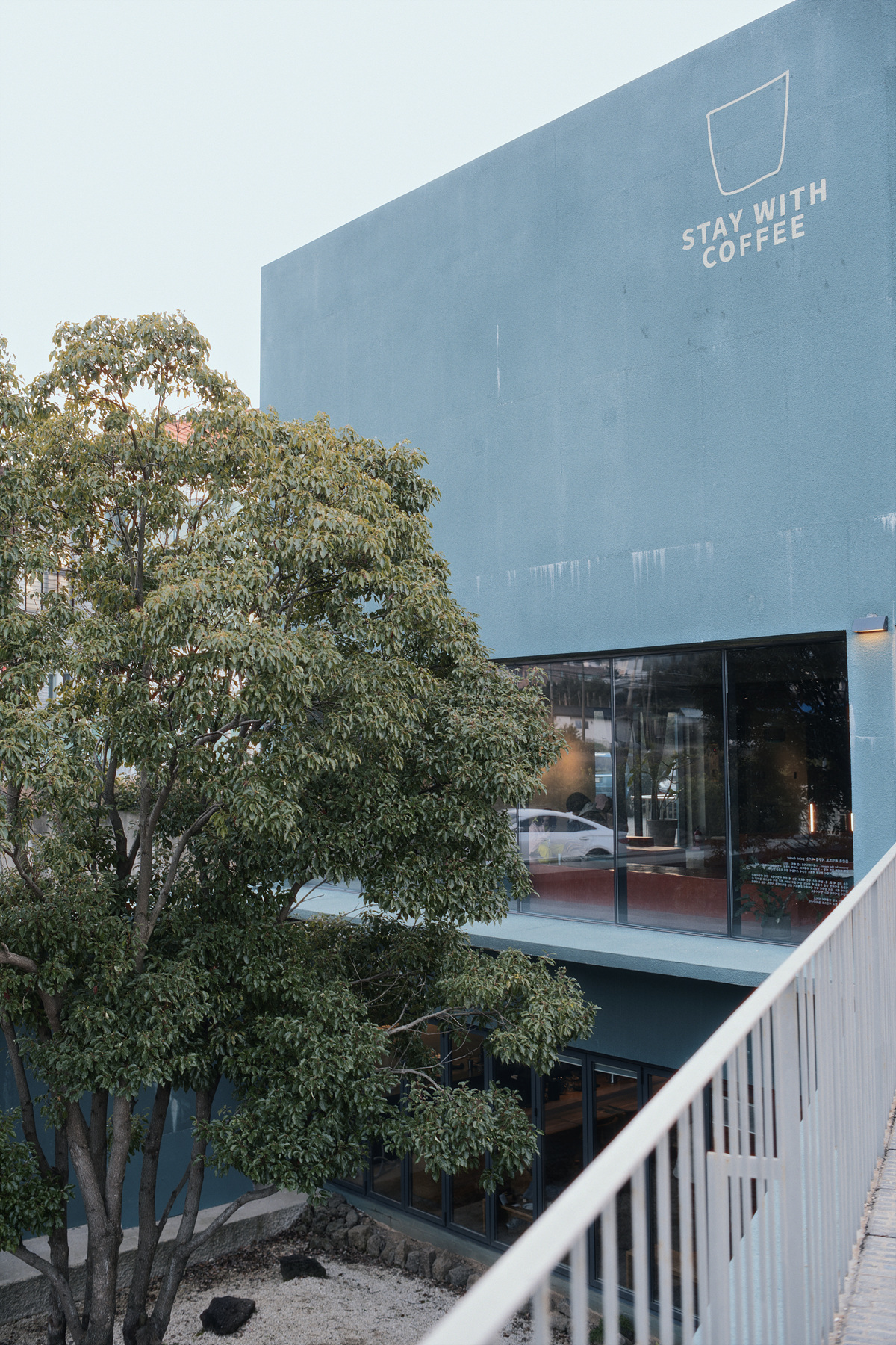 ‘스테이 위드 커피(Stay with Coffee)’도 주민들이 주로 거주하는 해안동 북서쪽, 전혀 의외의 장소에서 독특한 형태의 중정들과 여러 발코니로 이루어진 총 3층 규모, 꽤 거대한 단일 건축물 형태로 자리 잡고 있습니다. 차를 주차하고 내리니 근처 귤 밭 앞에서 작업 복장을 한 주민들 몇몇이 삼삼오오 모여 서로 대화를 주고받는 모습이 세련된 건축물과 대비를 이루며 새삼 정겹습니다.