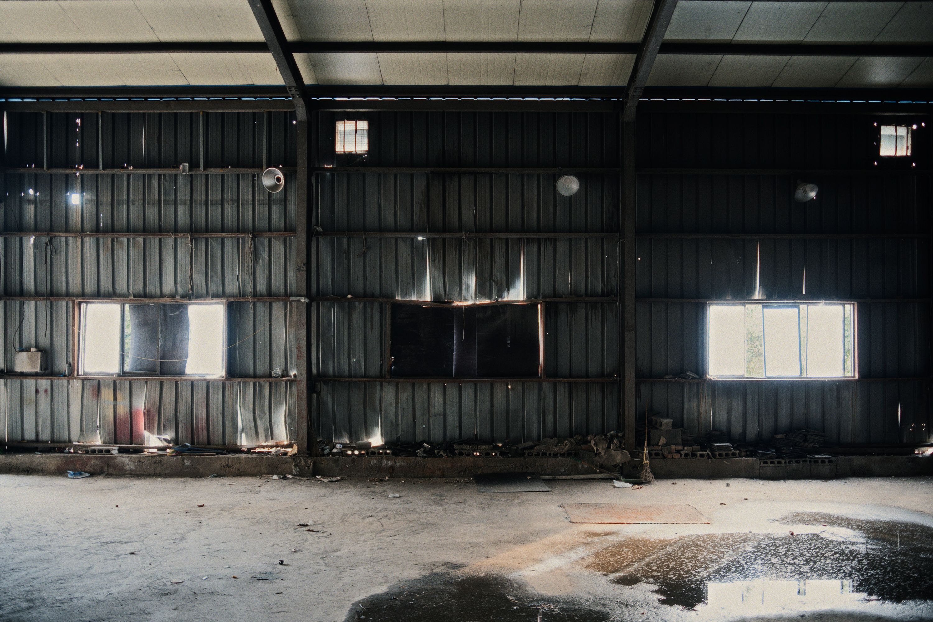 ‘왜 여기에 굴뚝이 있지?’라는 생각을 하며 수풀을 헤치고 들어가서야 발견한 폐허입니다. 폐허는 크고 반듯한 건축물이 있고 주변에 굴뚝과 부속 건물이 있는 구조였는데, 헐거운 판넬로 얼기설기 엮어있는 것을 보니 정밀한 기계를 만들어내는 공장은 아니었을 것으로 보입니다. 텅 비어 있는 내부에 어떤 기계들이 있었을지 전혀 가늠이 되진 않지만, 거대한 입구와 높은 천장을 보니 꽤 큰 트럭들도 내부까지 오고 갔을 것 같습니다. 굴뚝이 본 건물과 분리되어 있는 것을 보면 굴뚝이 있는 건물은 폐기물을 처리하는 용도였을 것이고, 본 건물은 아마도 재활용 자원을 처리하던 곳이 아닐까 하며 상상 회로에 전원을 넣어봅니다.