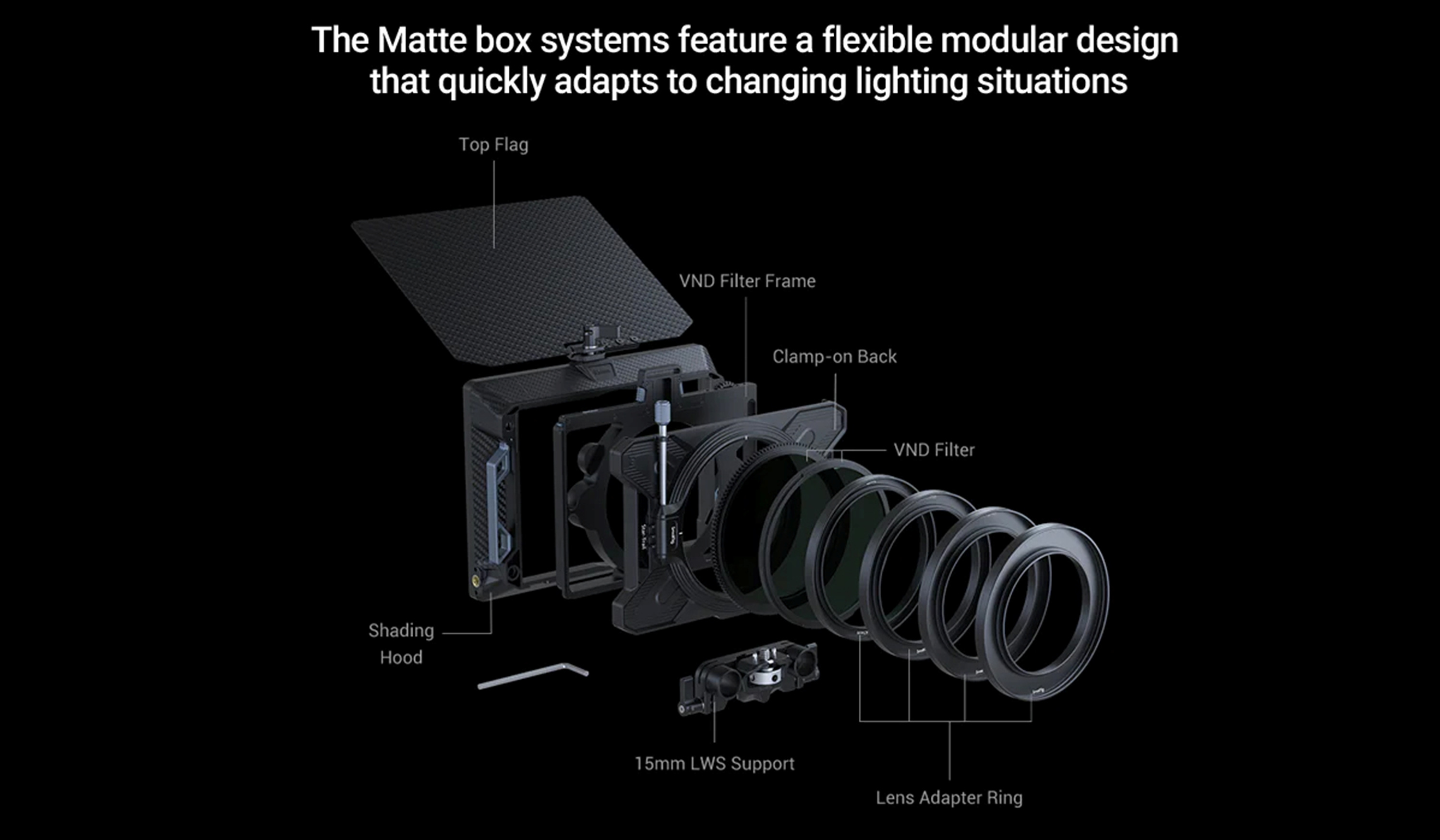 다행히 이러한 추세에 맞춰 매트 박스도 소형화되고 가벼운 형태로 진화하고 있습니다. 어댑터 없이 렌즈에 매트 박스를 직접 장착하는 것이 가능해졌고, 최근에는 가볍고 튼튼한 카본 소재를 적극적으로 활용하고 있습니다. 심지어 어떤 제품은 매트 박스 내부에 가변 ND를 장착해 기어를 통해 원격으로 노출을 조절할 수 있도록 제작했습니다. 거대하고 무거워서 대규모 현장이 아니면 막상 사용이 꺼려졌던 과거와 달리 요즘의 매트 박스는 다양한 방식으로 활용도를 높이고 있습니다.