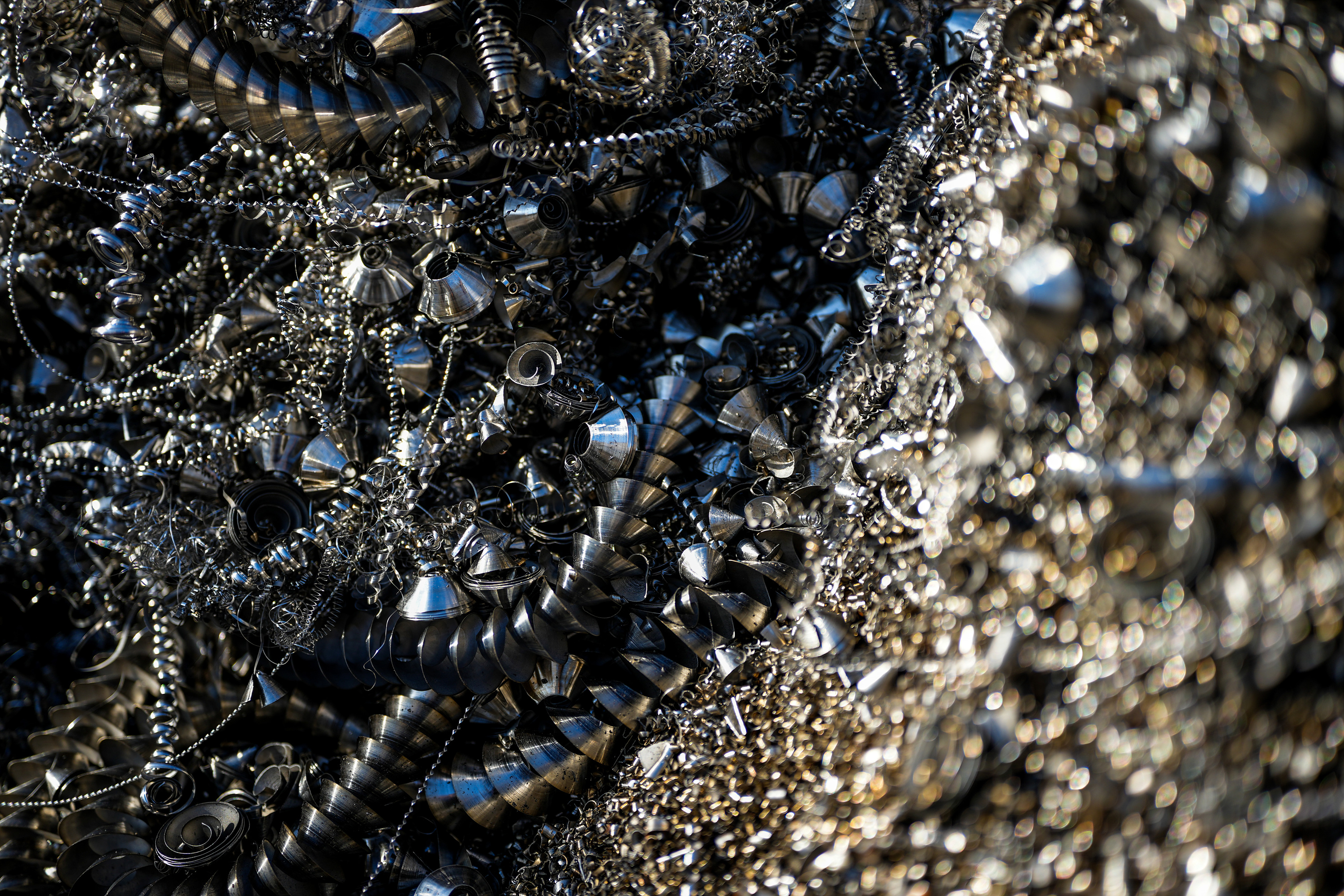 원뿔 모양이 겹쳐진 독특한 금속 부스러기. 날카로운 렌즈의 묘사력이 금속의 차가운 느낌을 더욱 강조합니다.