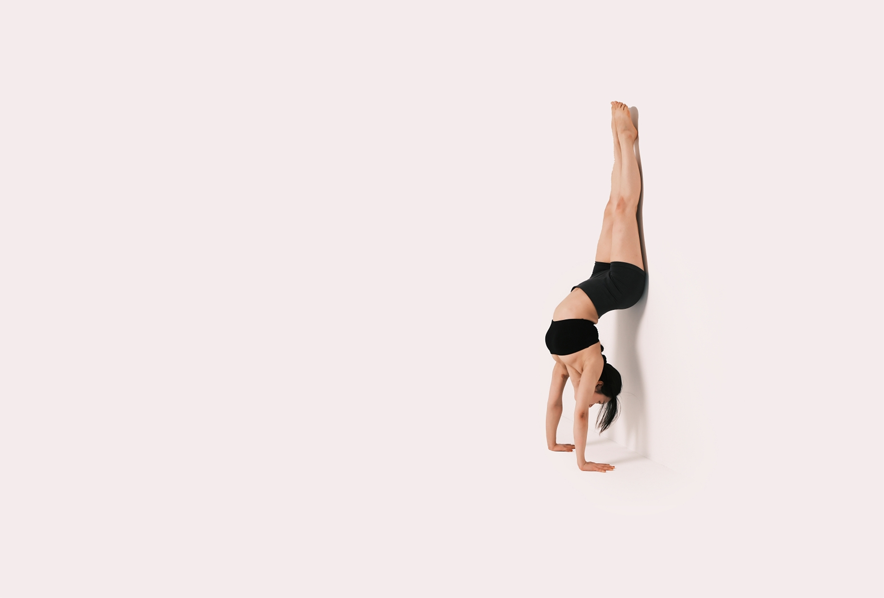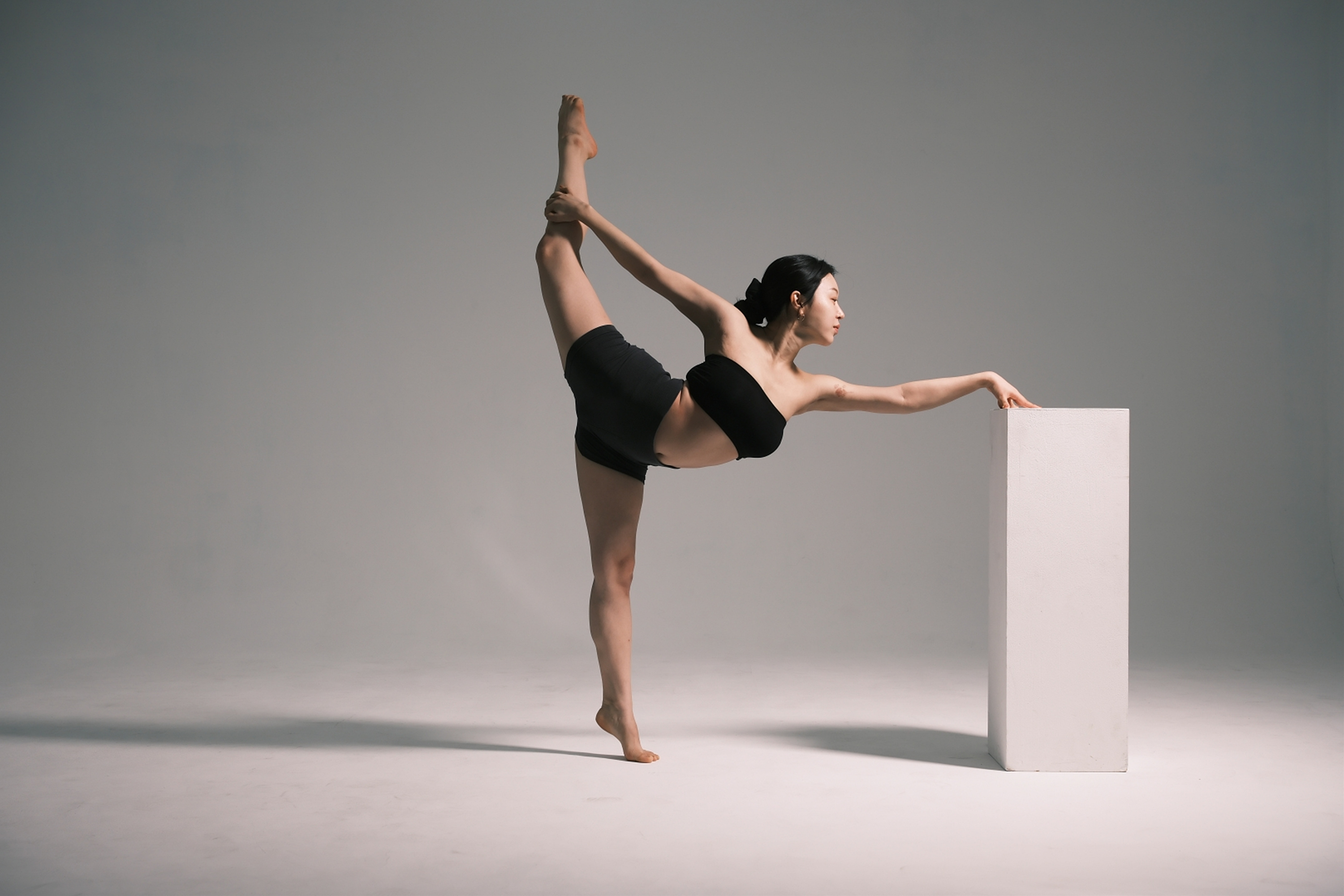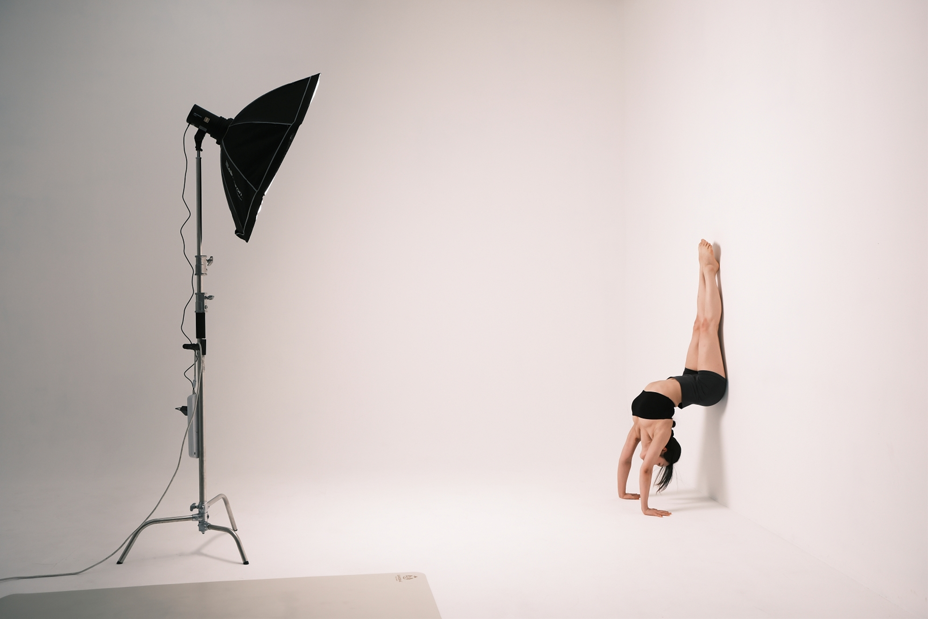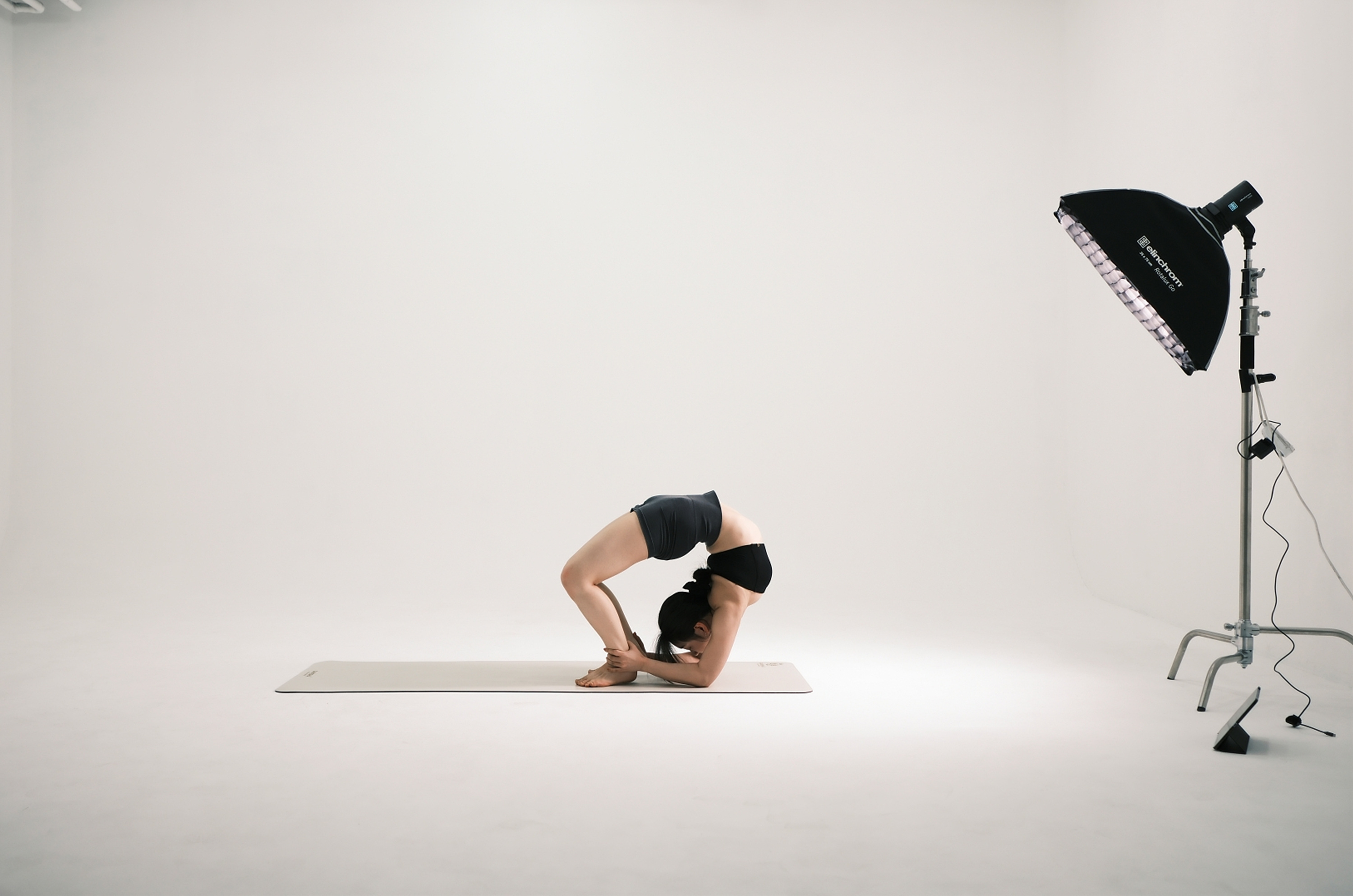 초반에 스튜디오의 규모가 클수록 좋다고 언급한 이유는 빛과 그림자 때문입니다. 규모가 좁은 스튜디오일 경우 피사체가 벽에 가깝게 있을 수밖에 없기 때문에 배경에 그림자가 발생하기 때문이죠. 반대로 스튜디오의 규모가 클 경우 빛과 그림자를 자유롭게 연출할 수 있습니다. 여기서 그림자는 피사체와 벽과의 거리에 영향을 받습니다. 피사체가 벽에 가깝게 있을수록 그림자가 명확해지고 벽에서 멀수록 그림자의 비중이 줄어듭니다. 특히 로우 앵글 촬영 시에는 그림자를 완전히 지울 수 있죠. 그런데 여기서 플래시를 측면에서 조사하고 피사체를 벽에서 더 멀게 설정할 경우 배경이 매우 어두워집니다. 조사되는 빛이 뒷배경까지 도달하지 못하기 때문이죠. 근육의 디테일이 중요한 바디 프로필이나 요가 촬영, 인물의 표정이 중요한 배우 프로필 촬영에서 이런 촬영 기법을 사용합니다.