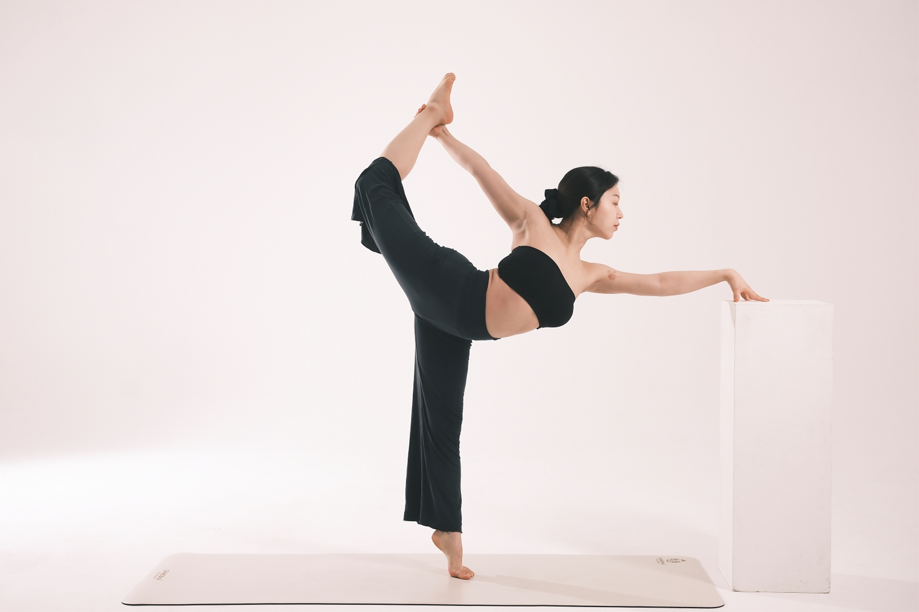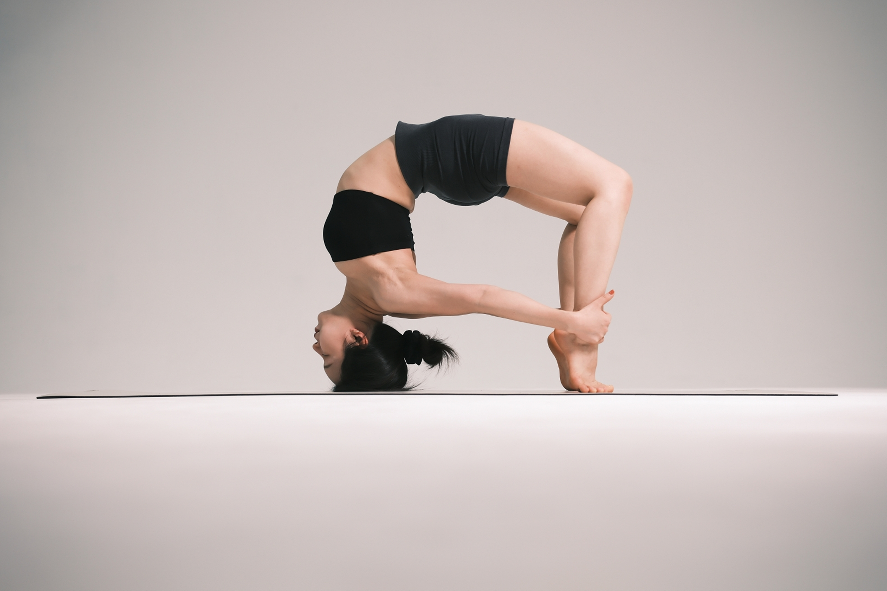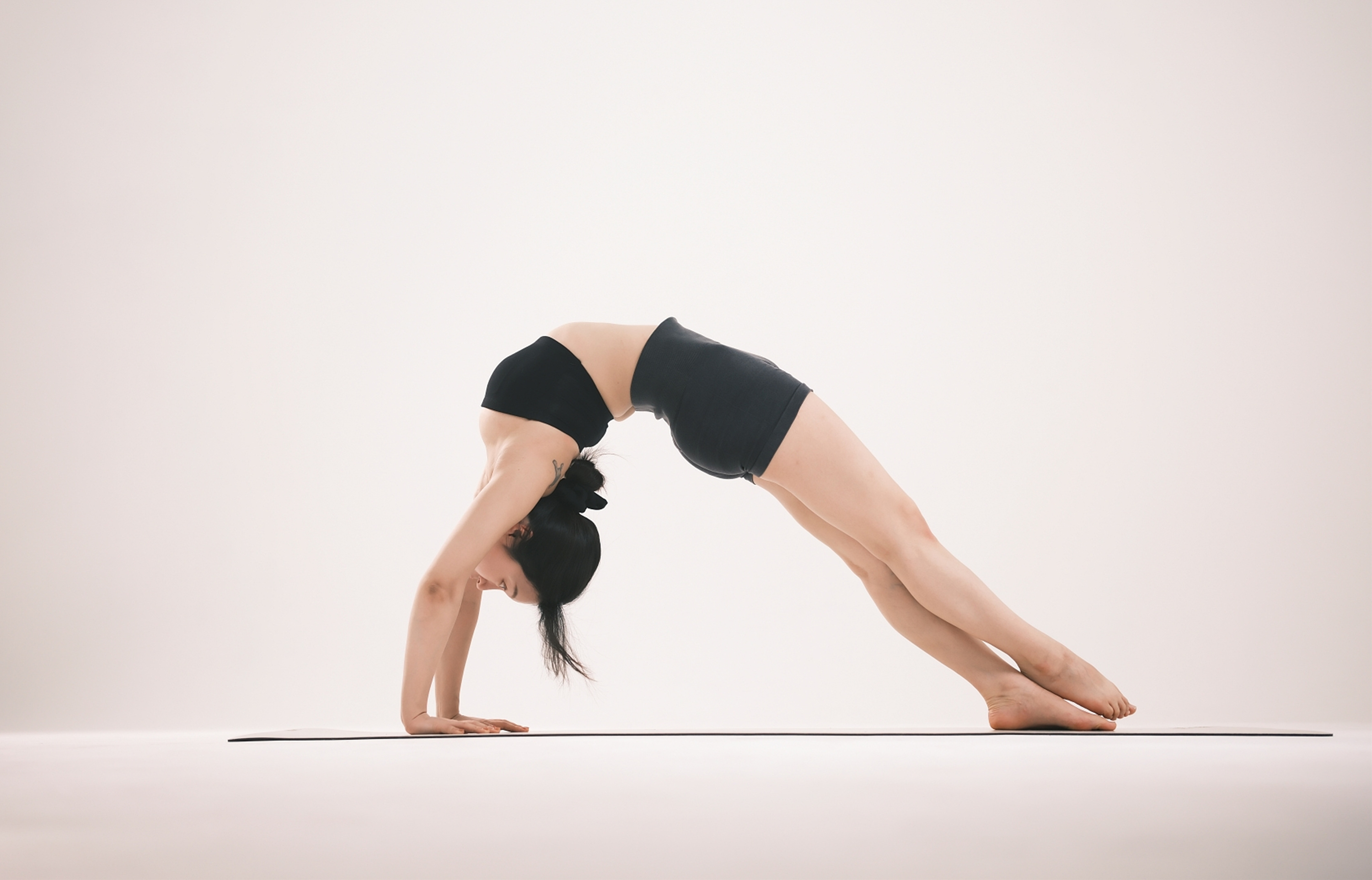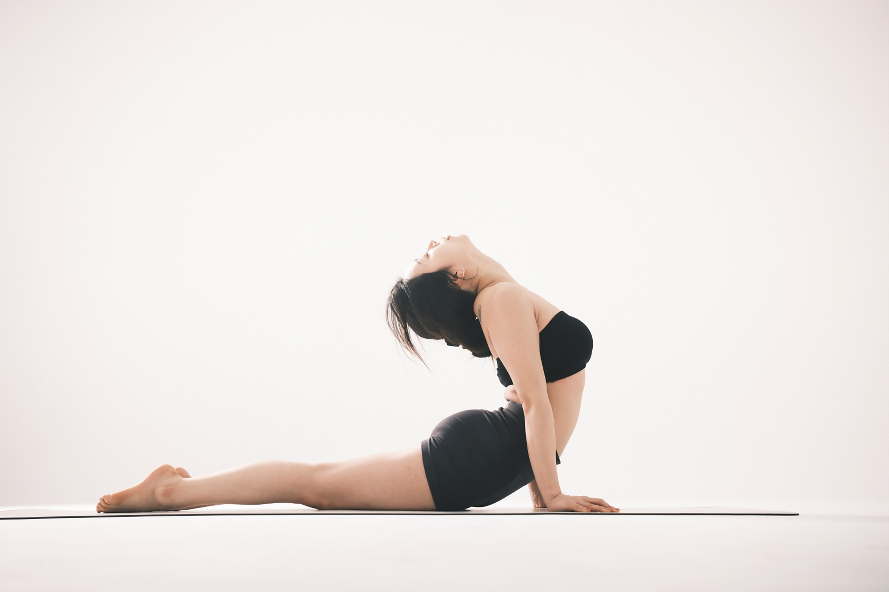 초반에 스튜디오의 규모가 클수록 좋다고 언급한 이유는 빛과 그림자 때문입니다. 규모가 좁은 스튜디오일 경우 피사체가 벽에 가깝게 있을 수밖에 없기 때문에 배경에 그림자가 발생하기 때문이죠. 반대로 스튜디오의 규모가 클 경우 빛과 그림자를 자유롭게 연출할 수 있습니다. 여기서 그림자는 피사체와 벽과의 거리에 영향을 받습니다. 피사체가 벽에 가깝게 있을수록 그림자가 명확해지고 벽에서 멀수록 그림자의 비중이 줄어듭니다. 특히 로우 앵글 촬영 시에는 그림자를 완전히 지울 수 있죠. 그런데 여기서 플래시를 측면에서 조사하고 피사체를 벽에서 더 멀게 설정할 경우 배경이 매우 어두워집니다. 조사되는 빛이 뒷배경까지 도달하지 못하기 때문이죠. 근육의 디테일이 중요한 바디 프로필이나 요가 촬영, 인물의 표정이 중요한 배우 프로필 촬영에서 이런 촬영 기법을 사용합니다.
