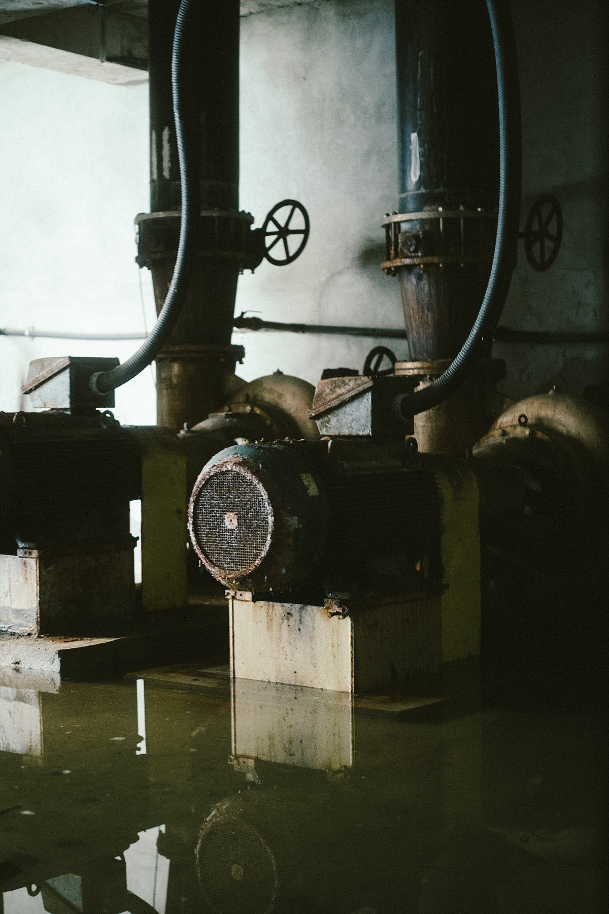지하 2층은 발목까지 물이 차있습니다. 지하 1층과 2층의 신기한 점이라면 거대한 기계 장치가 그대로 남아있다는 것입니다. 이런 폐허의 대부분은 결국에는 유지도 철거도 할 수 없고, 금전적인 여러 사정이 겹쳐있는 경우가 많기에 돈이 조금이라도 될 만한 것들은 모두 이미 사라져있기 마련입니다.