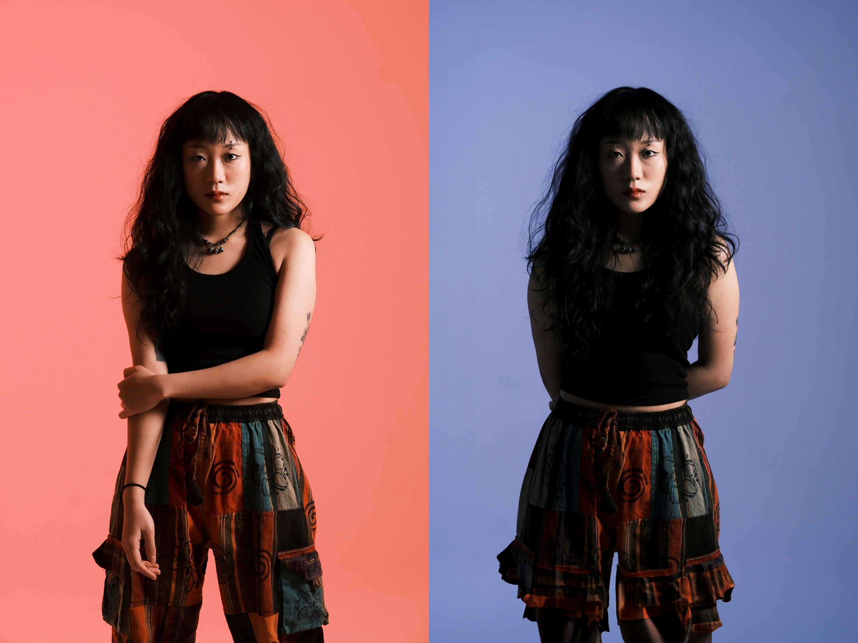 이번에는 두 개의 플래시에 다른 색상의 OCF 돔을 장착하여 피사체에 조사해 봅니다. 당연한 결과지만 좌우에 다른 색감이 연출되어 컨셉트가 강한 촬영에 적합하다는 느낌을 받습니다. 이런 류의 촬영은 주로 스릴러나 공포영화 포스터에 사용되곤 하죠. 주의할 점은 모든 색이 조화를 이룰 수는 없기 때문에 보색 관계를 생각하여 컬러를 선택하는 것이 중요합니다.