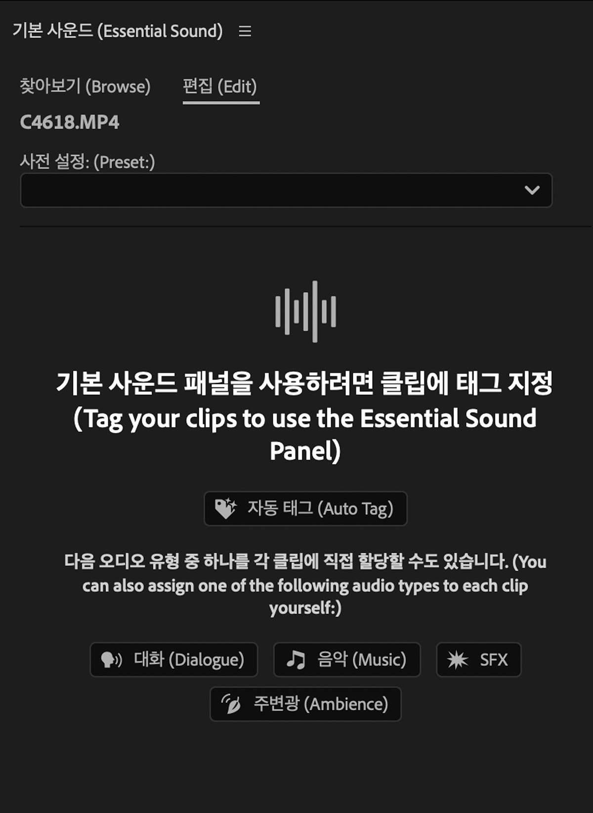 오른쪽의 기본 사운드(Essential Sound) 패널을 보면 선택한 영상 클립의 유형을 지정하라고 나옵니다. 자동 태그를 누르면 프리미어 프로가 알아서 분석하여 정하지만 정확히 하기 위해서는 아래 네 가지 중에 선택하는 것이 좋습니다.